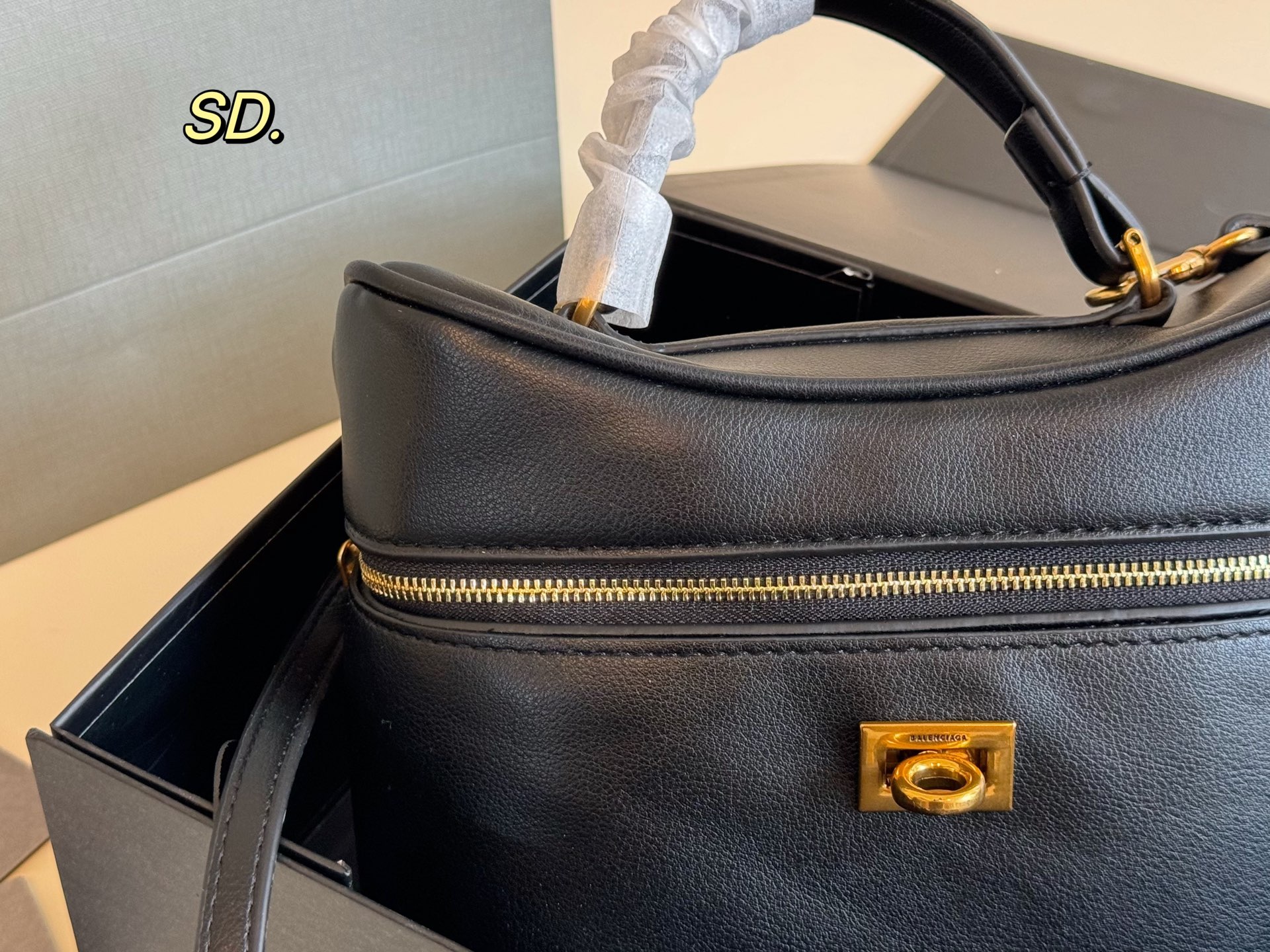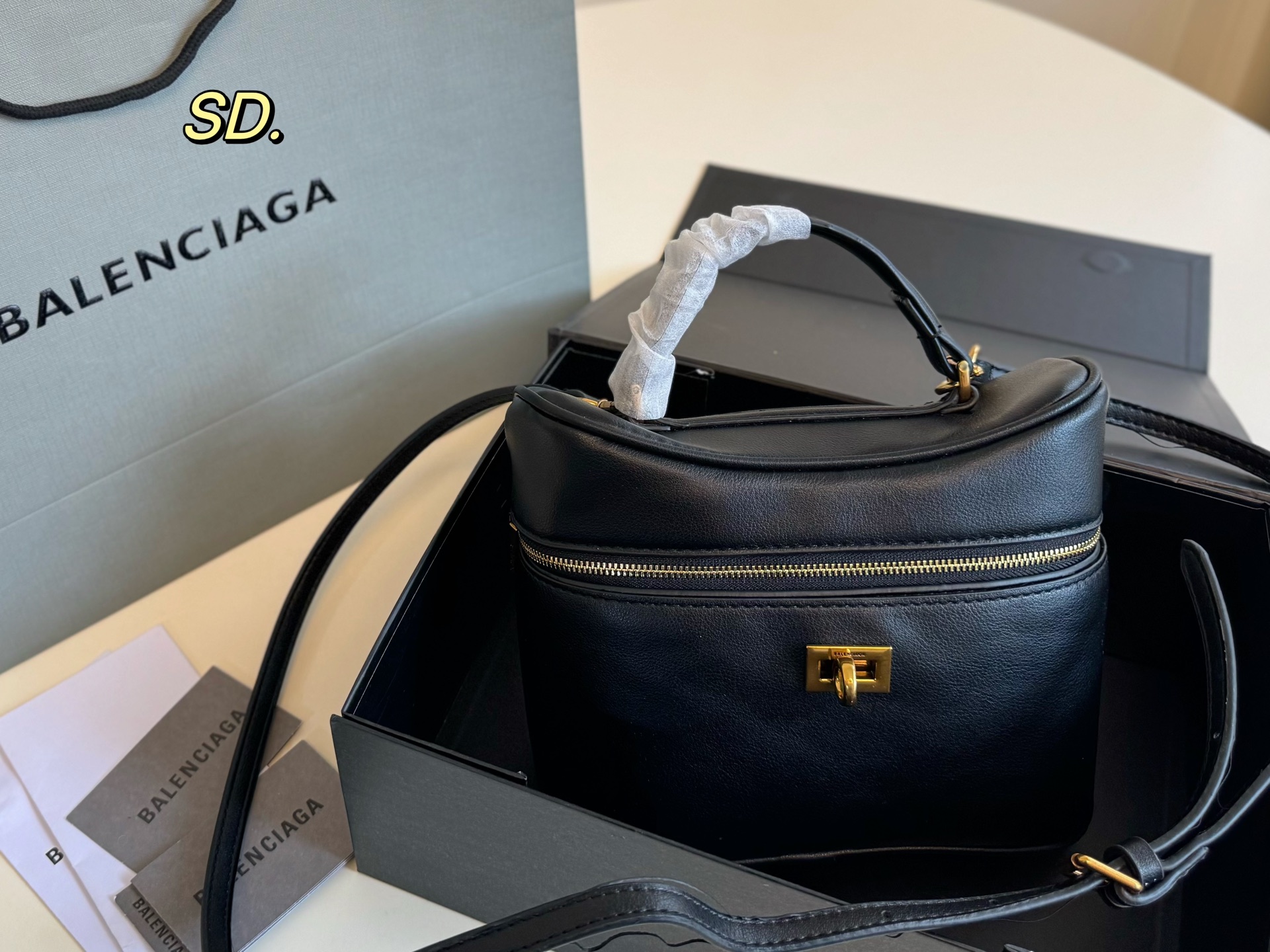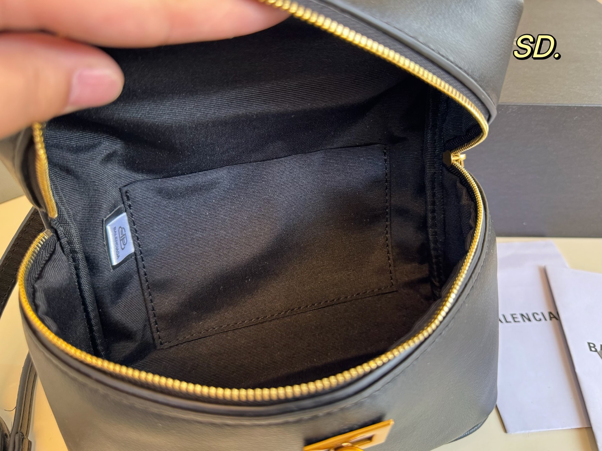 バレンシアガのミニポーチは、高級感あふれるブラックの本革を使用しています。 そのスムーズな質感と、ゴールドのジッパー、そして特徴的なロックが、洗練された印象を与えます。