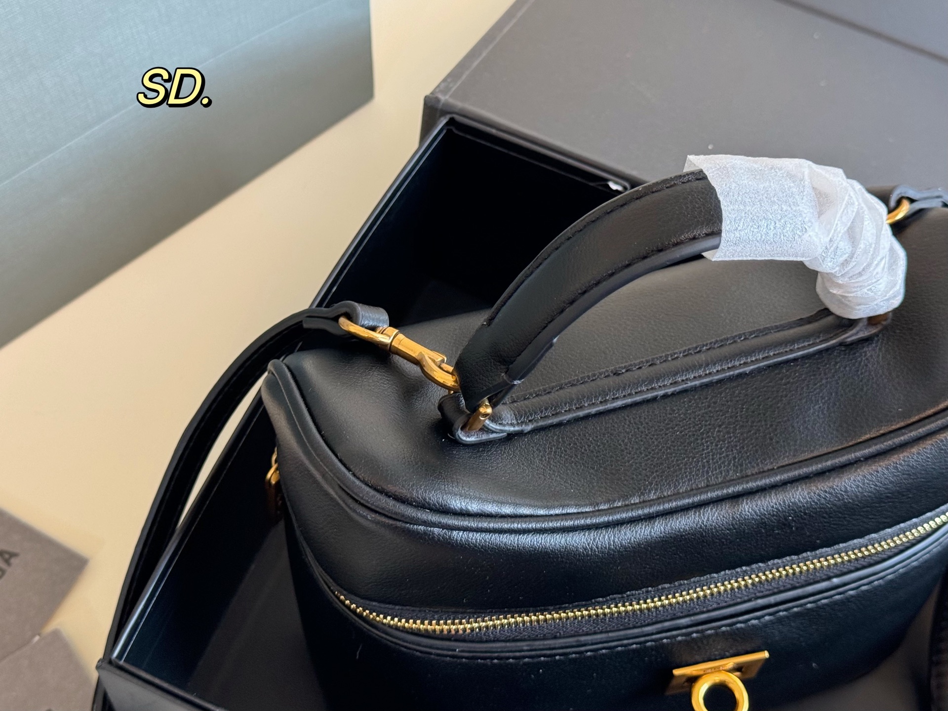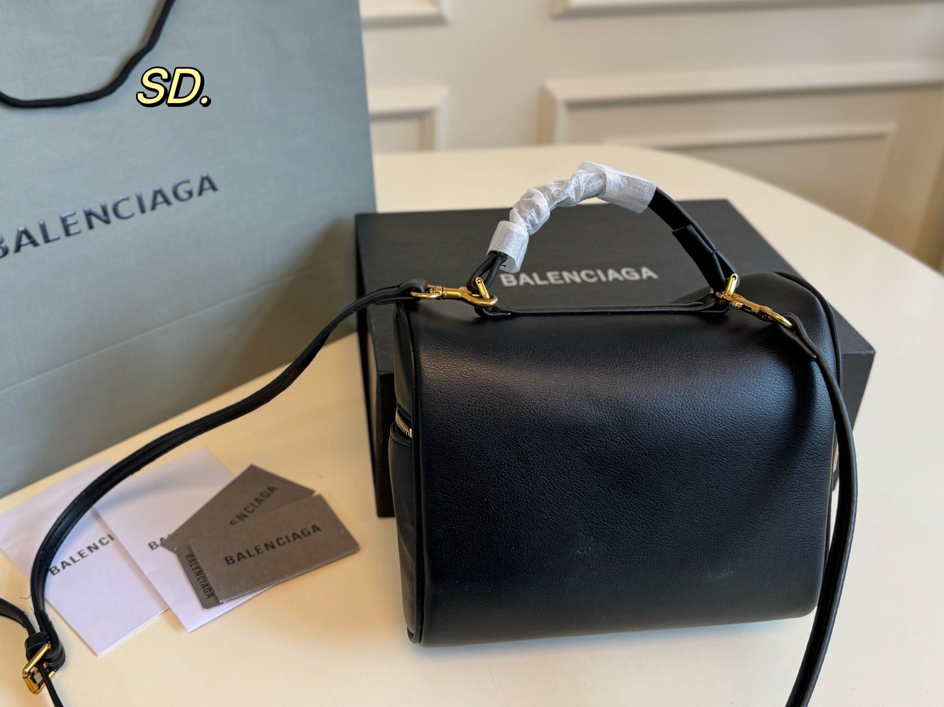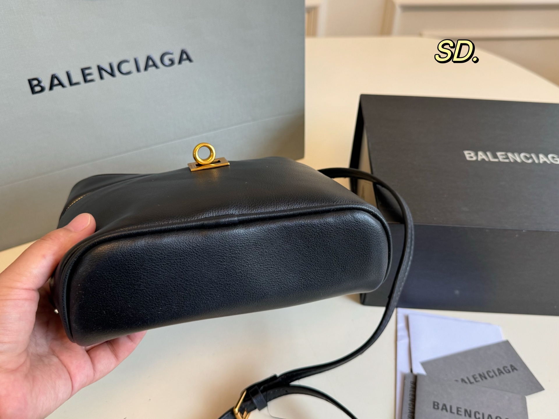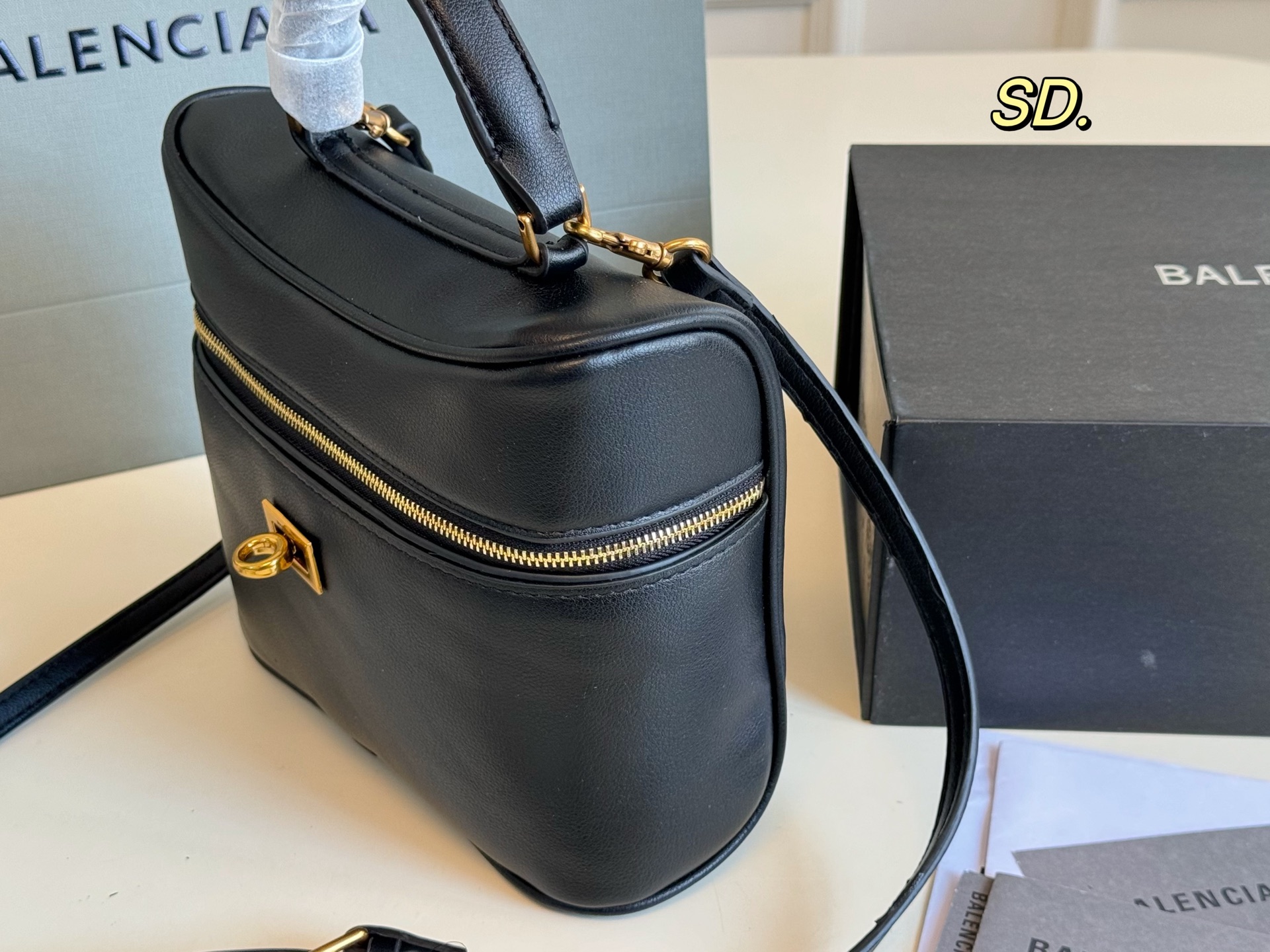 バレンシアガのミニポーチは、高級感あふれるブラックの本革を使用しています。 そのスムーズな質感と、ゴールドのジッパー、そして特徴的なロックが、洗練された印象を与えます。
