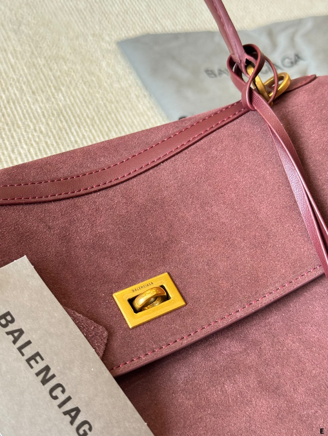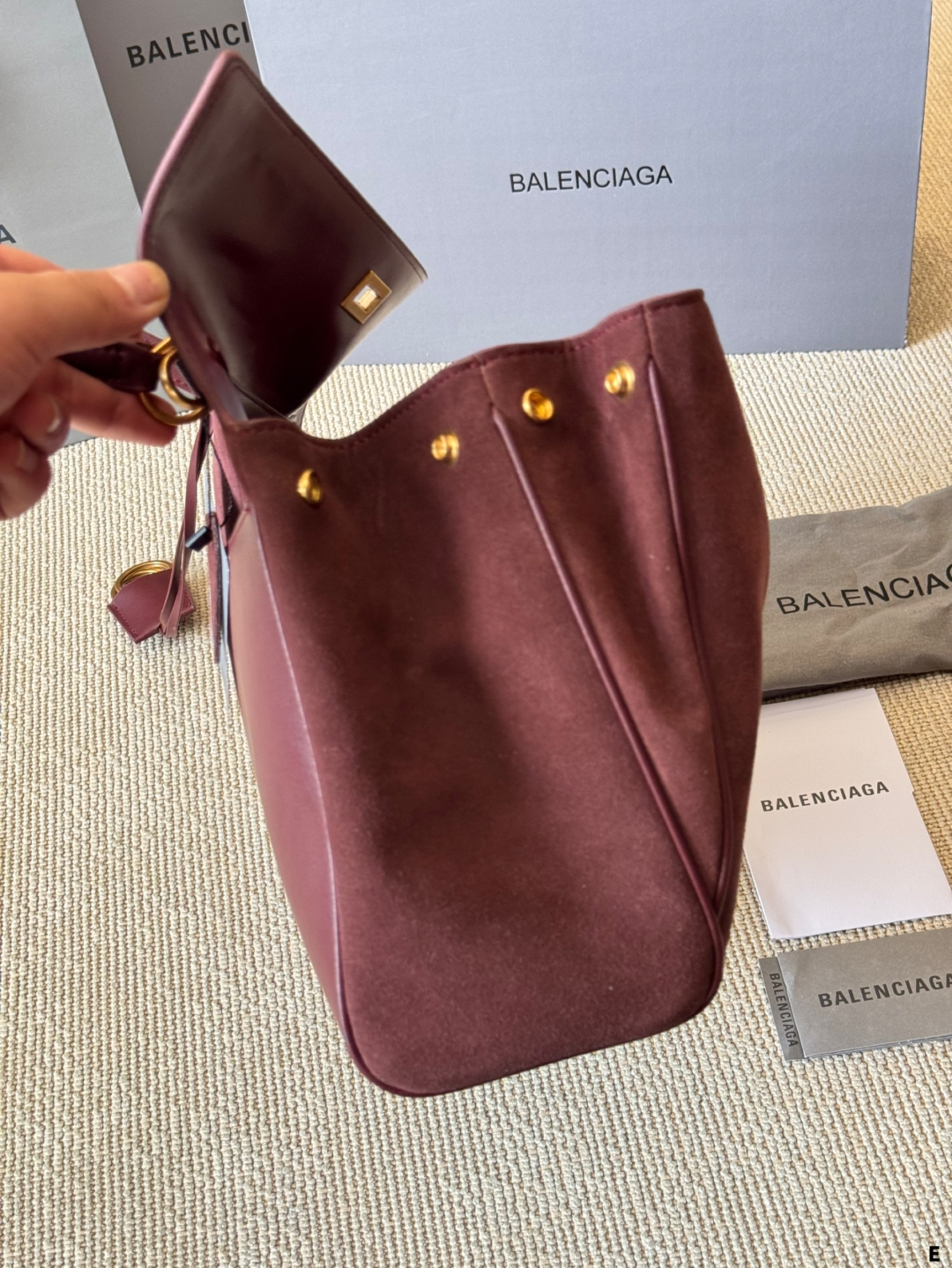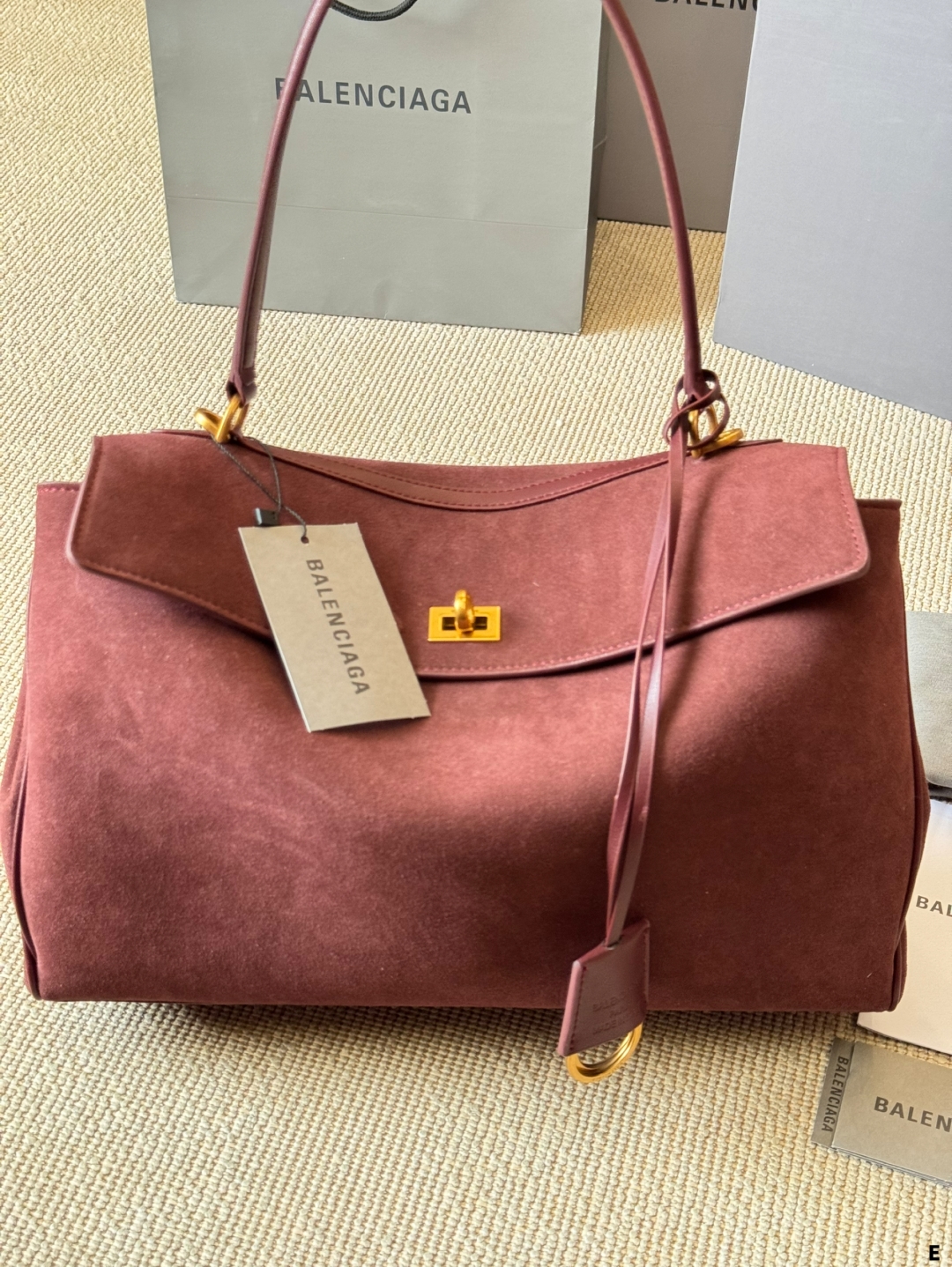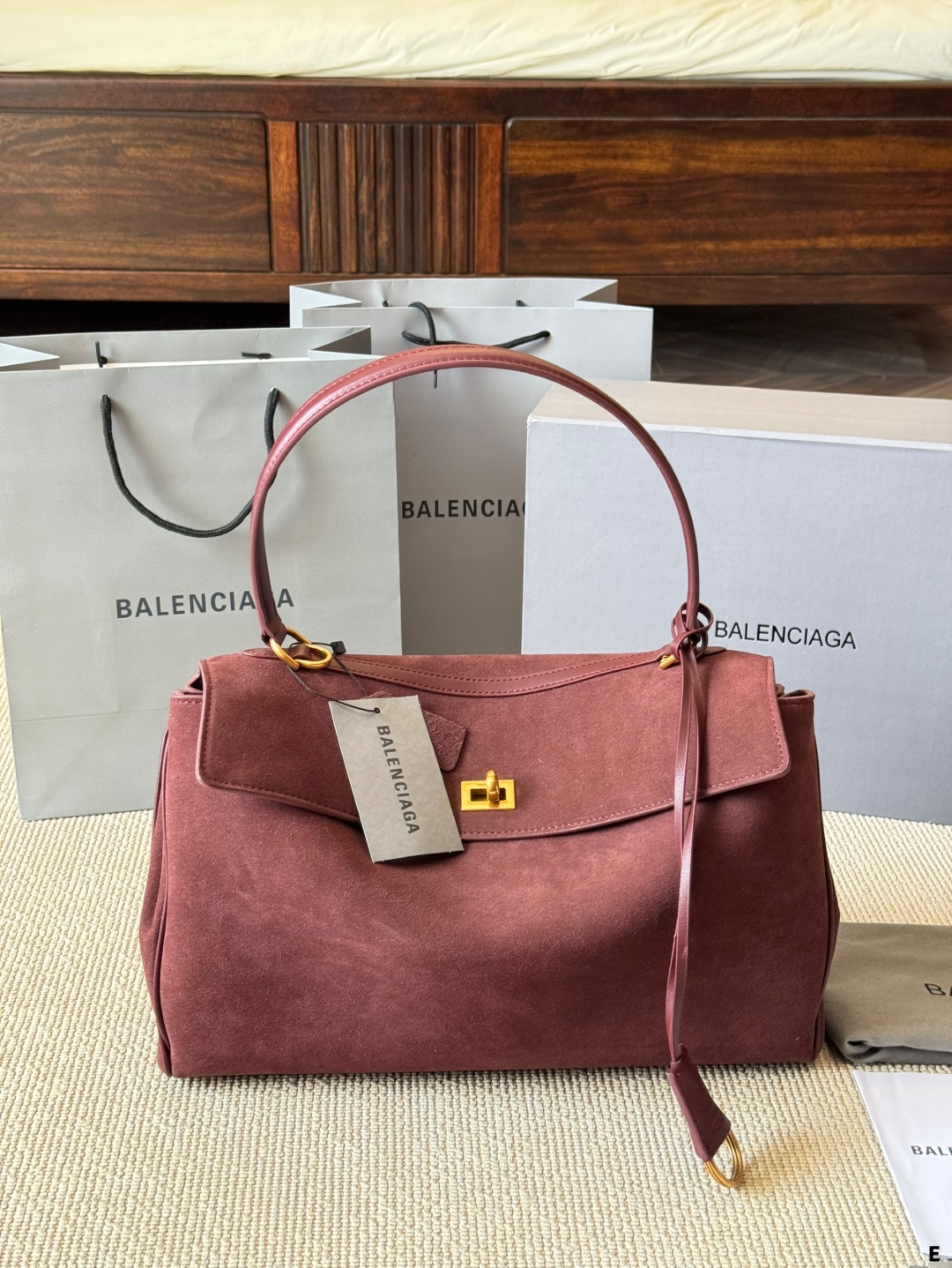 このバレンシアガのトートバッグは、マーロンカラーのスエード素材が特徴的で、高級感と柔らかな質感が漂います。
