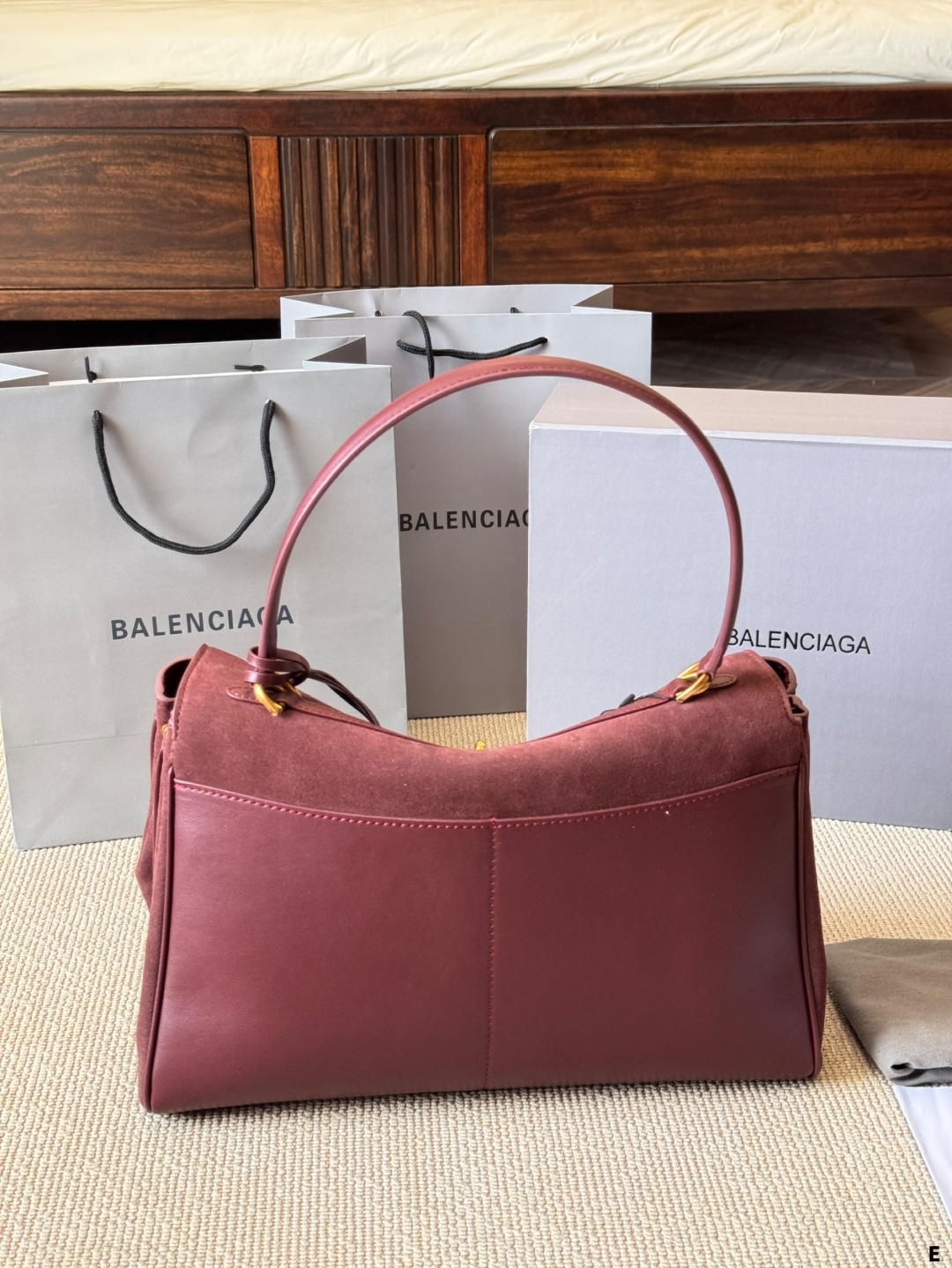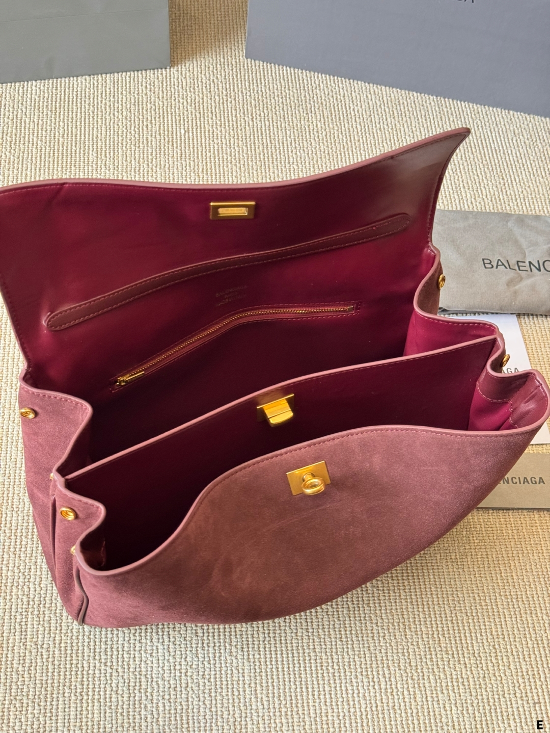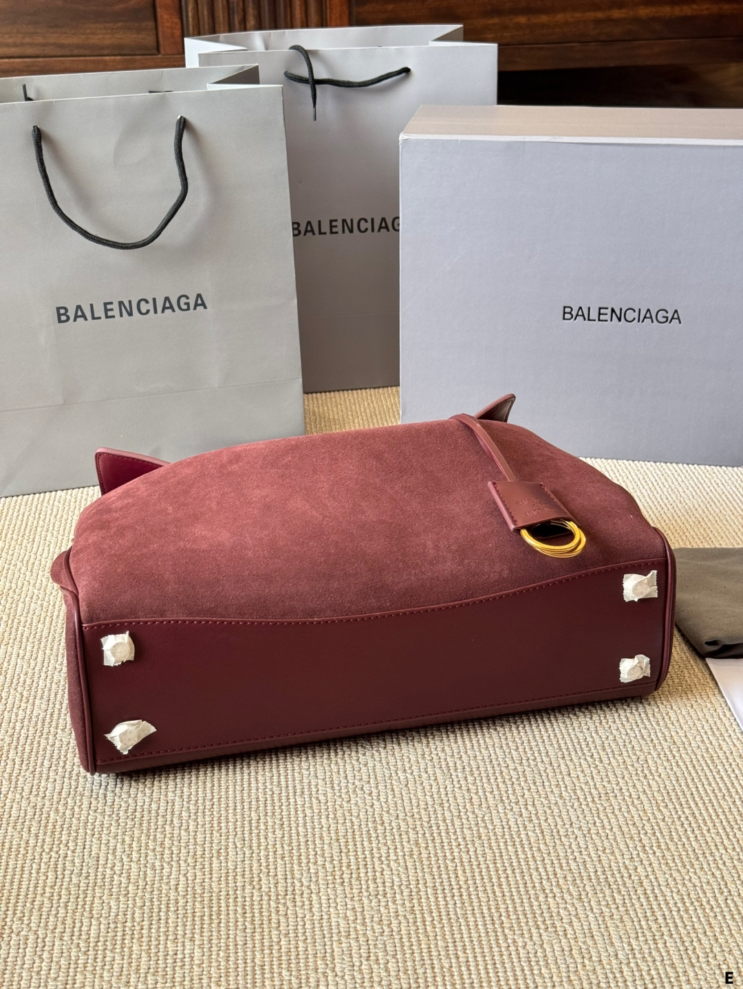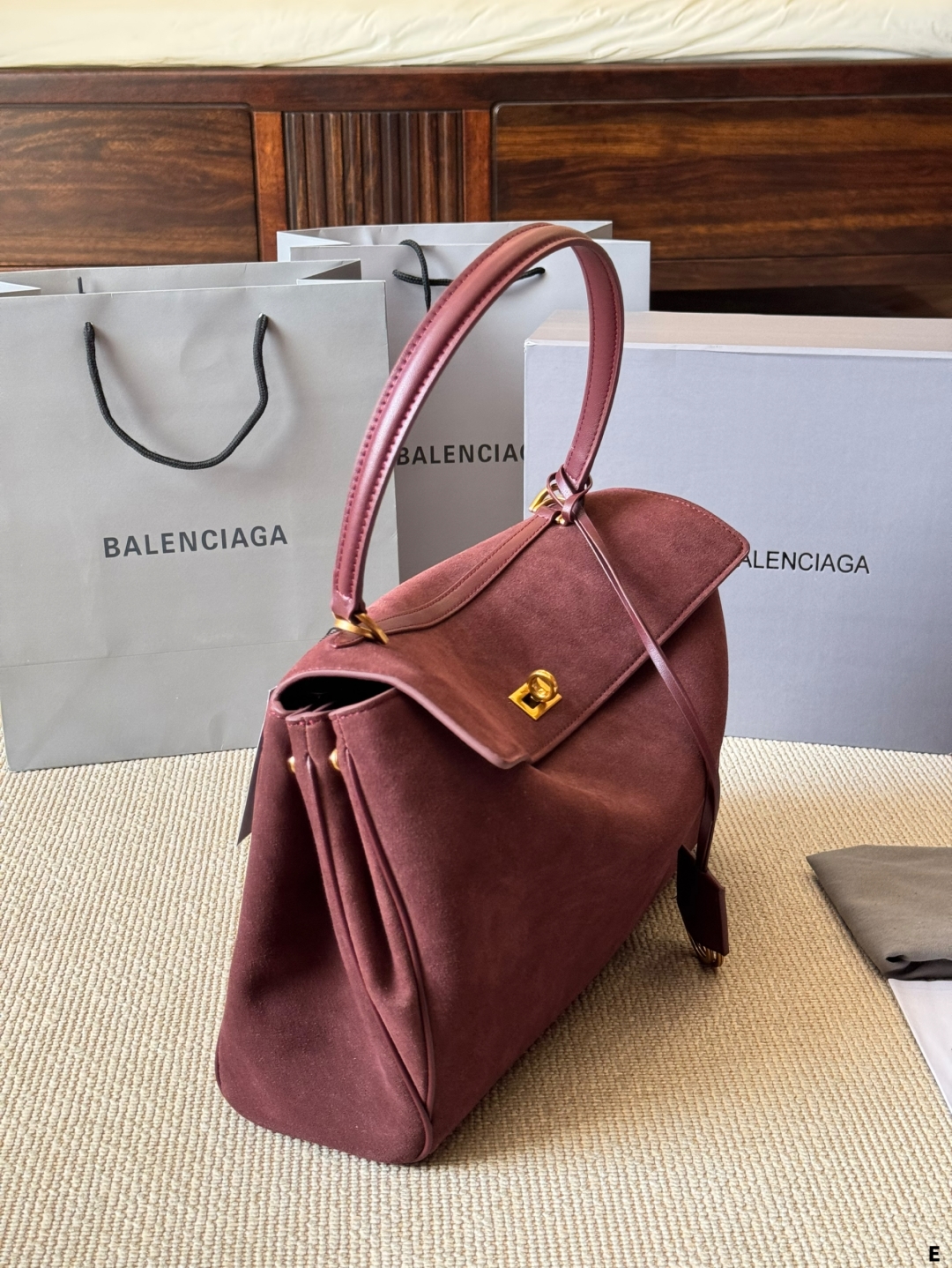 このバレンシアガのトートバッグは、マーロンカラーのスエード素材が特徴的で、高級感と柔らかな質感が漂います。