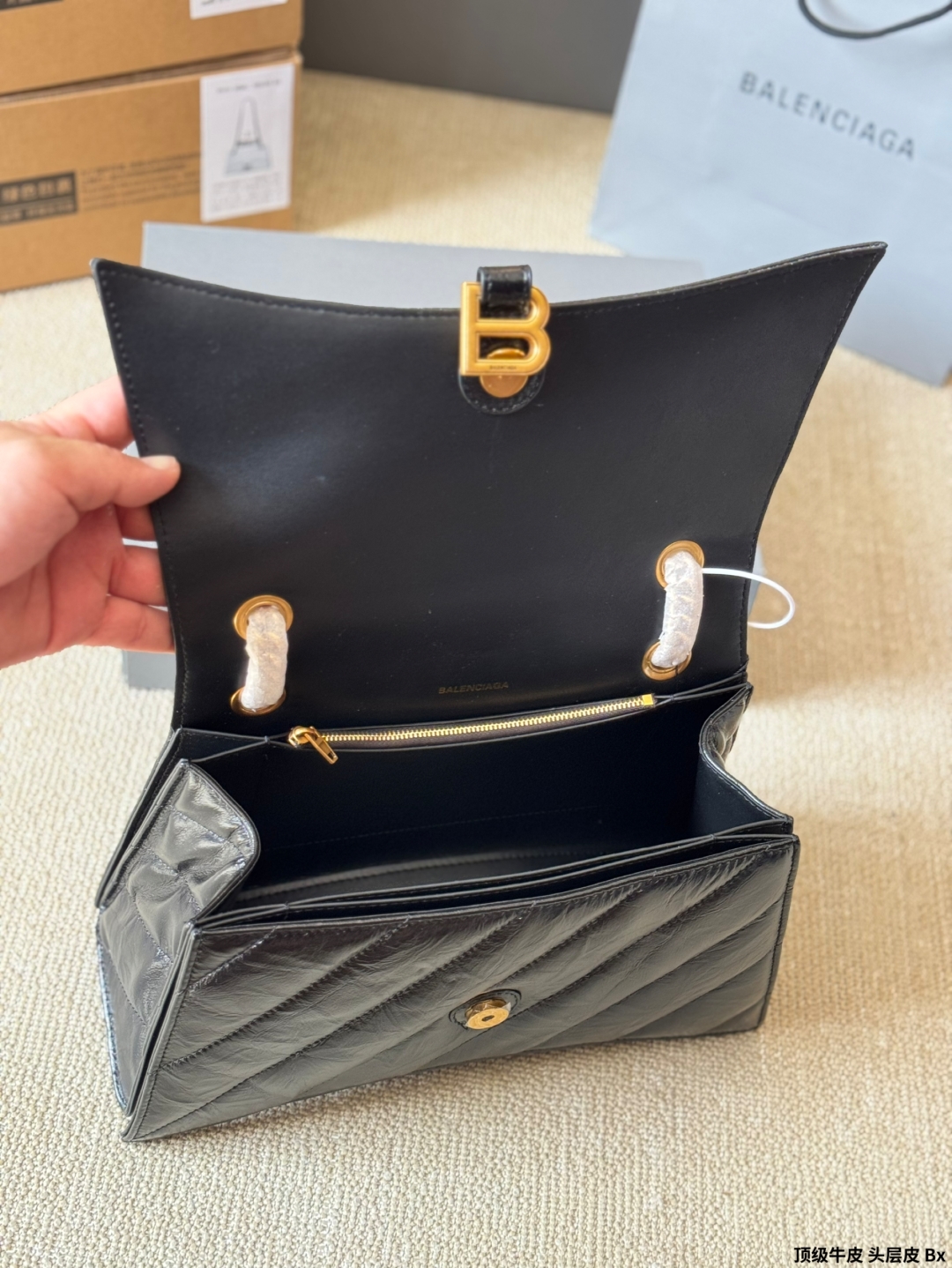高級な頭層牛革を使用し、特徴的なクッションステッチと「B」ロゴが際立つデザインです。