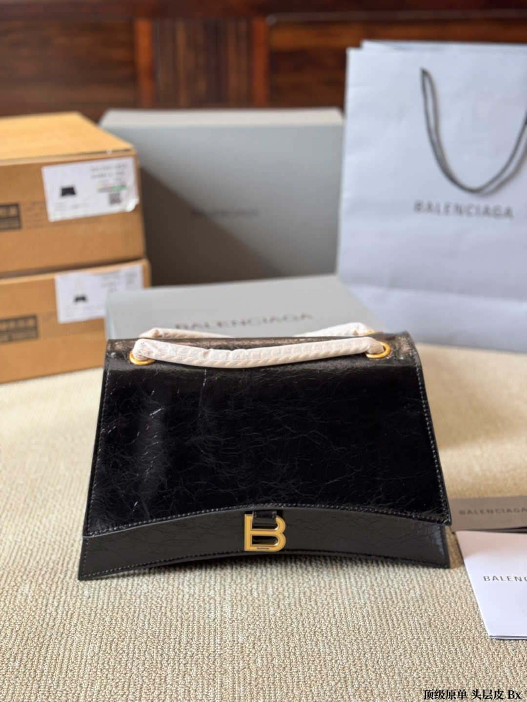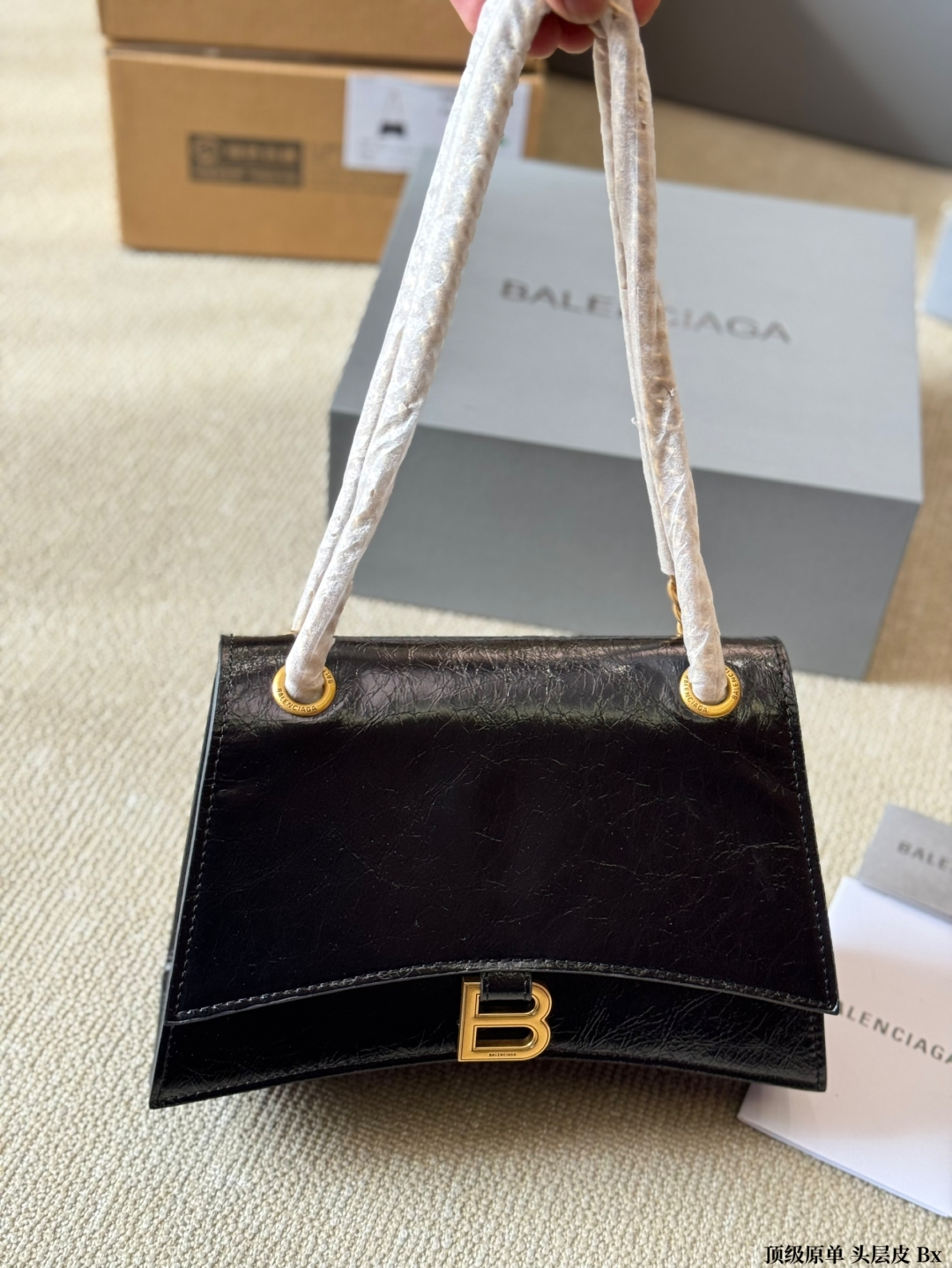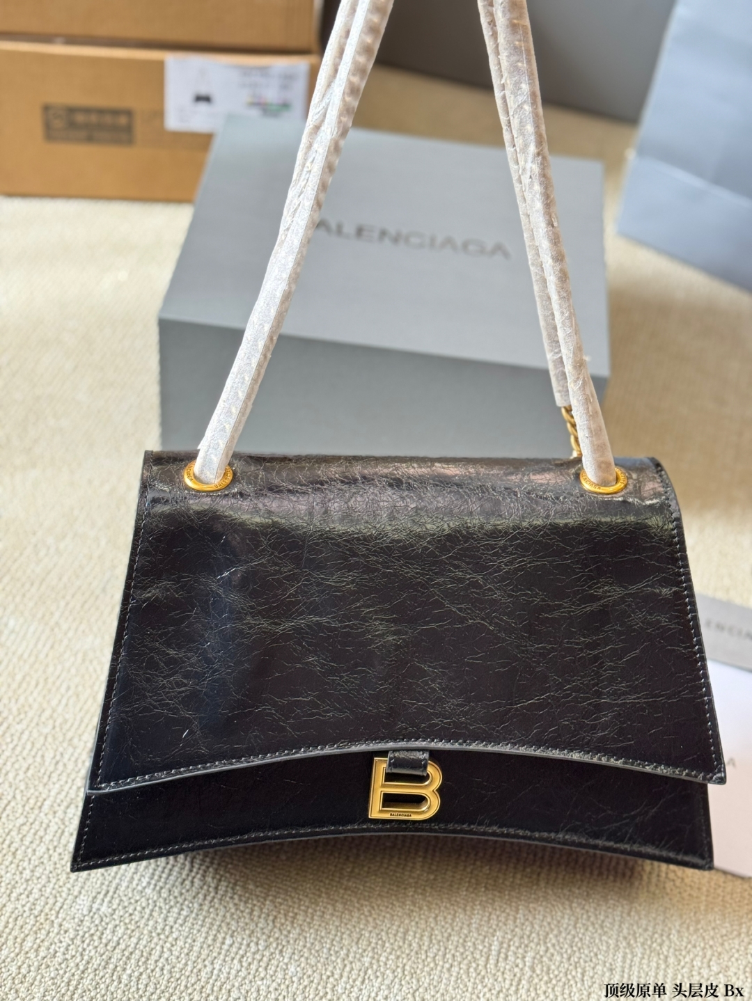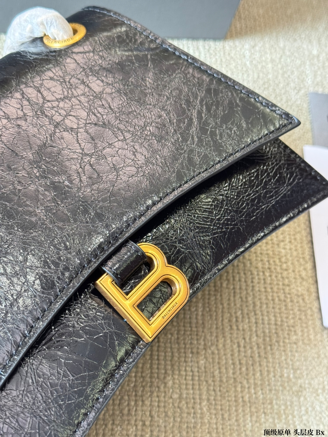 バレンシアガのこのバッグは、黒色のレザーを使用しており、独特なシワ加工が施された質感が特徴です。 フロントには大きなゴールドの「B」ロゴがアクセントとなり、スタイリッシュな印象を与えます。