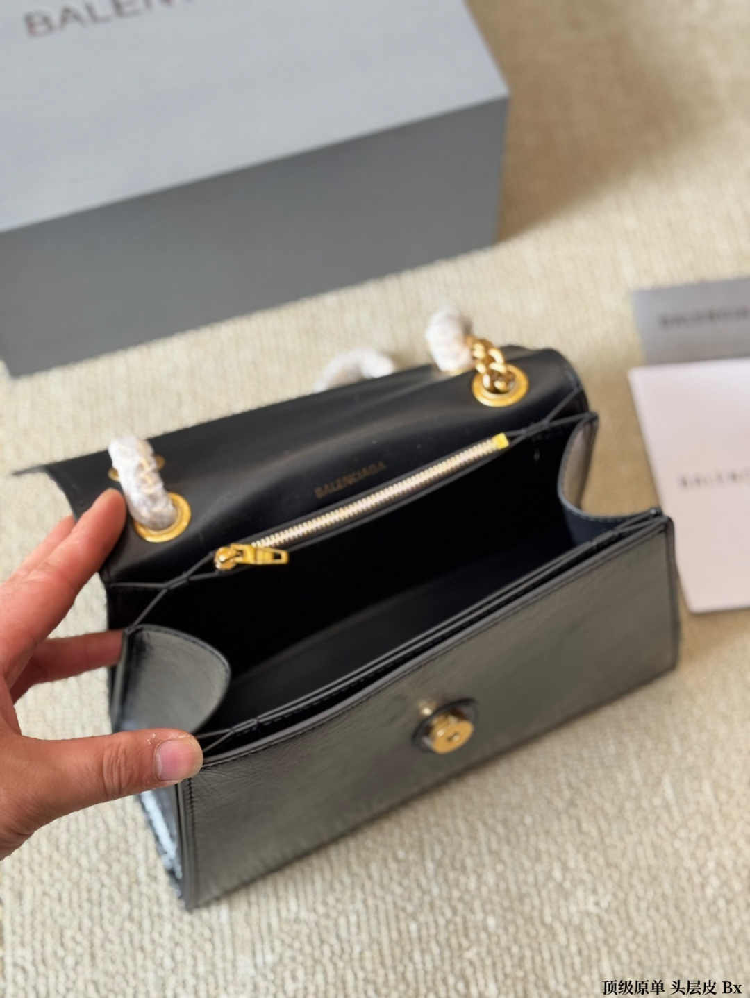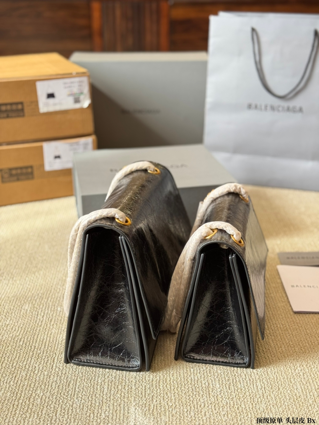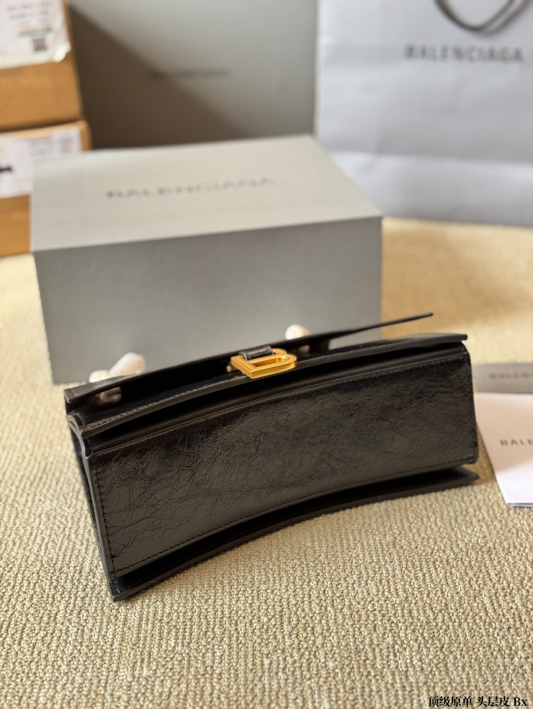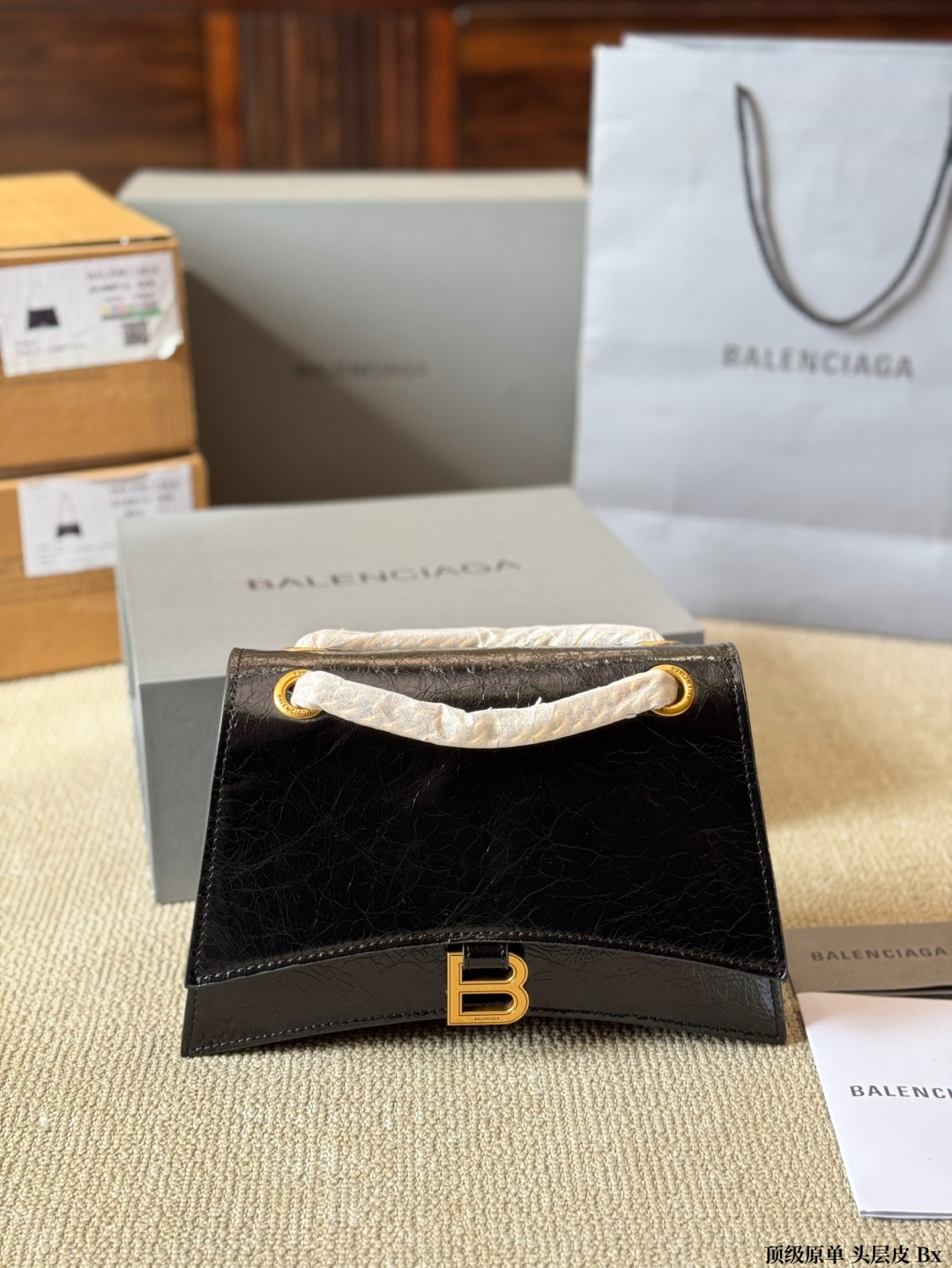バレンシアガのこのバッグは、黒色のレザーを使用しており、独特なシワ加工が施された質感が特徴です。 フロントには大きなゴールドの「B」ロゴがアクセントとなり、スタイリッシュな印象を与えます。