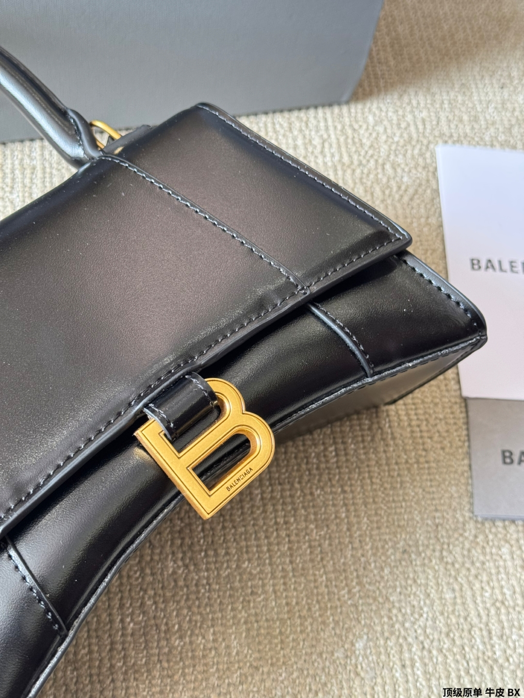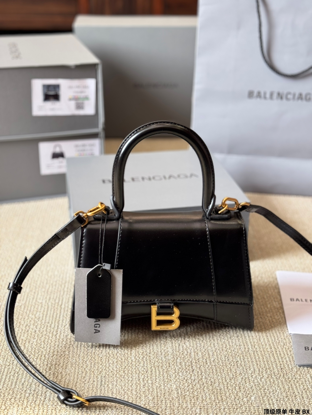 このブラックのバレンシアガ バッグは、高級感あふれる光沢のあるレザーを使用しています。