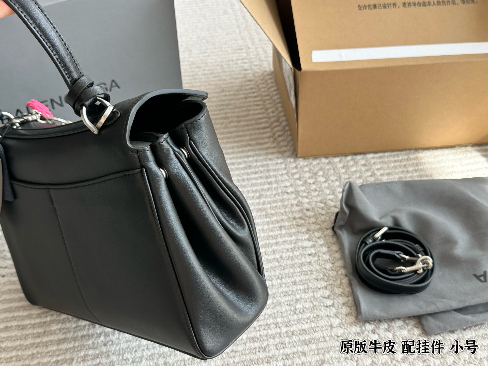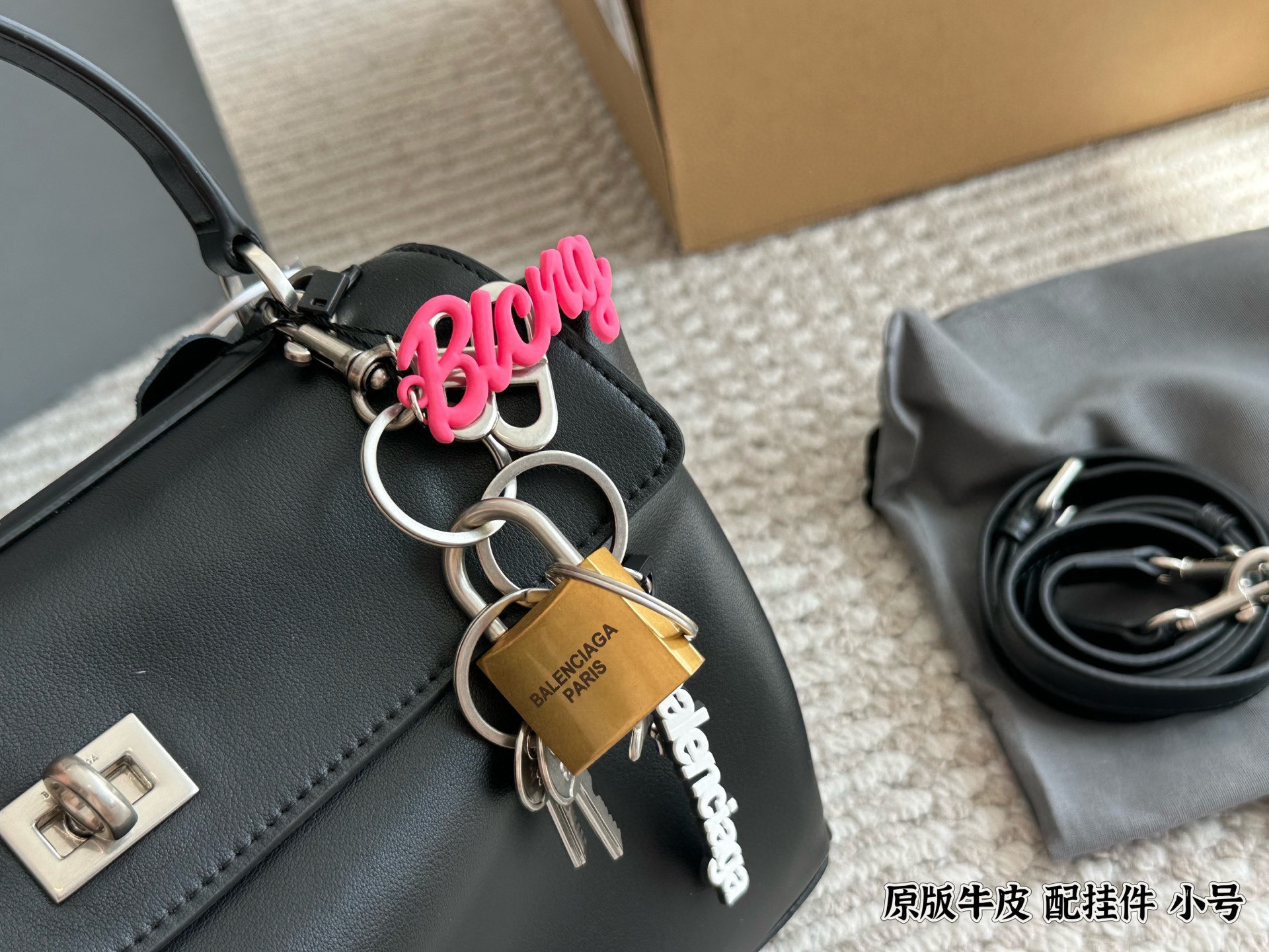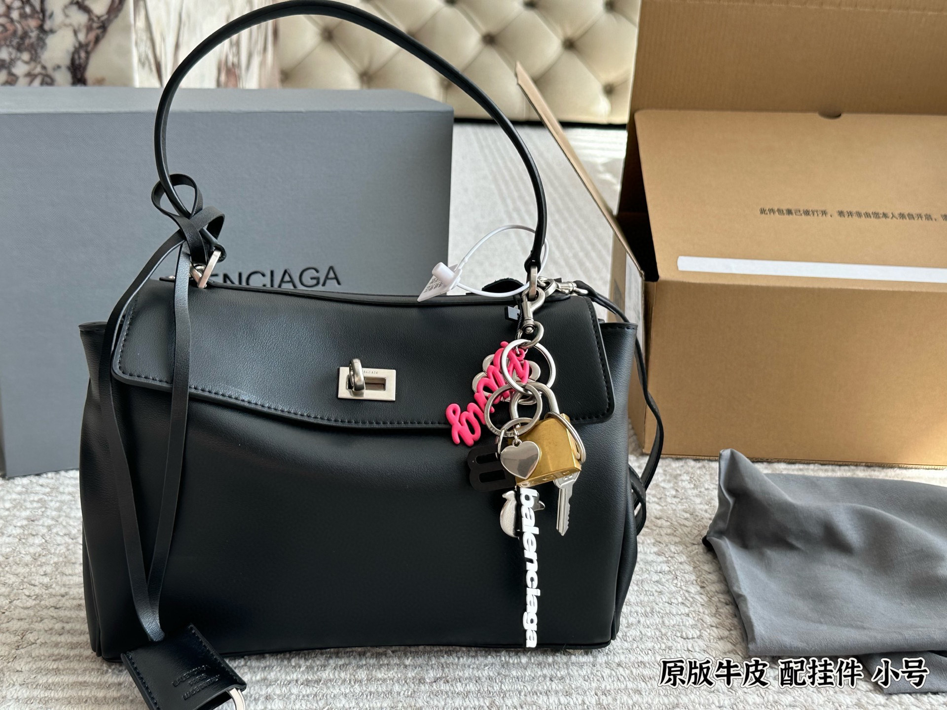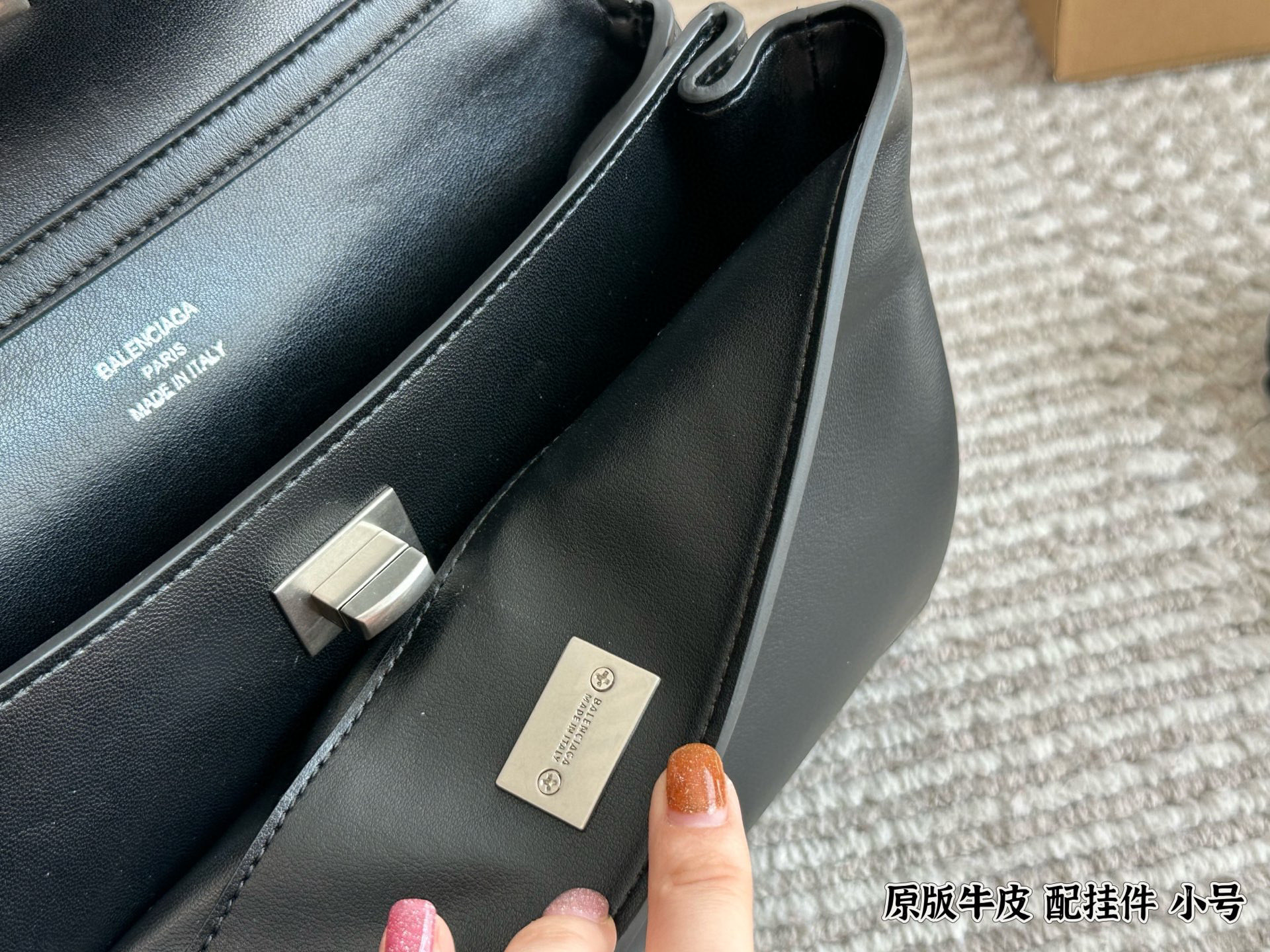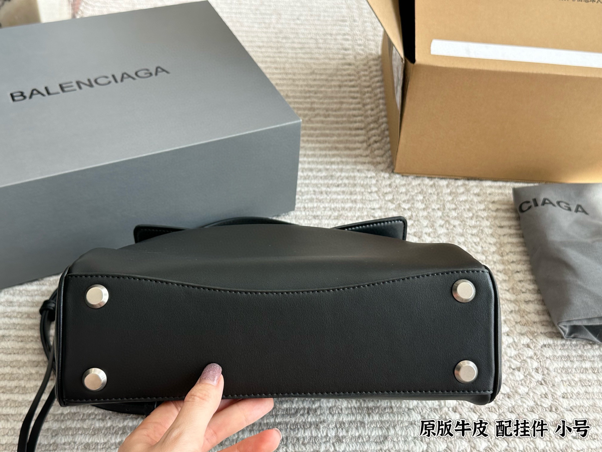 このBALenciagaの黒いハンドバッグは、高級感あふれる光沢のある本革を使用しています。