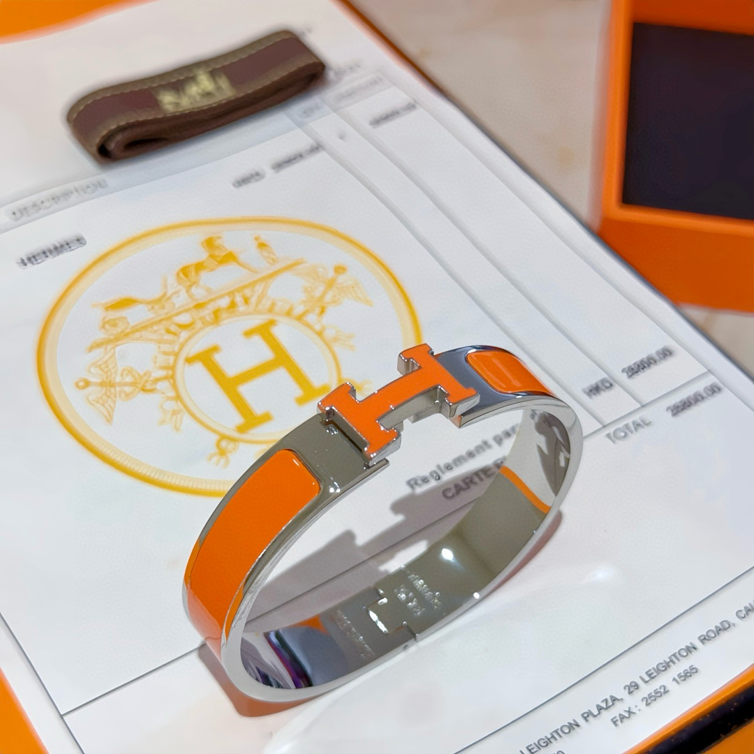 このHERMES ブレスレットは、鮮やかなオレンジ色のエナメルが特徴です。シルバーの金属と鮮やかなオレンジのコントラストが、上品でモダンな印象を与えます。H型のロゴが際立っており、ブランドのアイコンとしての存在感を放っています。