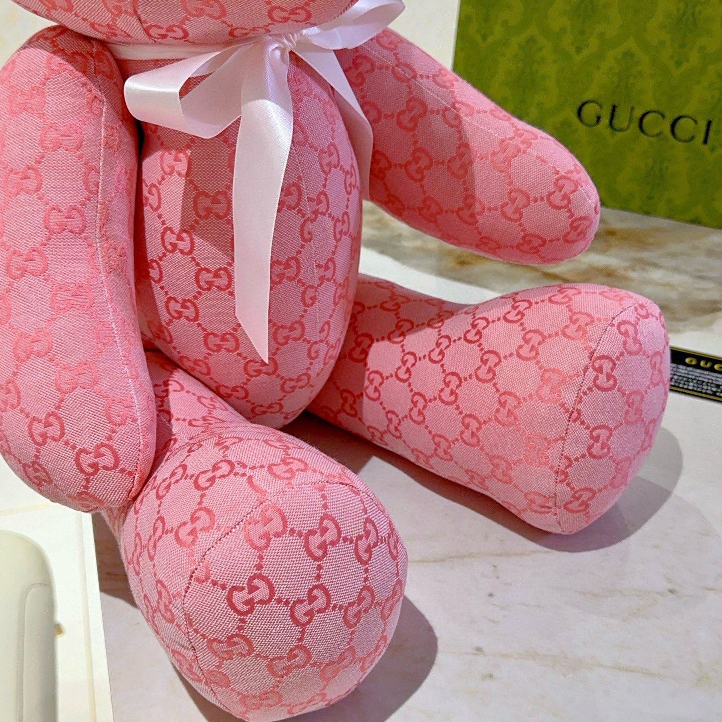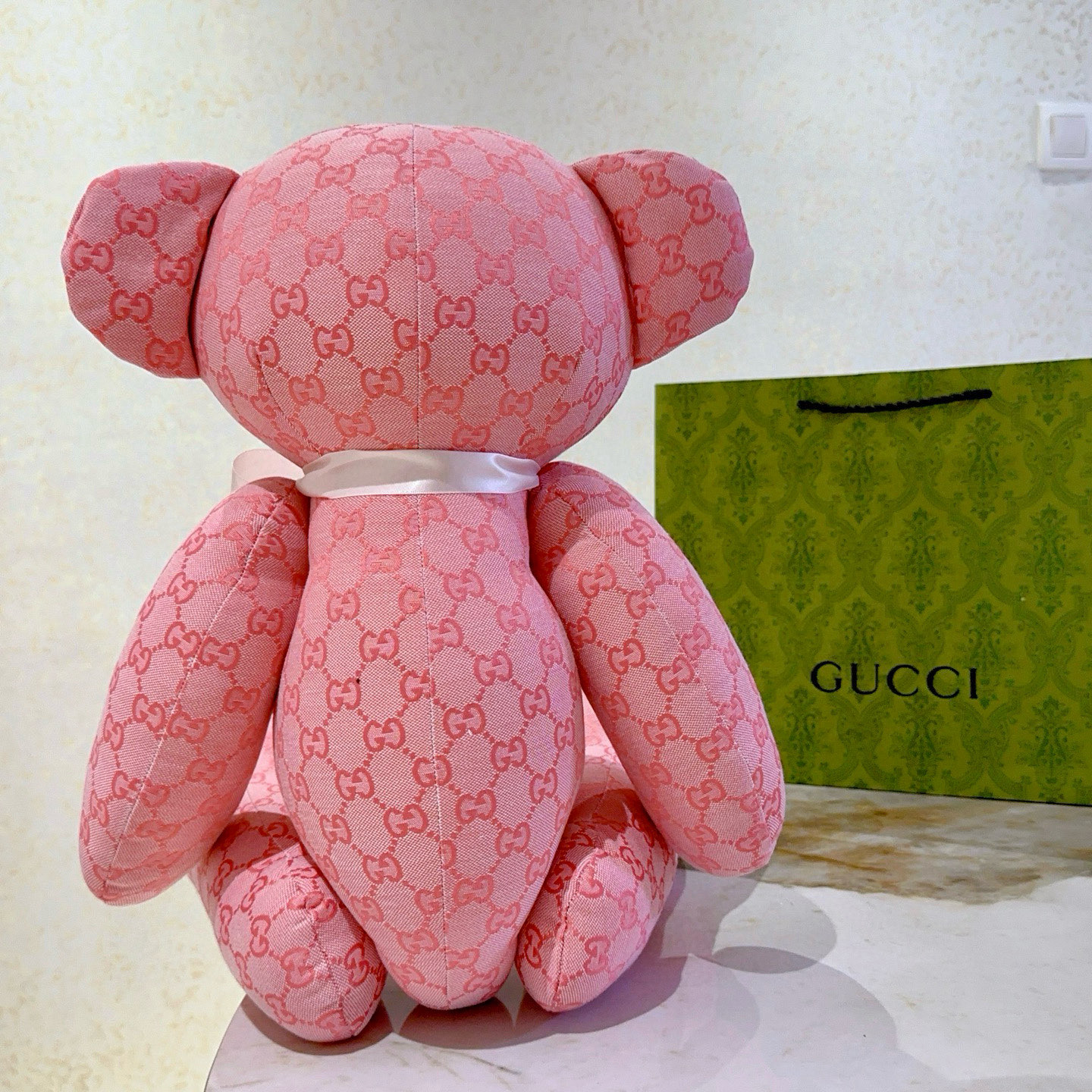 グッチのピンクベア デコレーション オブジェは、ブランドの象徴的なGGパターンが全面に施された、愛らしいデザインが特徴です。柔らかなピンクの生地に、白いリボンが優雅なアクセントを加え、どこに置いても気分が明るくなります。