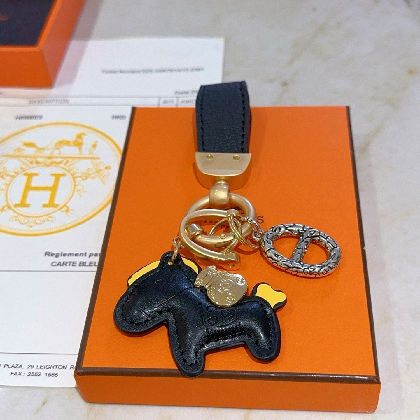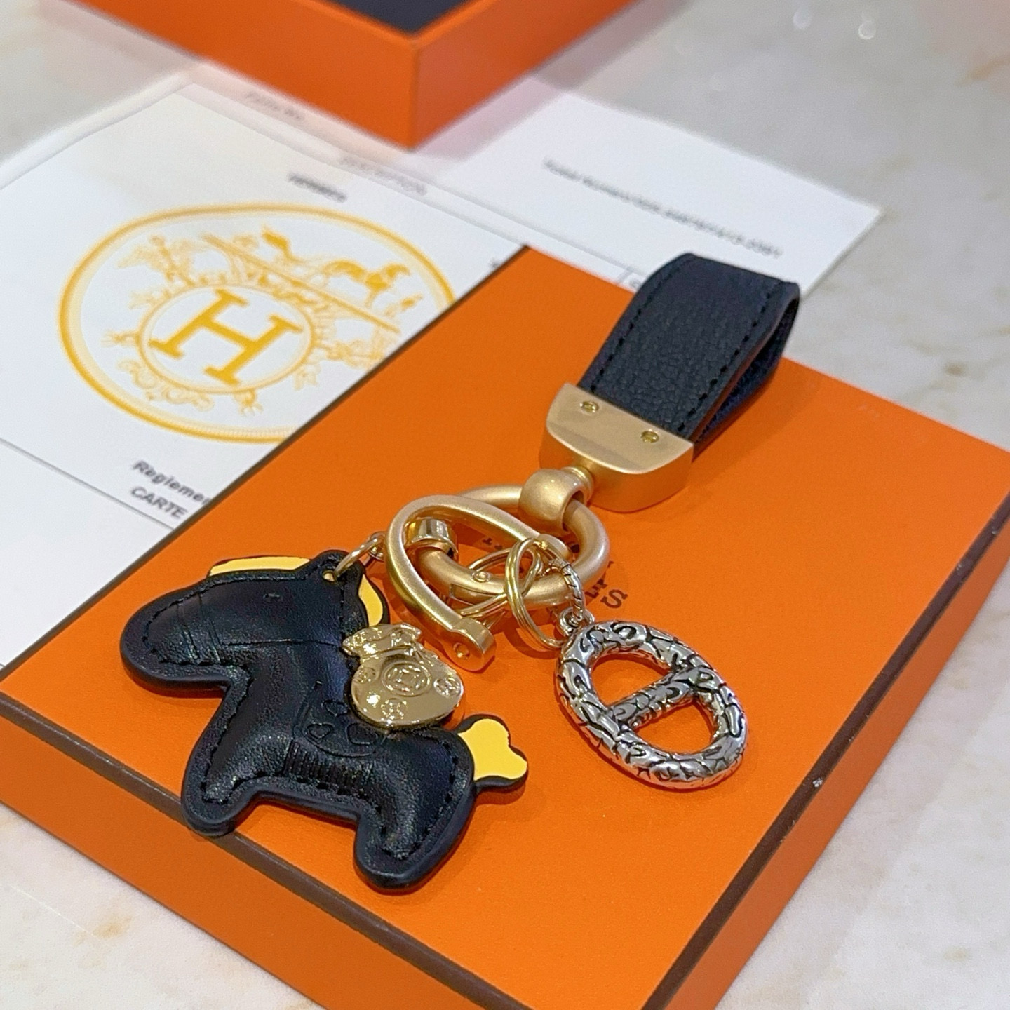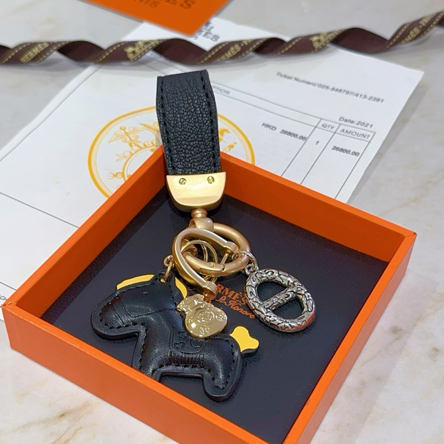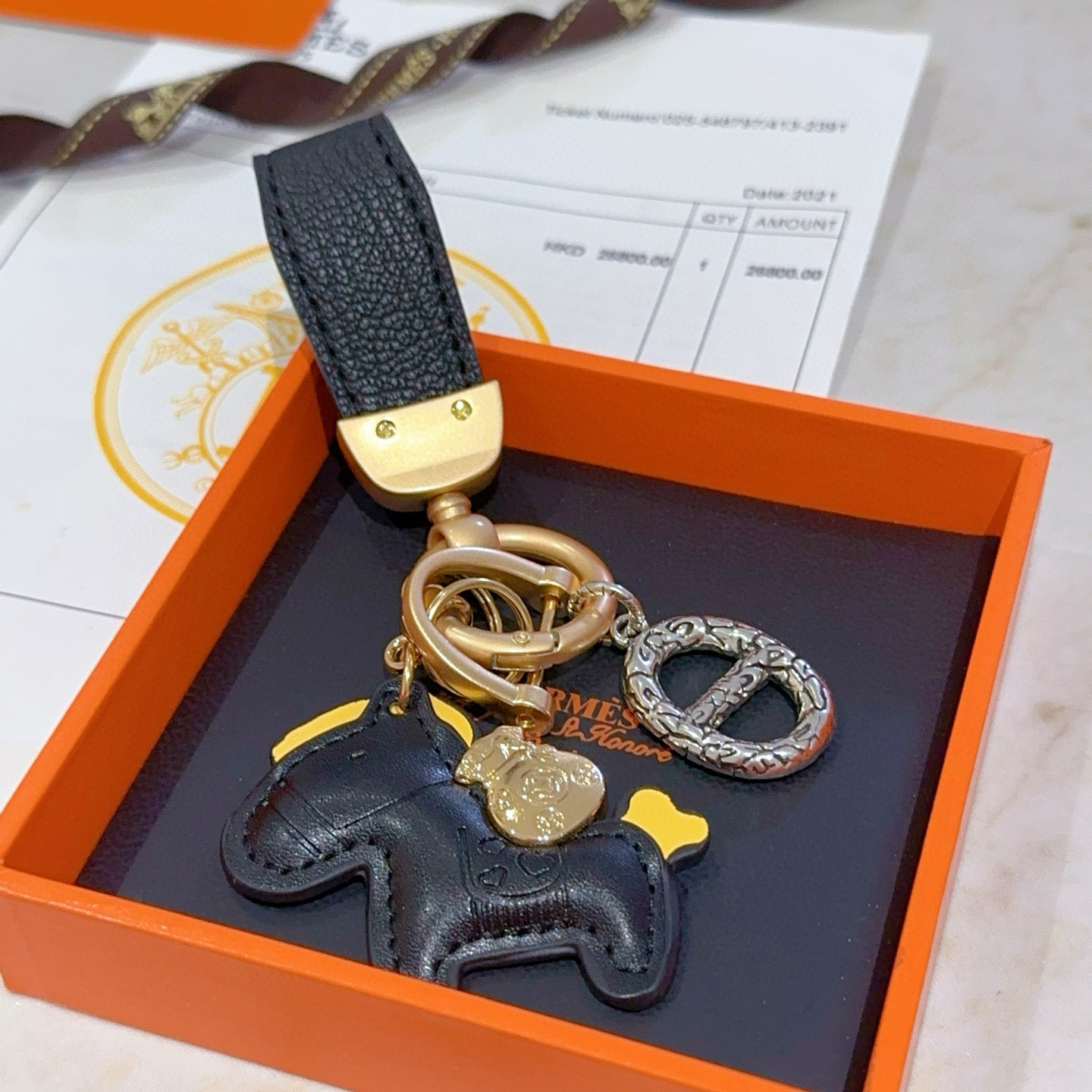 このキーリングは、上質なレザーと精巧な金属パーツで作られています。黒と黄の2色のローリングホースが特徴で、高級感のあるデザインです。金色の金具とシルバーの装飾が、さりげないアクセントになります。