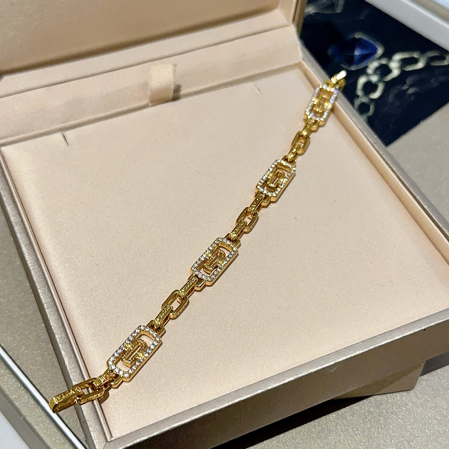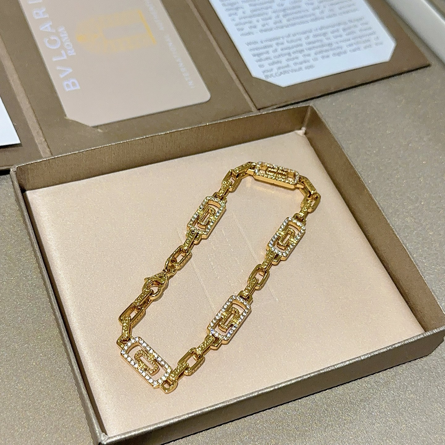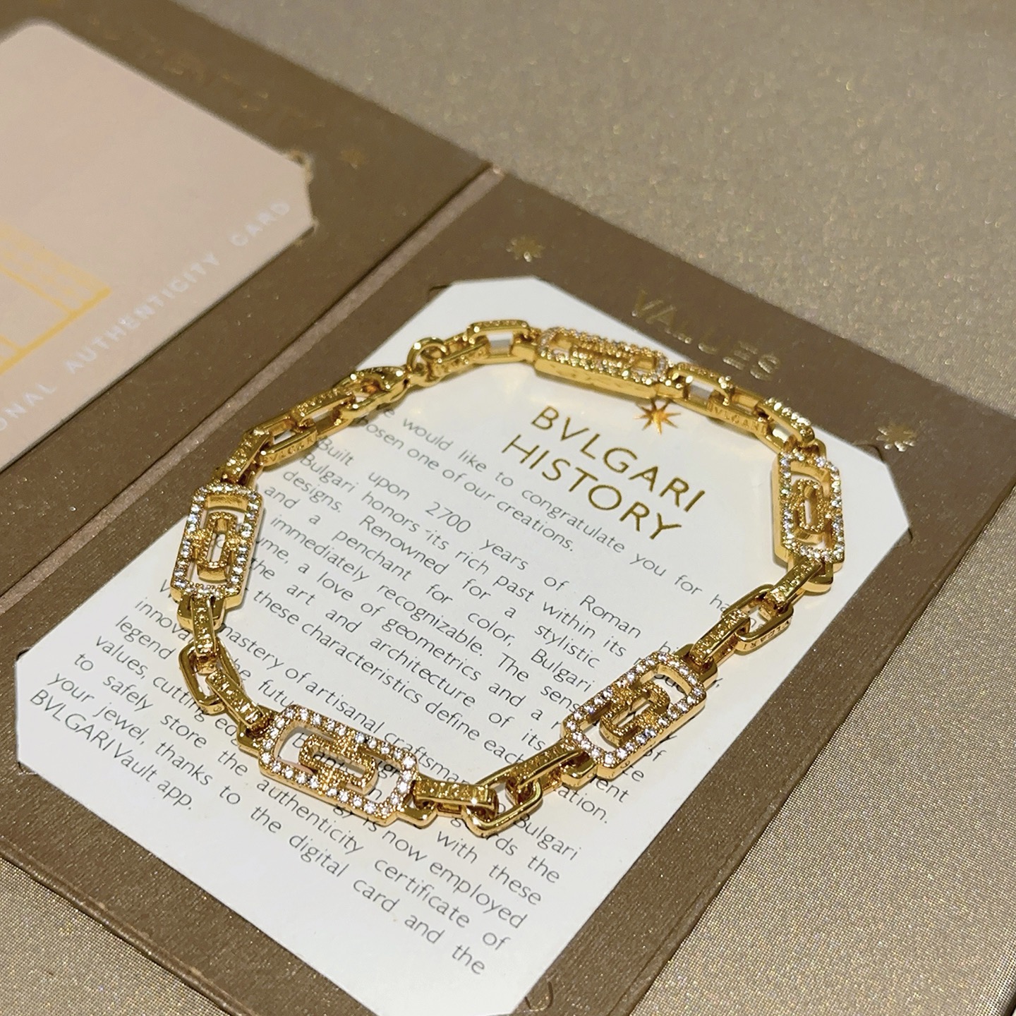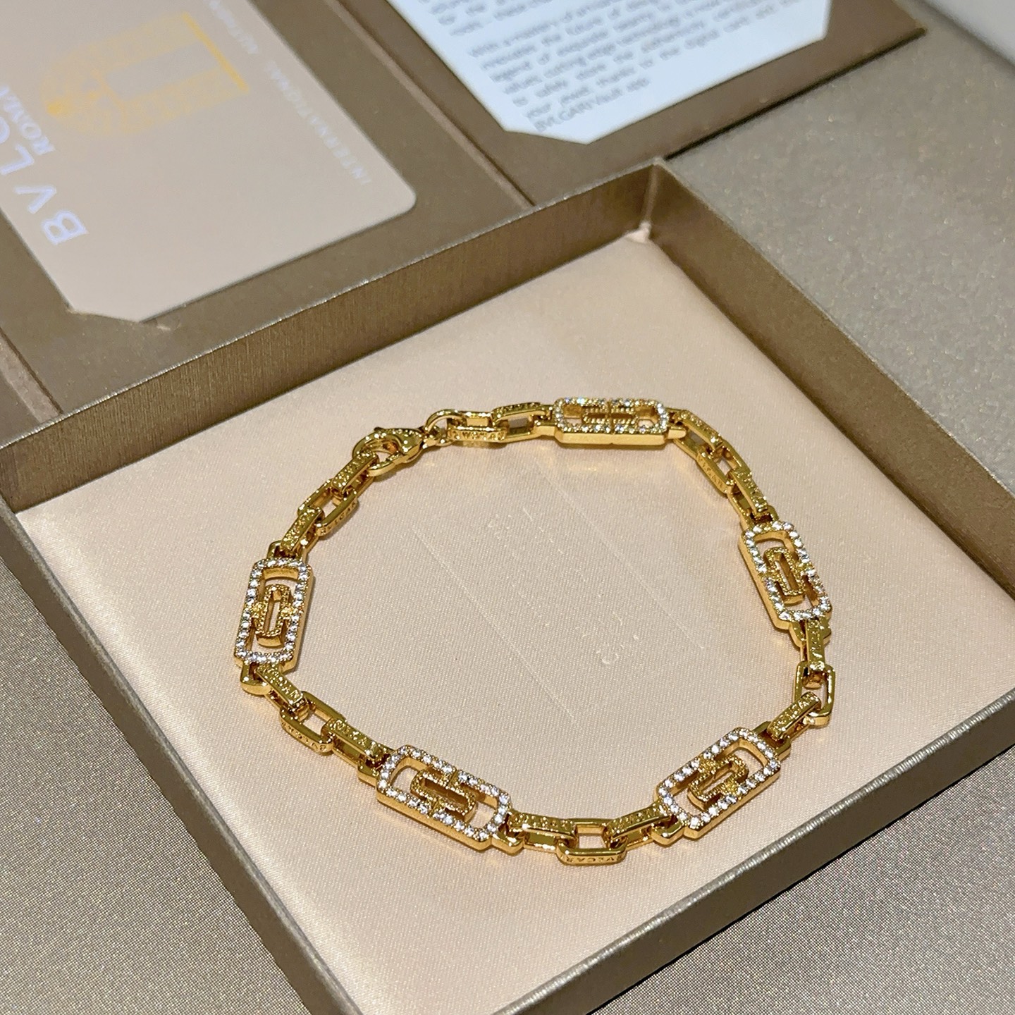 BVLGARI ブレスレット ライン。このブレスレットは、輝くゴールドカラーと、きらめくストーンが特徴です。幾何学的なデザインが洗練された印象を与えます。