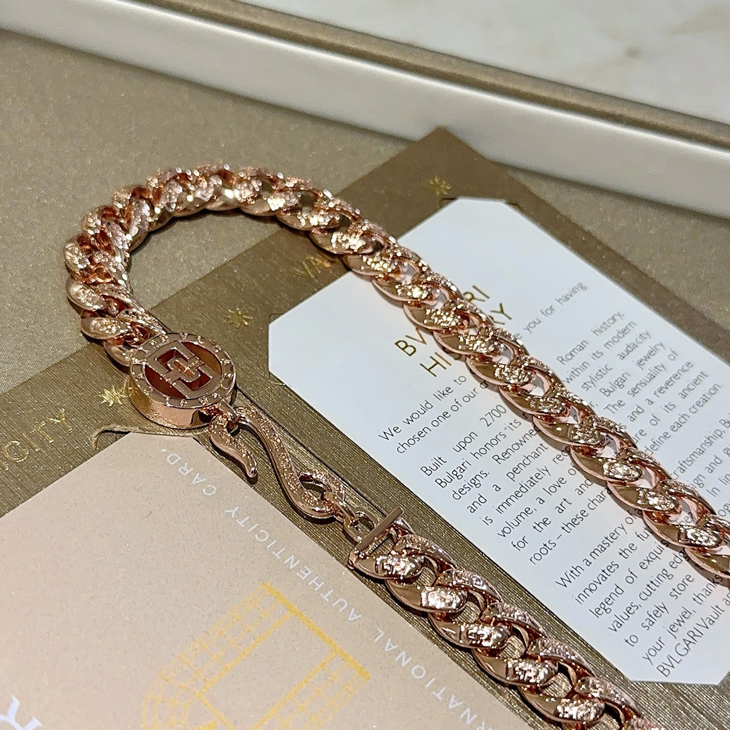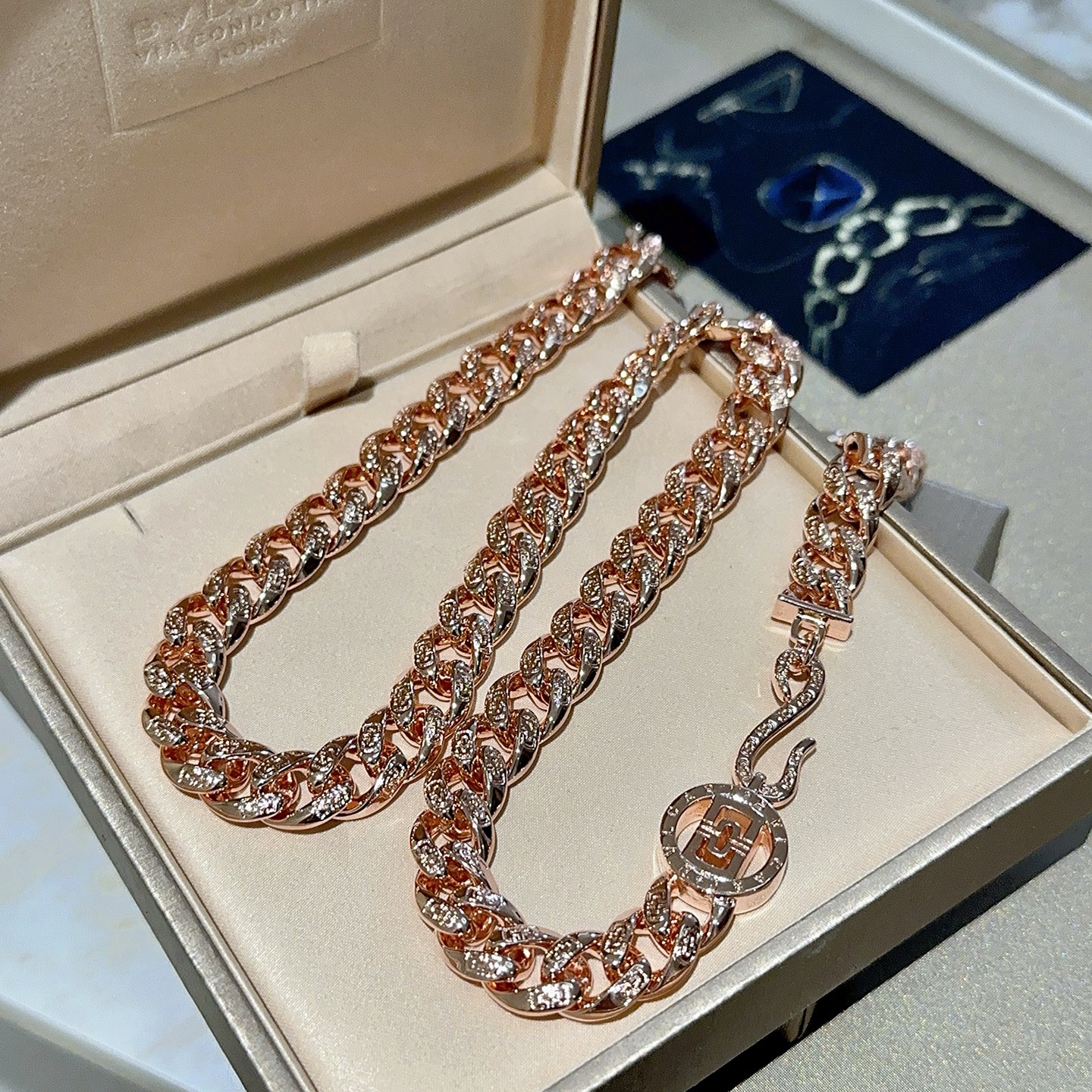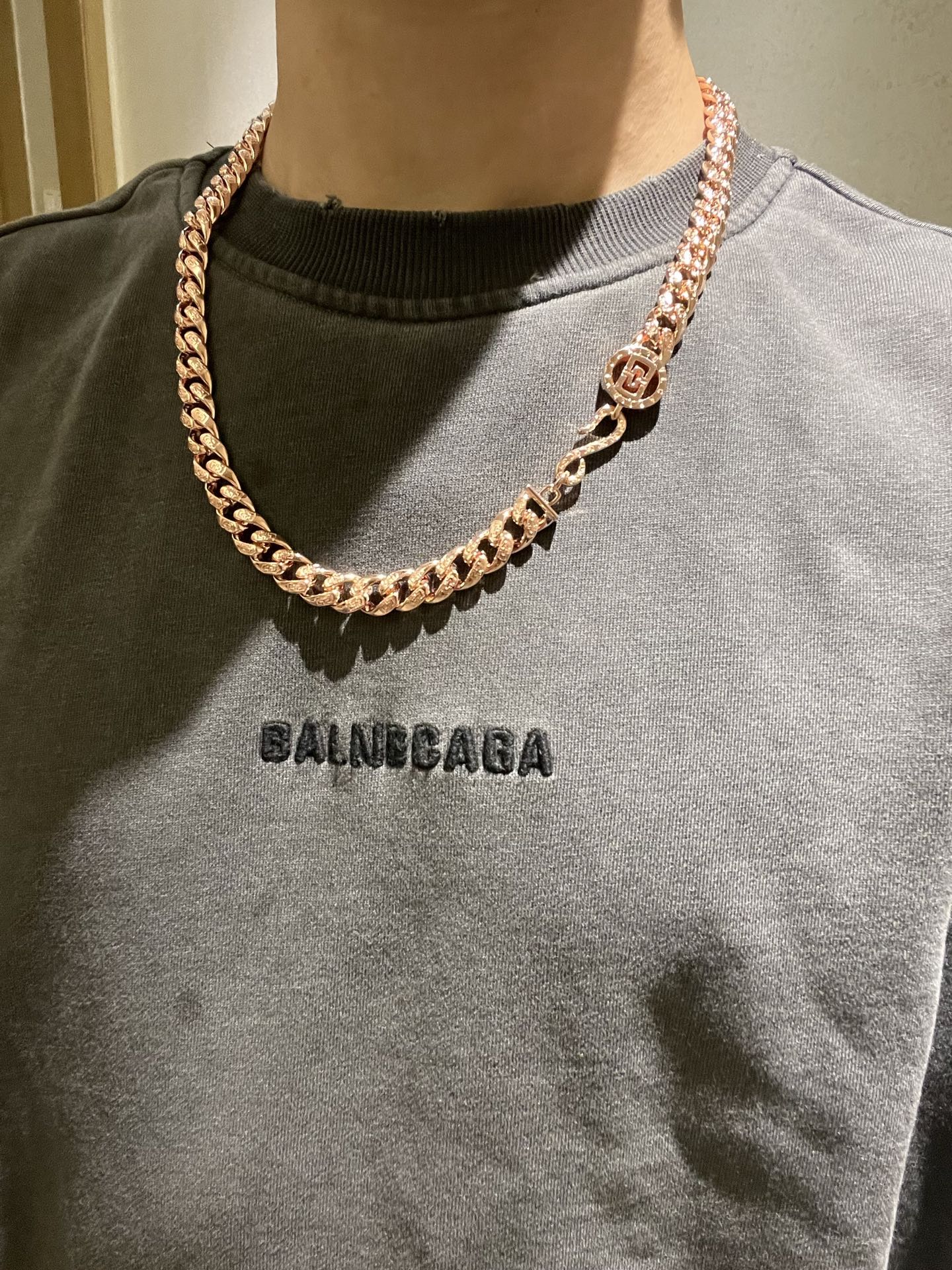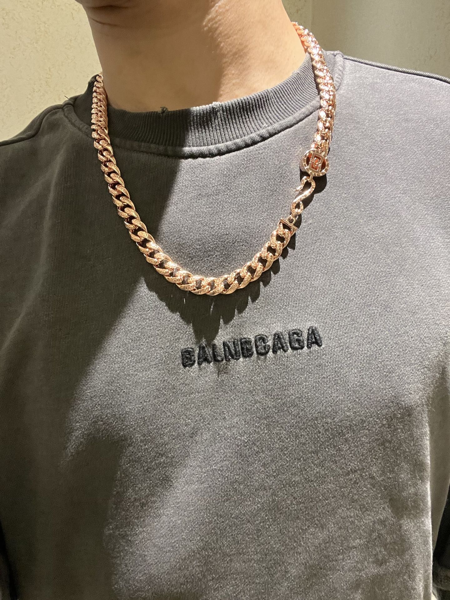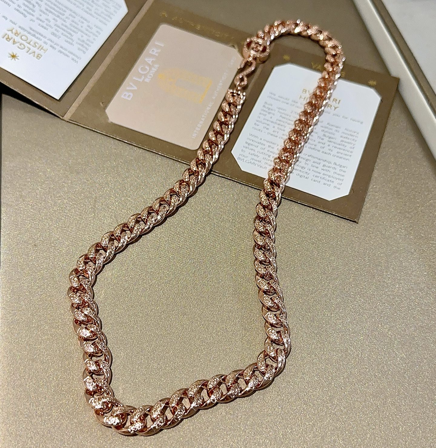 BVLGARI ローズゴールドのメンズネックレスは、高級感あふれるデザインが特徴です。ローズゴールドの輝きと、きらめくダイヤモンドが、洗練された印象を演出します。太めのチェーンは、存在感があり、普段使いから特別な日の装いまで、幅広く活躍します。
