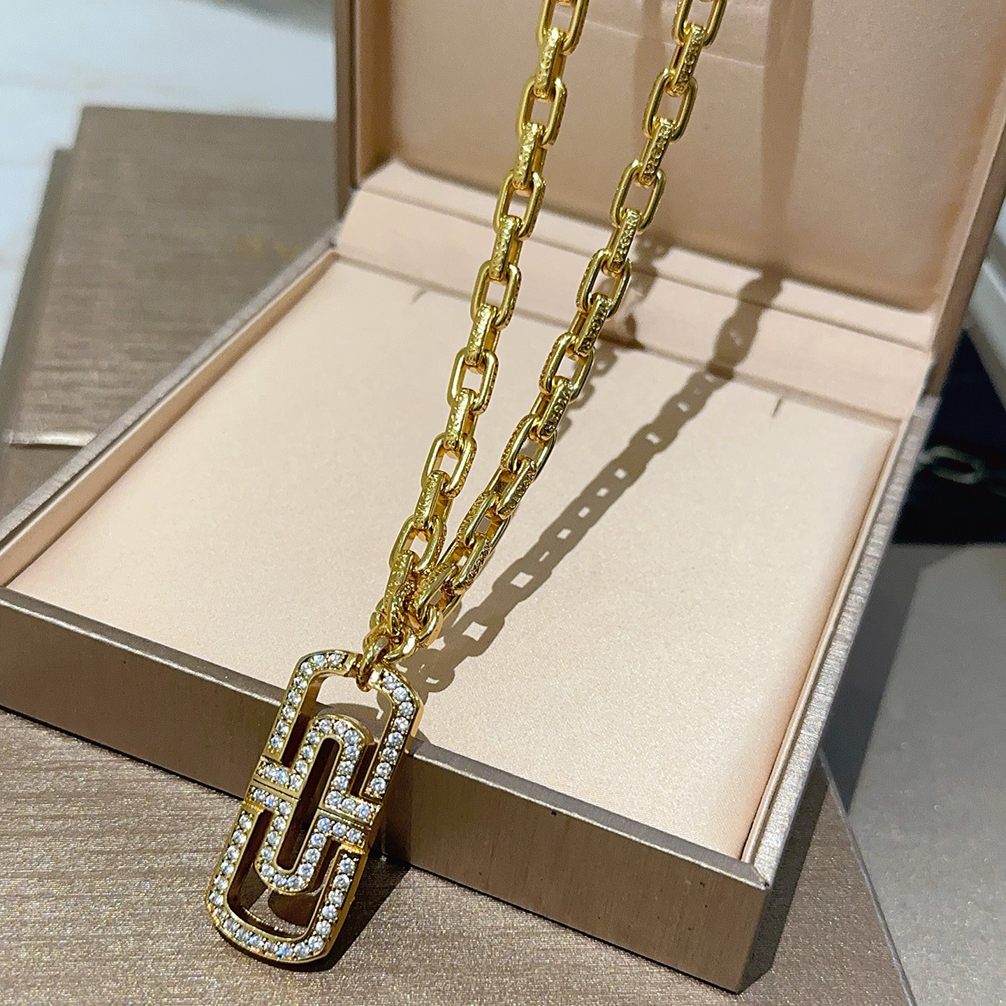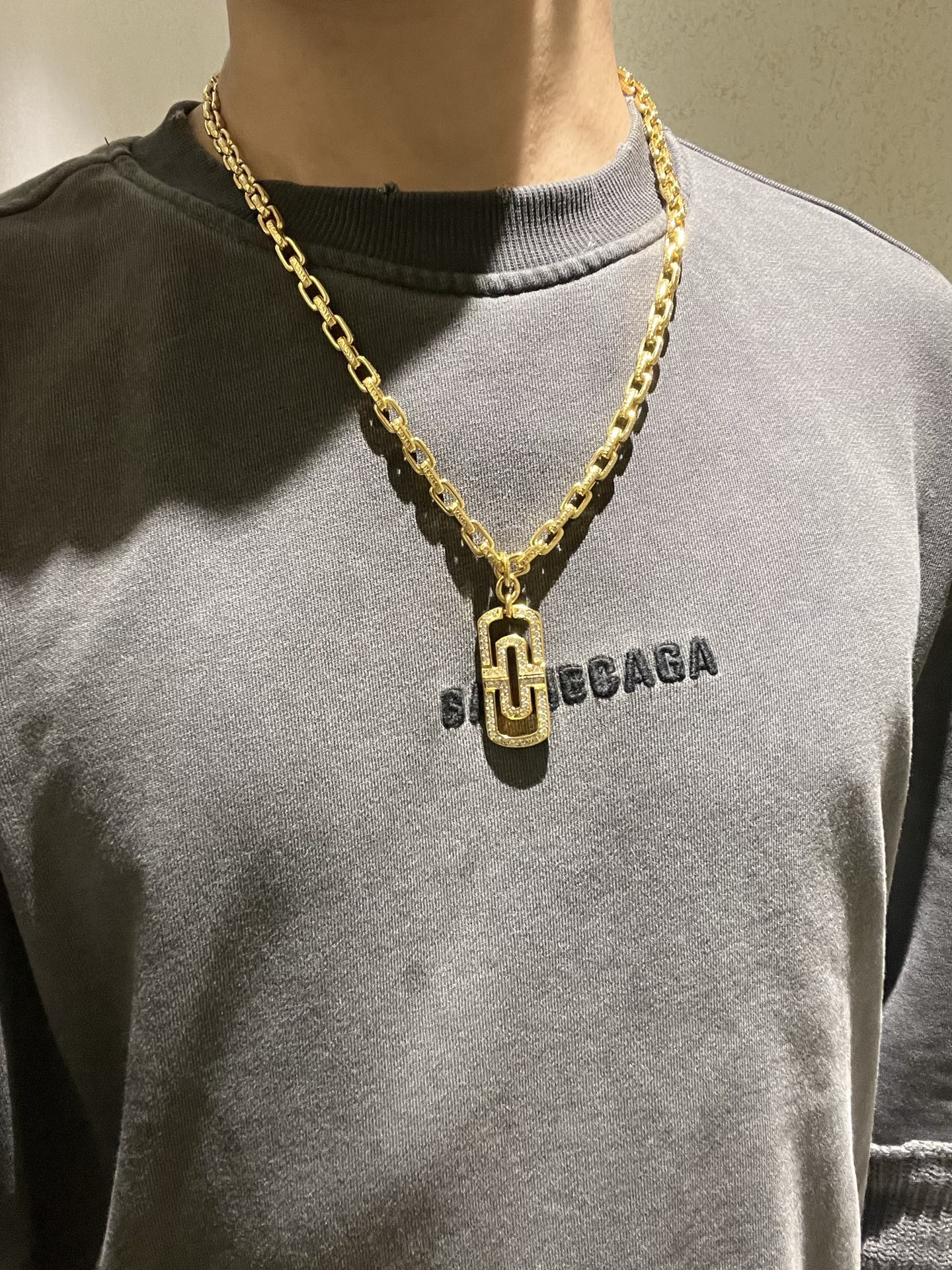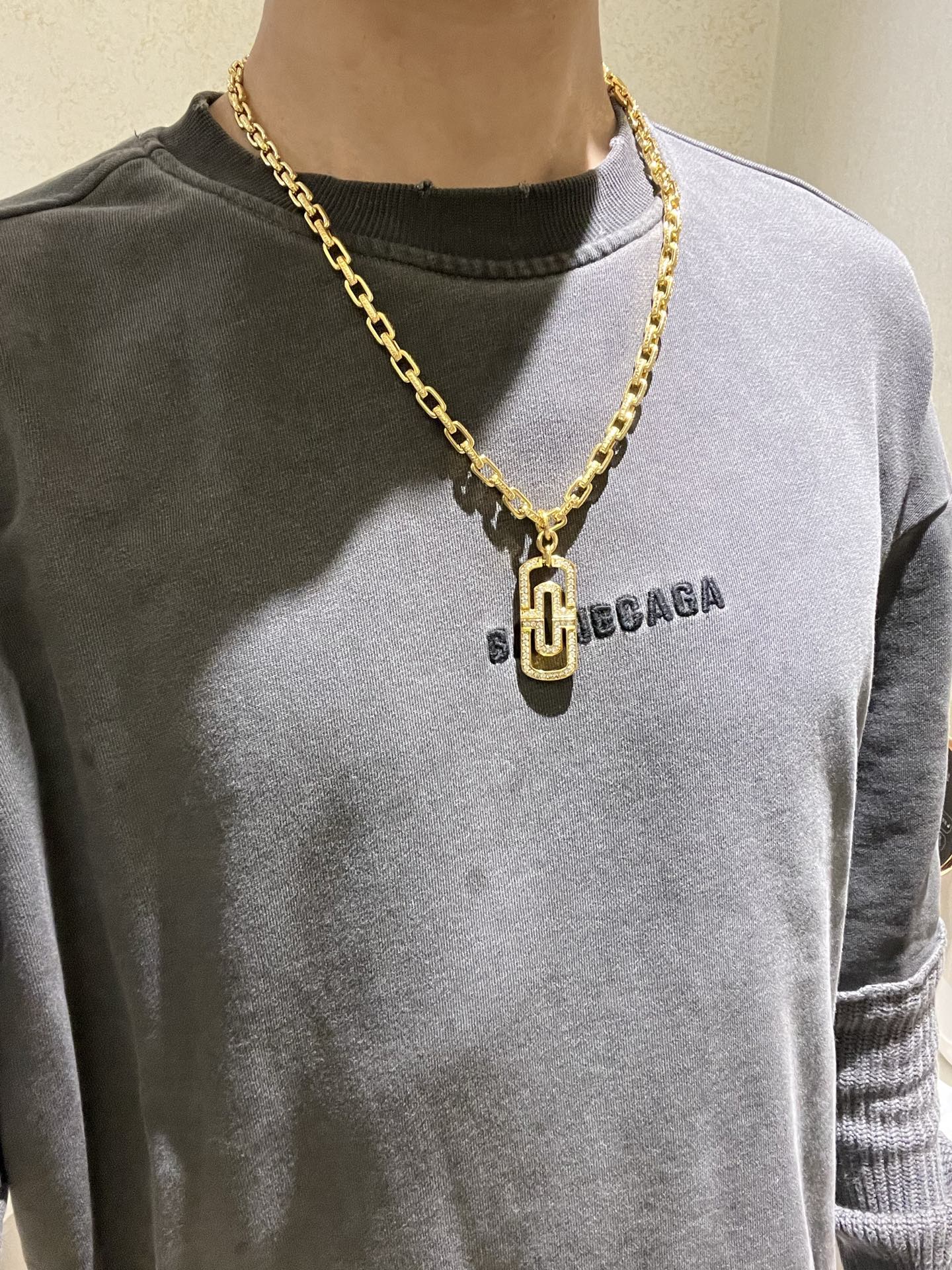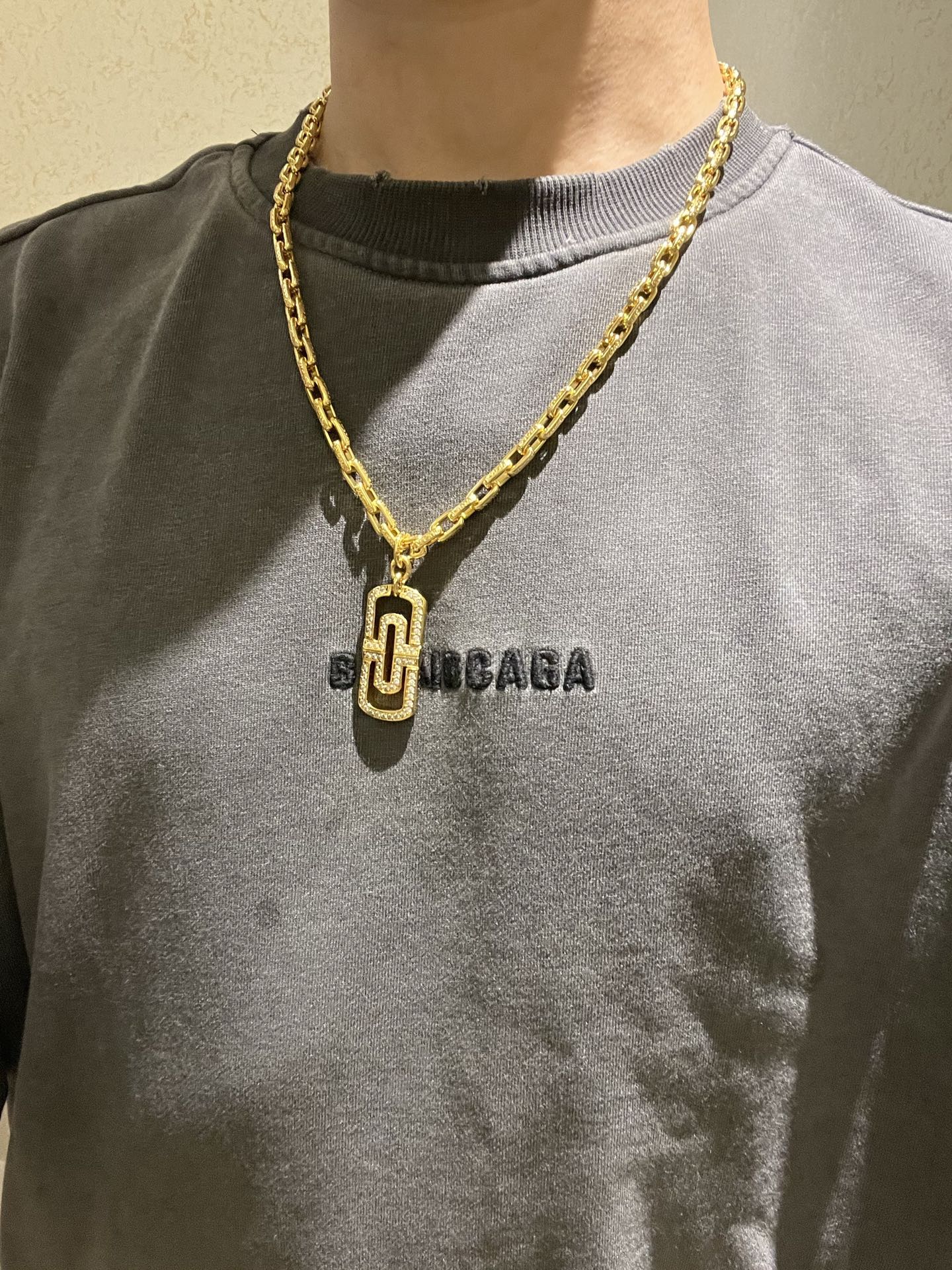 ゴールドカラーの太めのチェーンに、ブランドロゴがデザインされたキーホルダー型のペンダントが付いています
