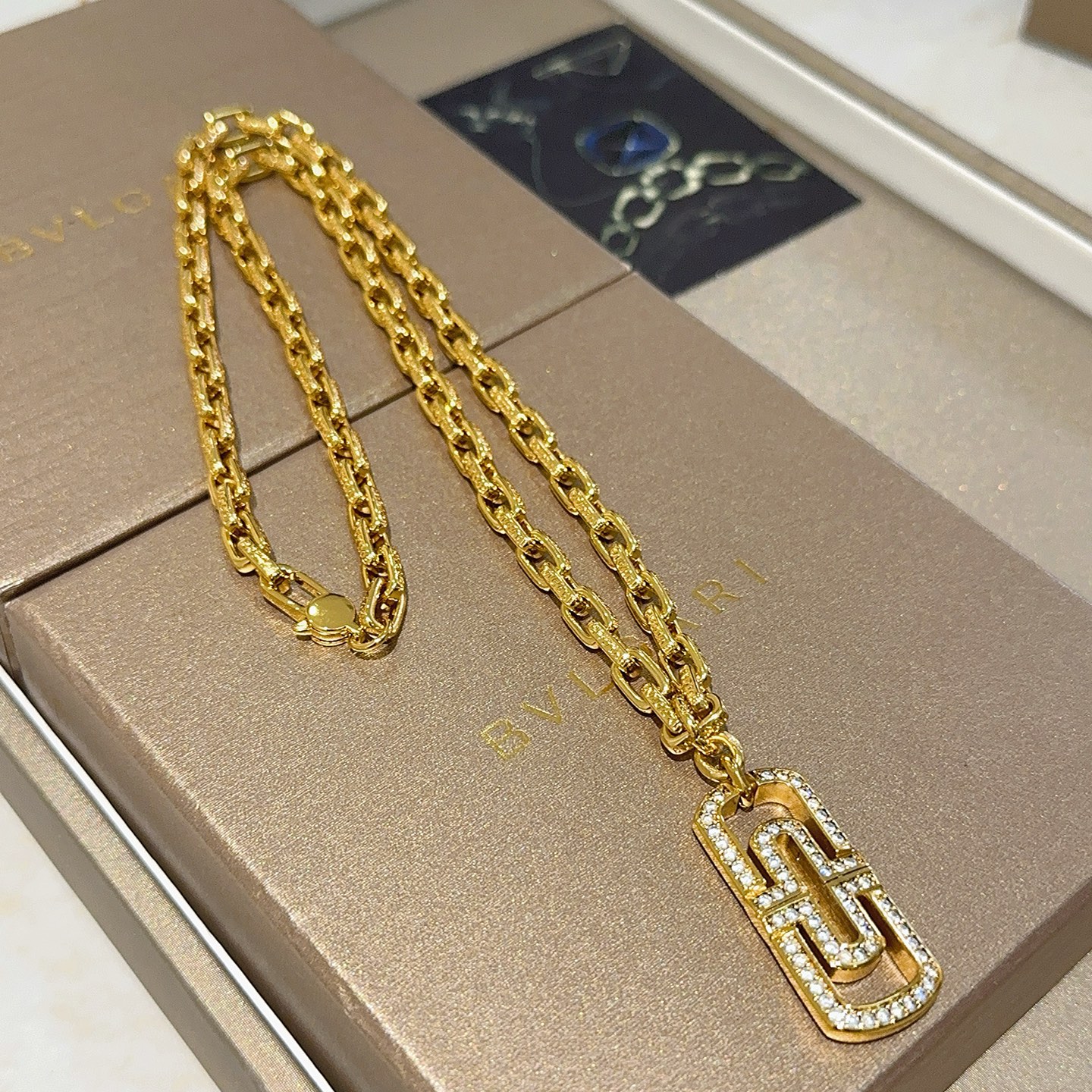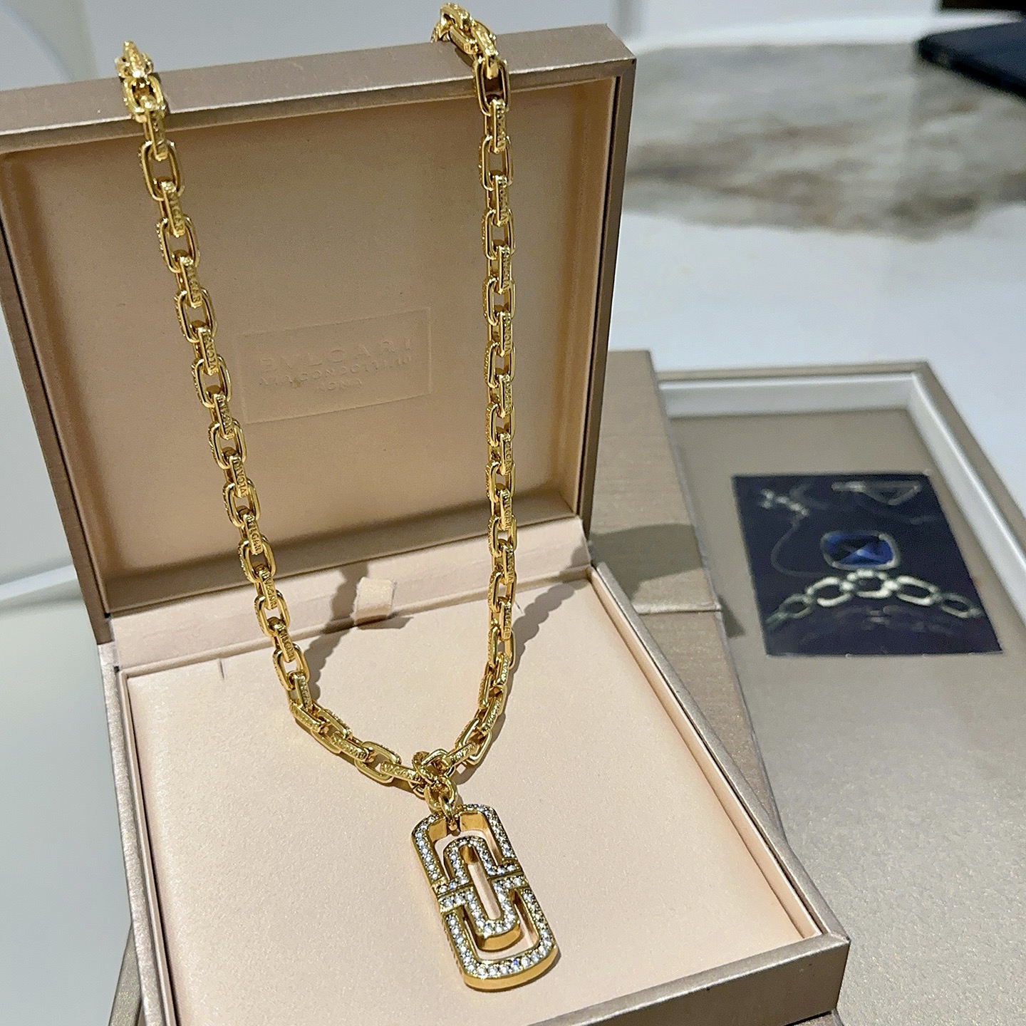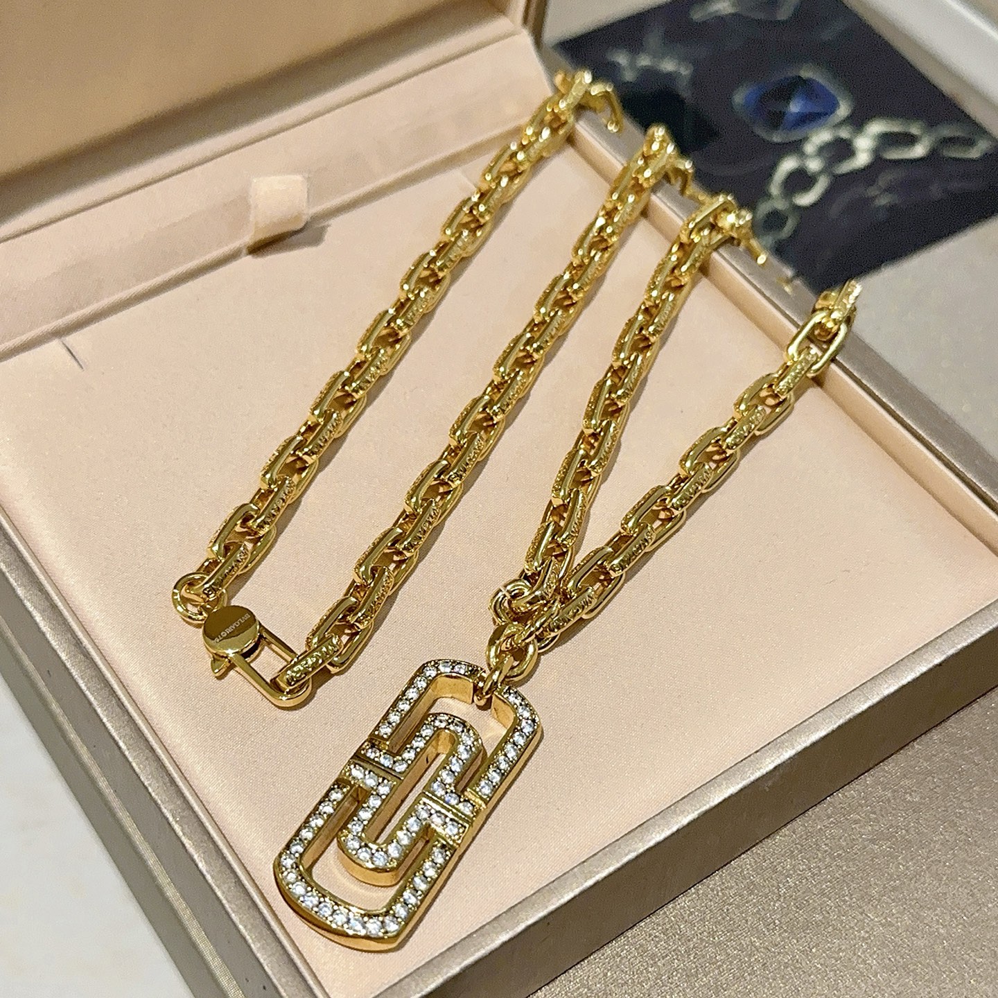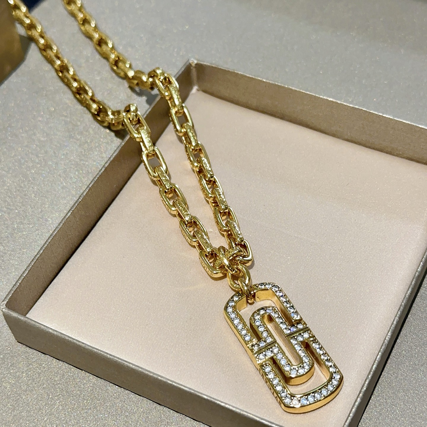 ゴールドカラーの太めのチェーンに、ブランドロゴがデザインされたキーホルダー型のペンダントが付いています