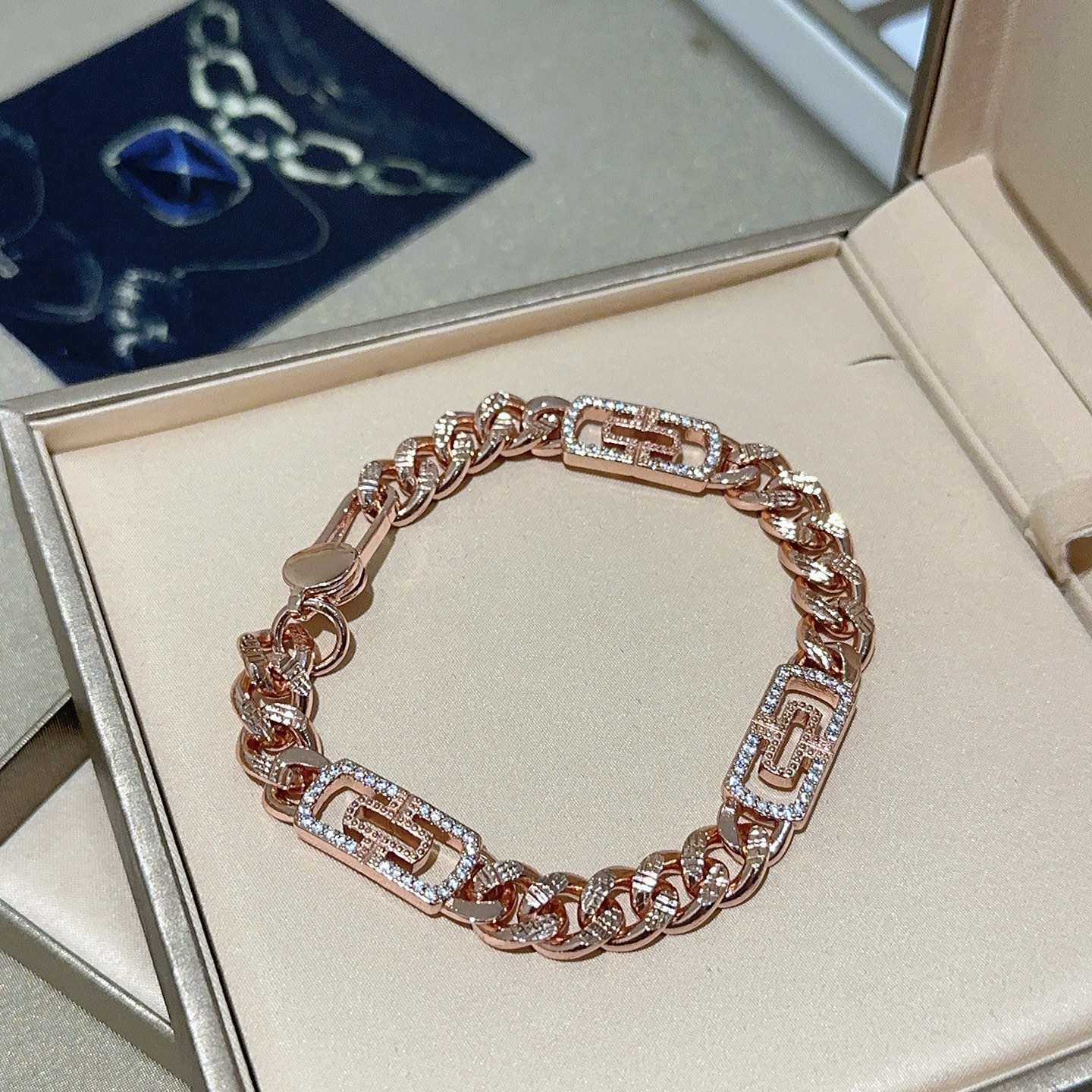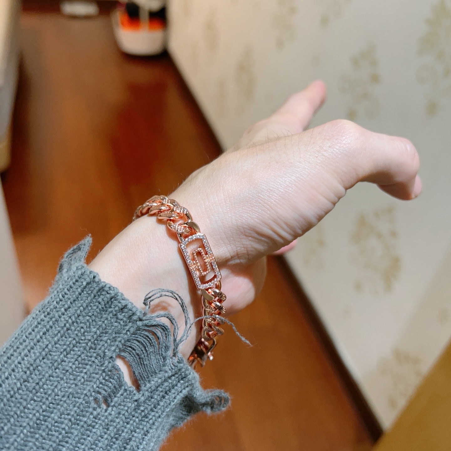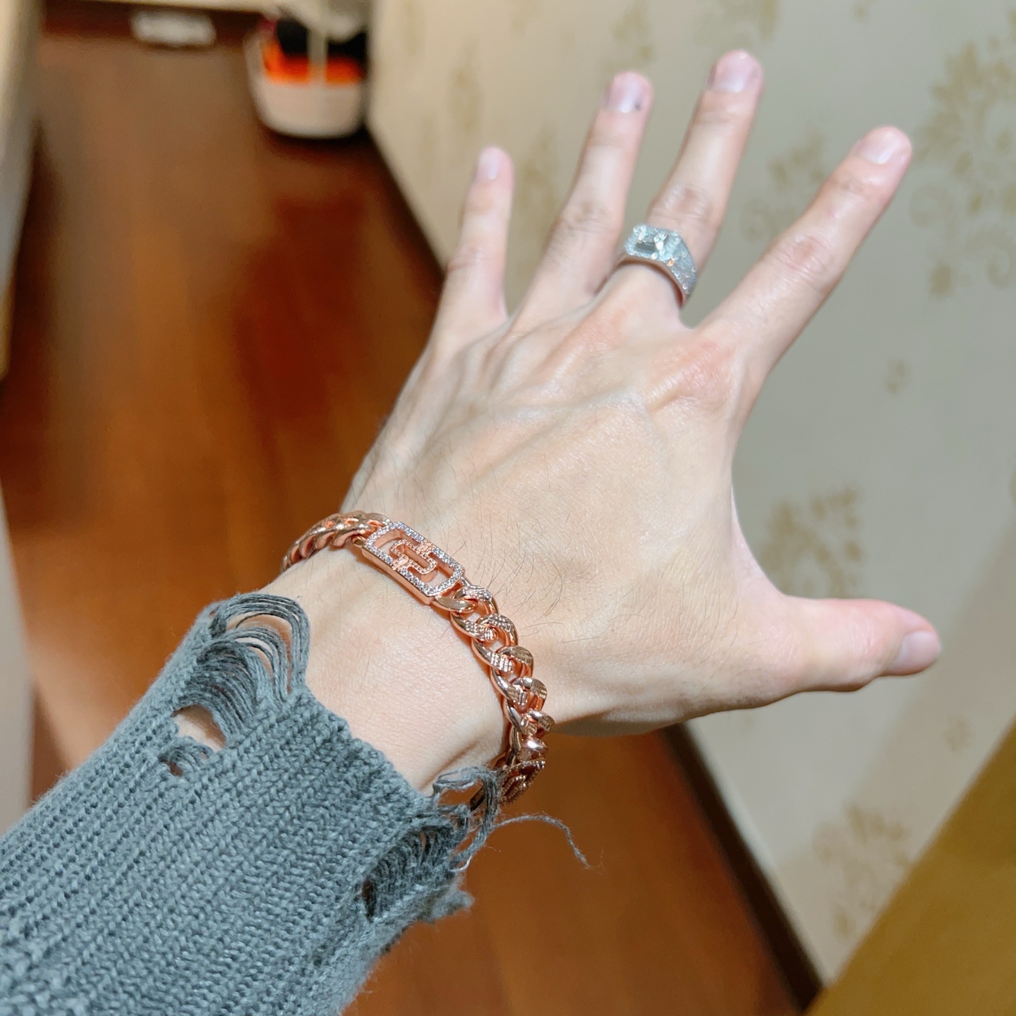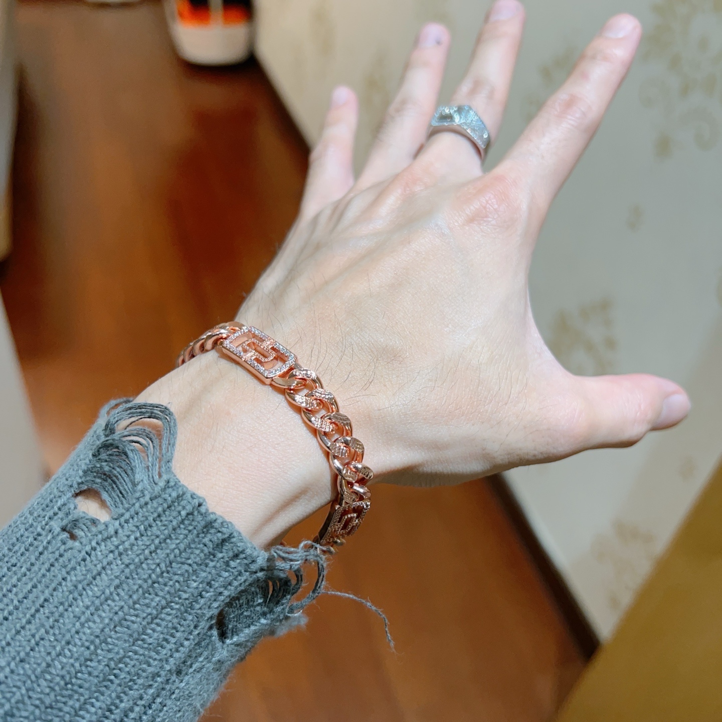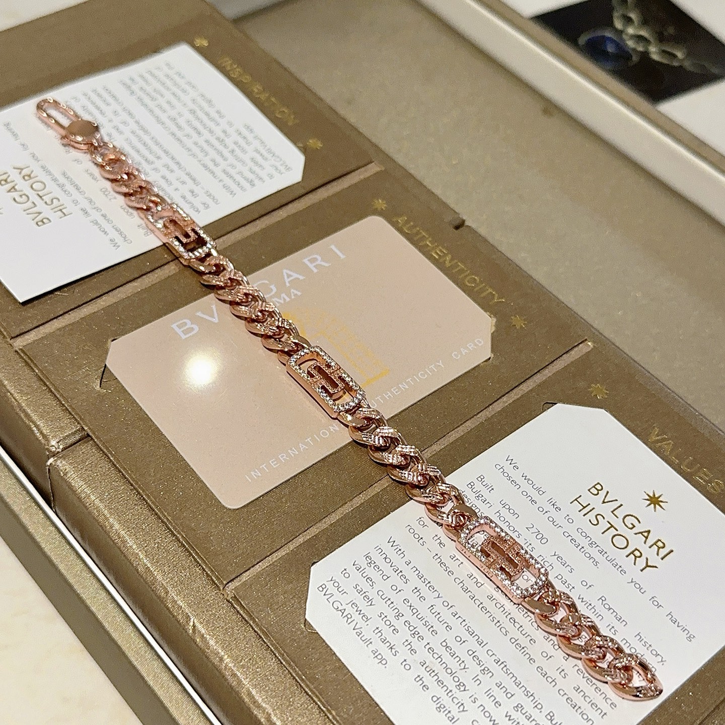 このBVLGARIのブレスレットは、ローズゴールドカラーが上品に輝き、幾何学的なデザインのモチーフがスタイリッシュな印象を与えます。高品質な金属素材と、きらめくストーンが組み合わさり、手首を華やかに彩ります。