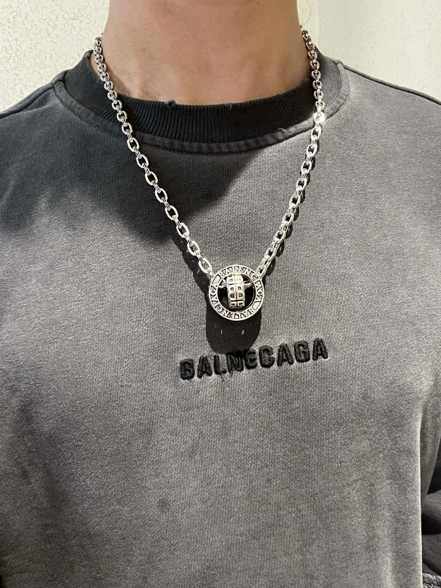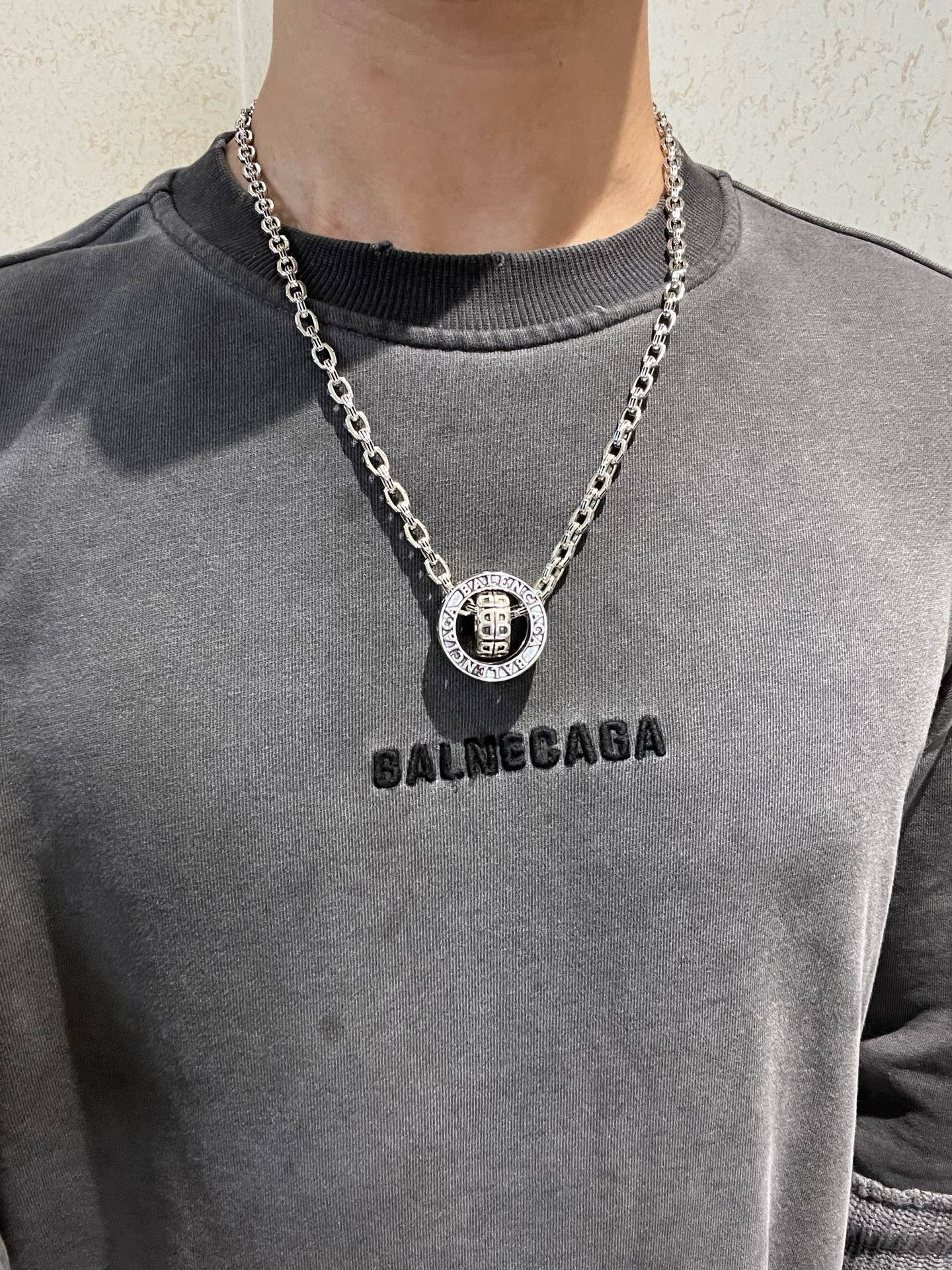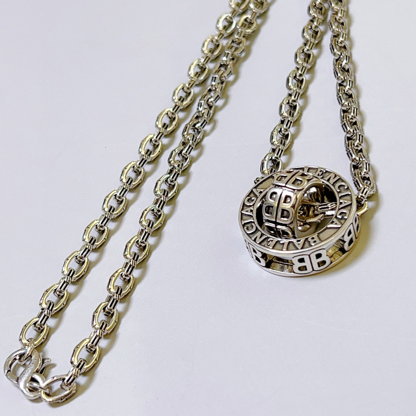 BALenciagaのメンズネックレスは、シルバー調のチェーンに、ブランドのロゴが刻まれた円形のペンダントが特徴です ペンダントは中央に3Dの「BB」ロゴが回転する仕様で、動きに合わせて光を反射してキラキラと輝きます。