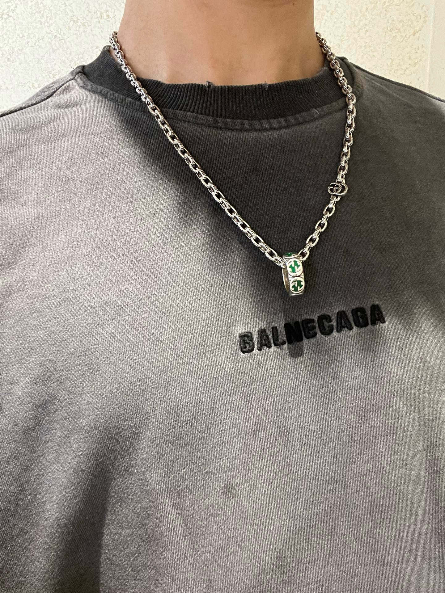 このGUCCIのネックレスは、シルバーのロープチェーンにグリーンのエンボス加工されたGGマークが施されたアクセントが特徴です。 grenade型のデザインは、シルバーとグリーンのコントラストが美しい、洗練された雰囲気を演出します。