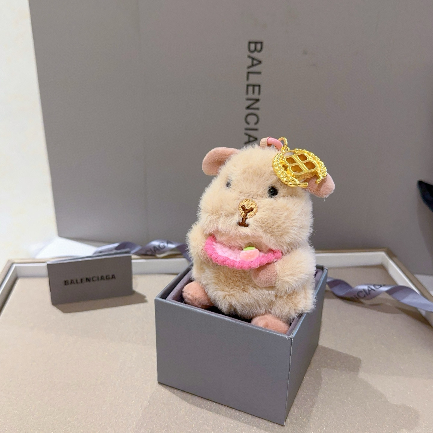 首にはピンクの編み込みリボンが付いており、頭にはゴールドの「BB」ロゴが施された王冠が輝いています。