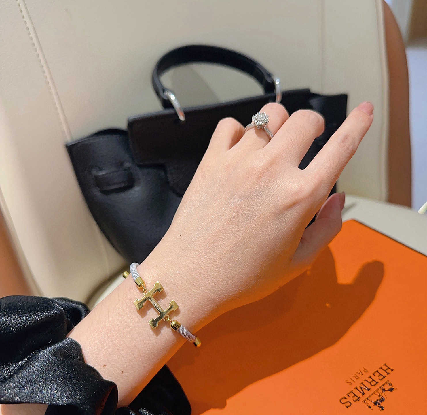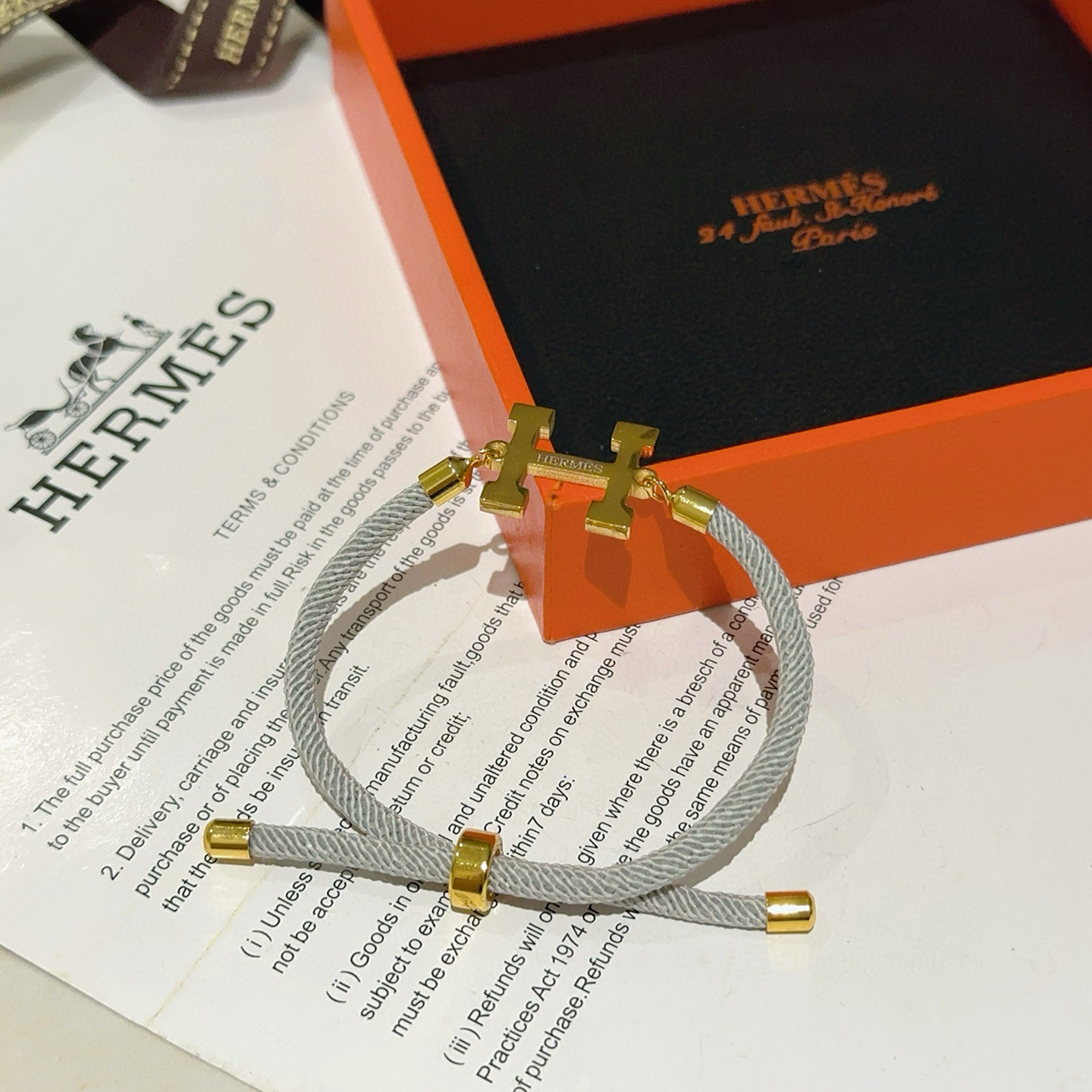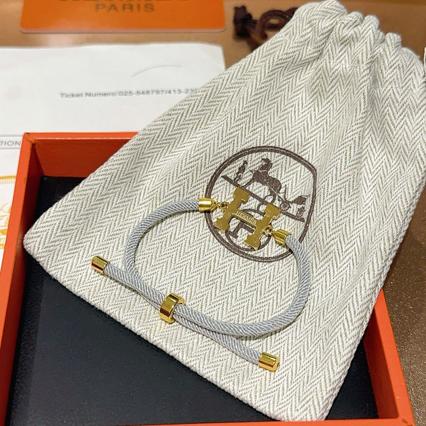 エレガントな HERMS ブレスレット。グレーの太めのロープに、ゴールドの「H」モチーフが特徴的です。柔らかな素材で、手首に優しくフィットします。