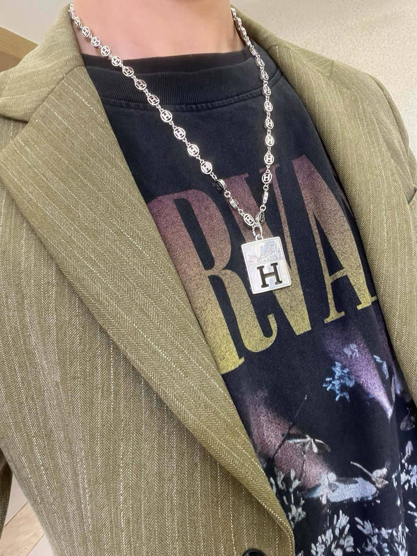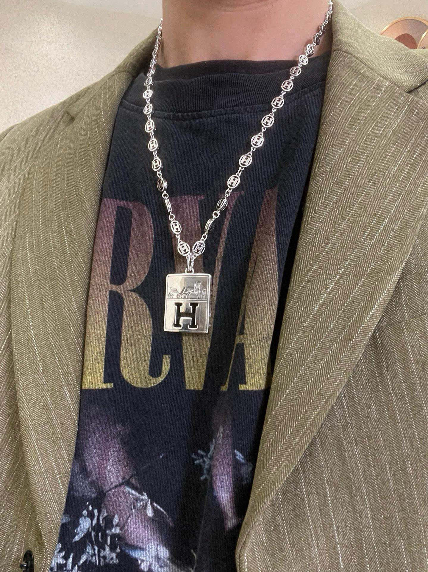 高級感漂う、Hermsのネックレス。シルバーの光沢が美しく、チェーン部分にはブランドの「H」モチーフが連なっています。大きな「H」のプレートが特徴的で、エレガントさと存在感を兼ね備えています。 tensions がついており、長さ調整も楽。オシャレな女性のための、華やかなアクセサリーです。