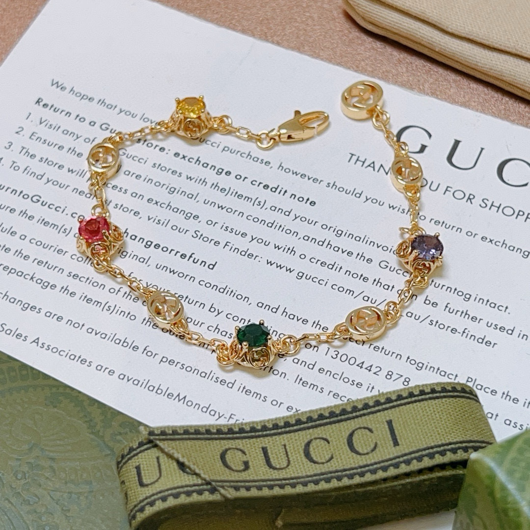 デザインは、ブランドの象徴であるGGモチーフが連なったチェーンに、赤、緑、黄色、紫の4色のストーンが華やかに配置されています。