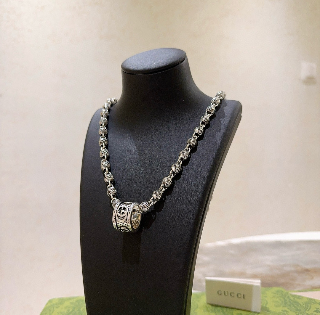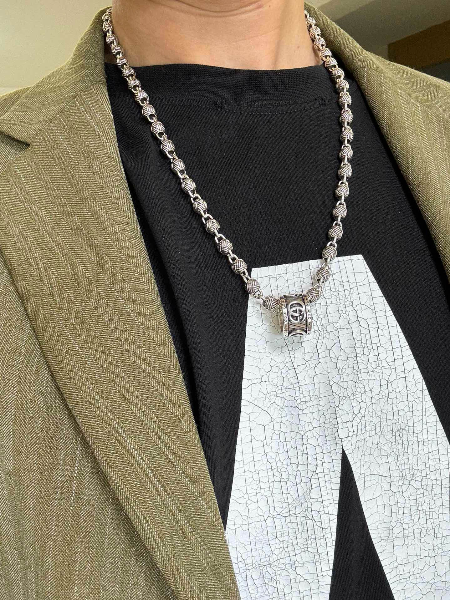 このネックレスの最大の特徴は、その独特なデザインと、素材の質感です。編み込みの細部にまでこだわった作りが、高級感と個性を兼ね備えています。また、円筒形のチャームは、首元に存在感を演出し、さりげないアクセントになります。