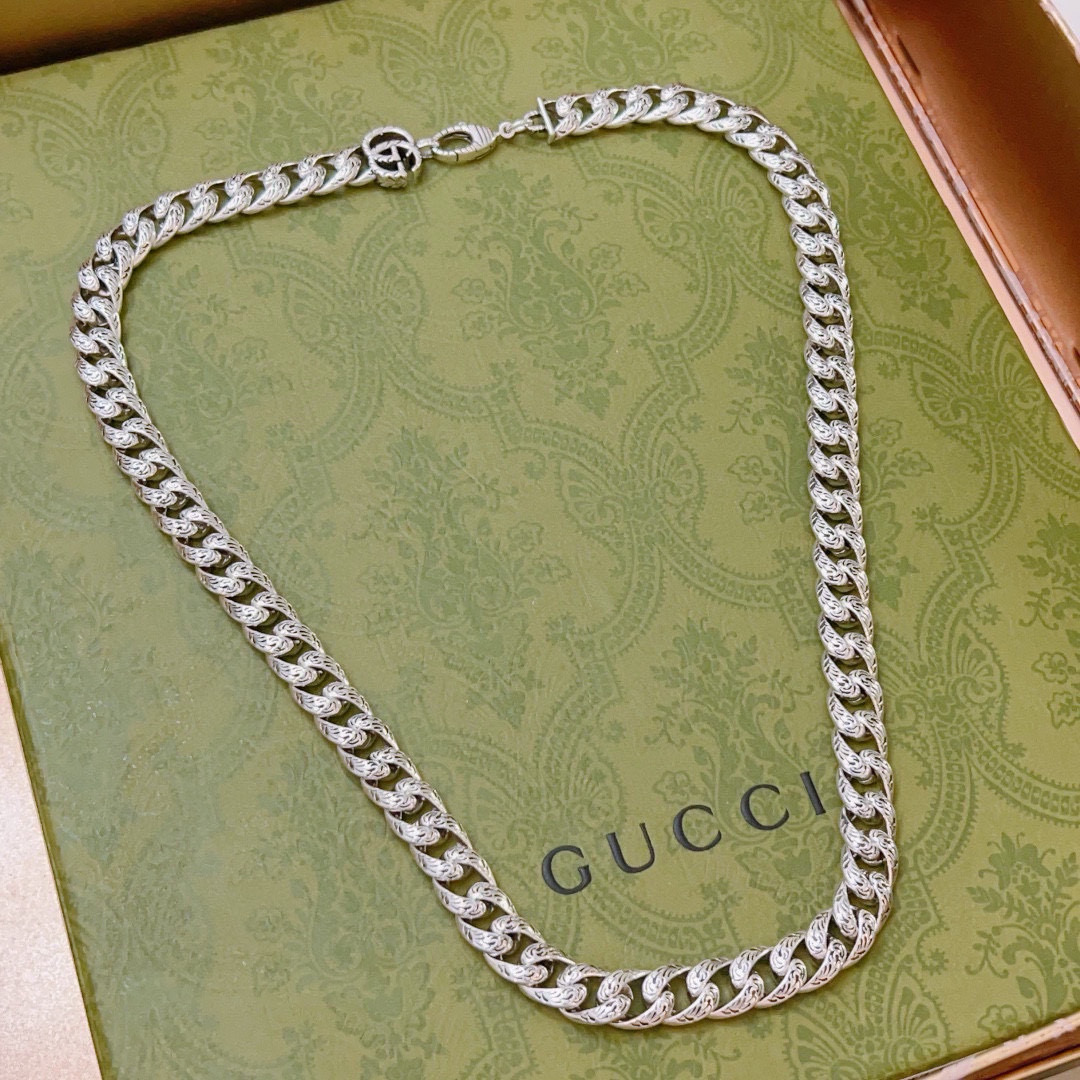 このネックレスは、高級感あふれるシルバー素材で作られており、洗練されたデザインが特徴です。太めのチェーンに、ブランドの象徴であるGGロゴが繊細に刻まれており、光を受けてきらめきます