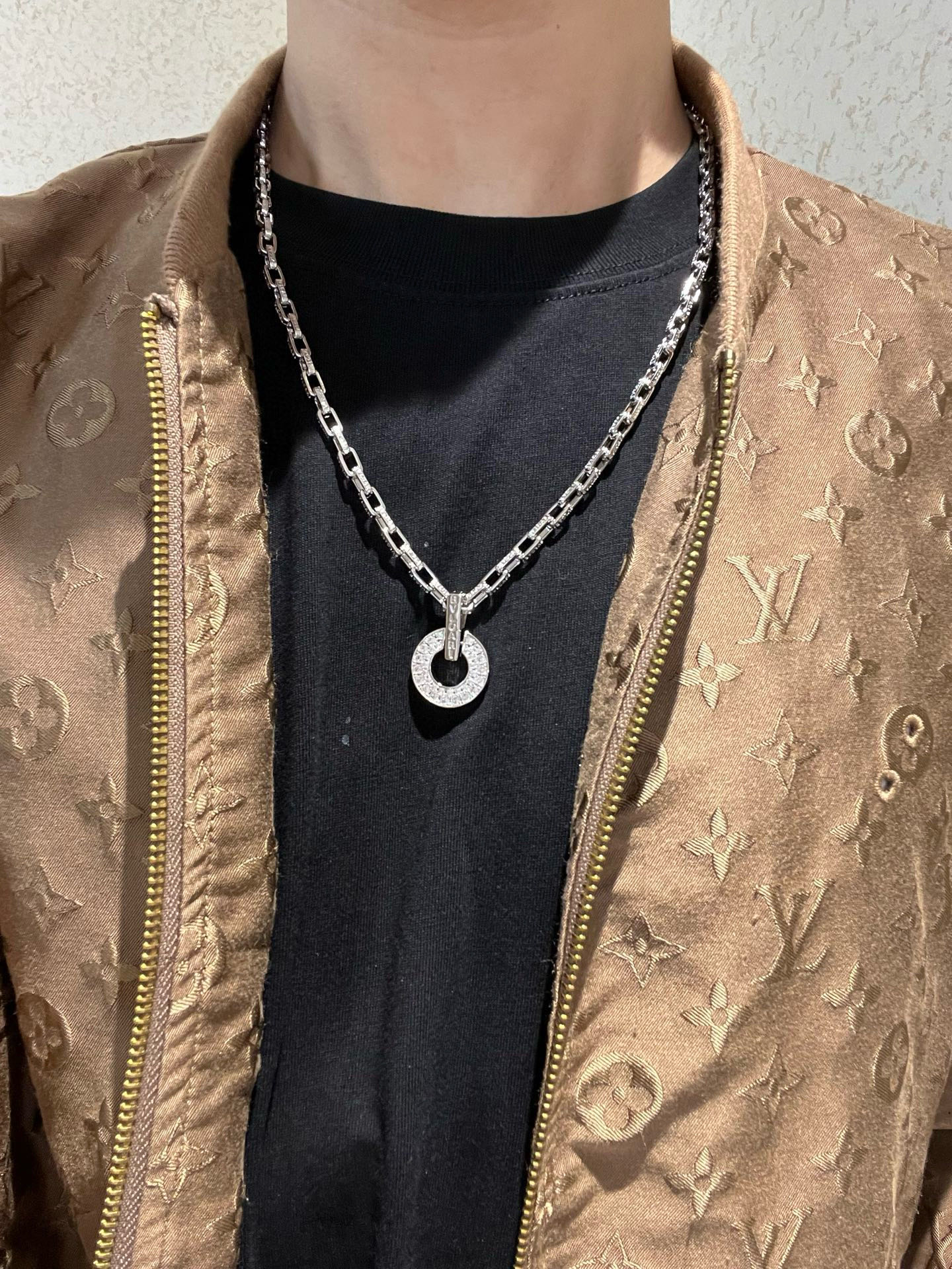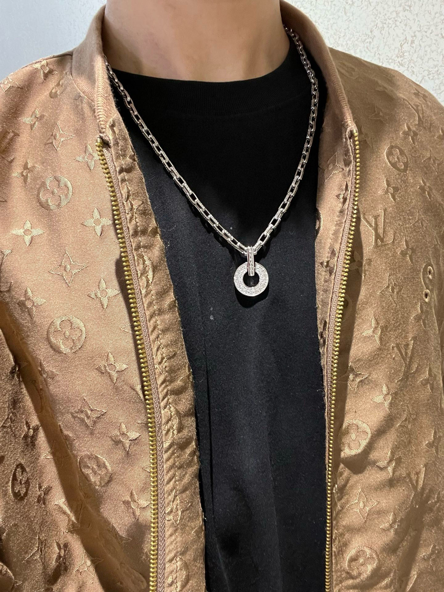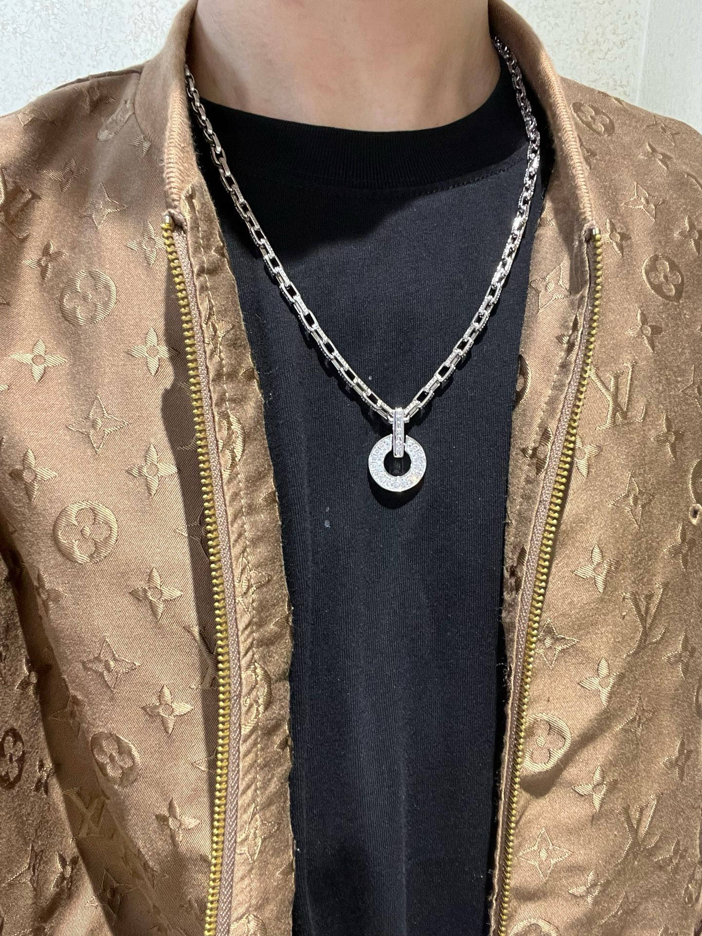 中央には、きらめくダイヤモンドがちりばめられた円形のペンダントが、優雅に輝きます。