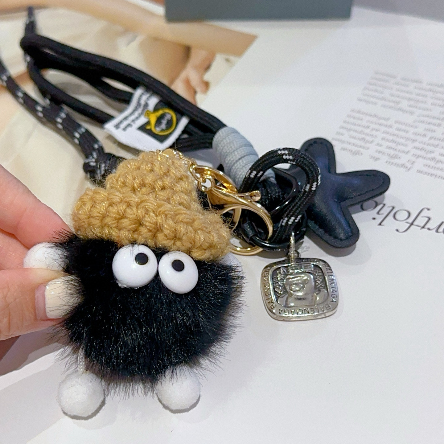 黒いフェイクファーのポムポムに、かわいい編み込みの帽子と大きな目が特徴のキーホルダー。