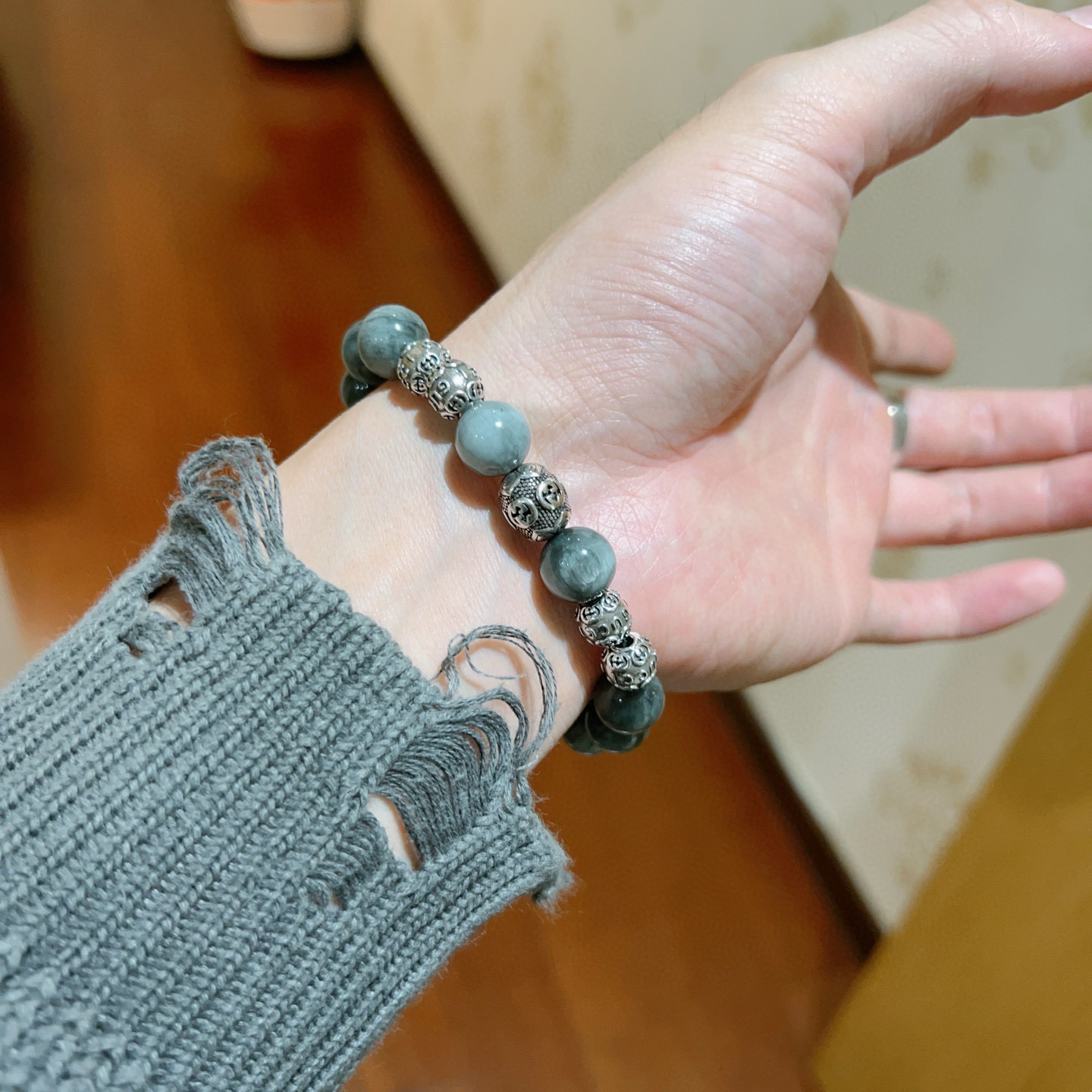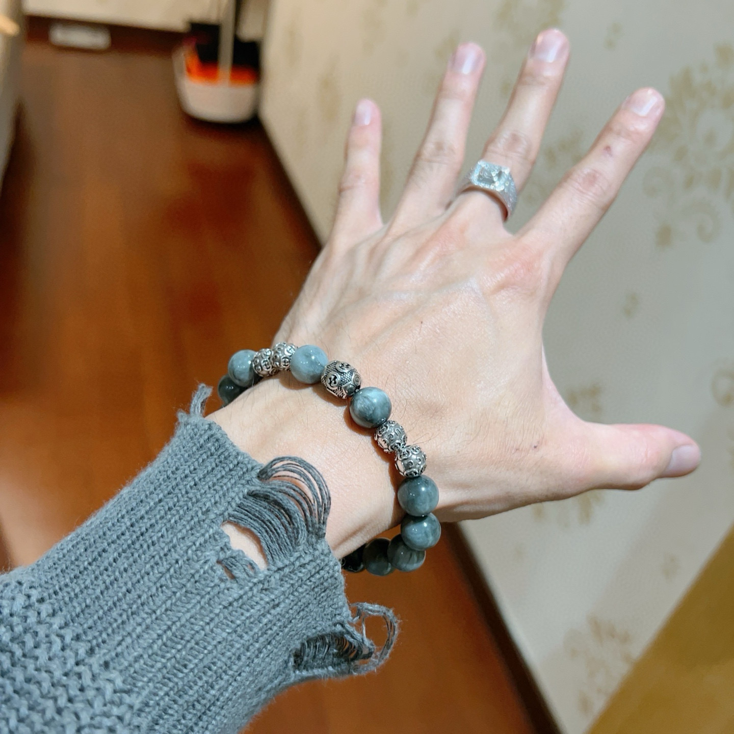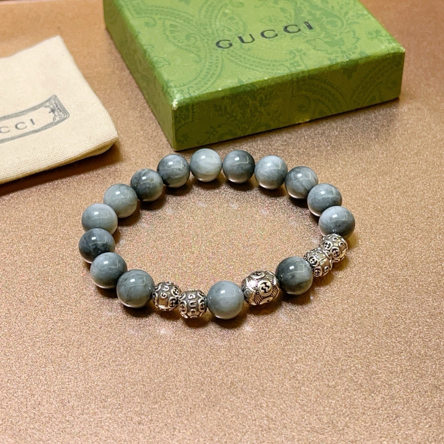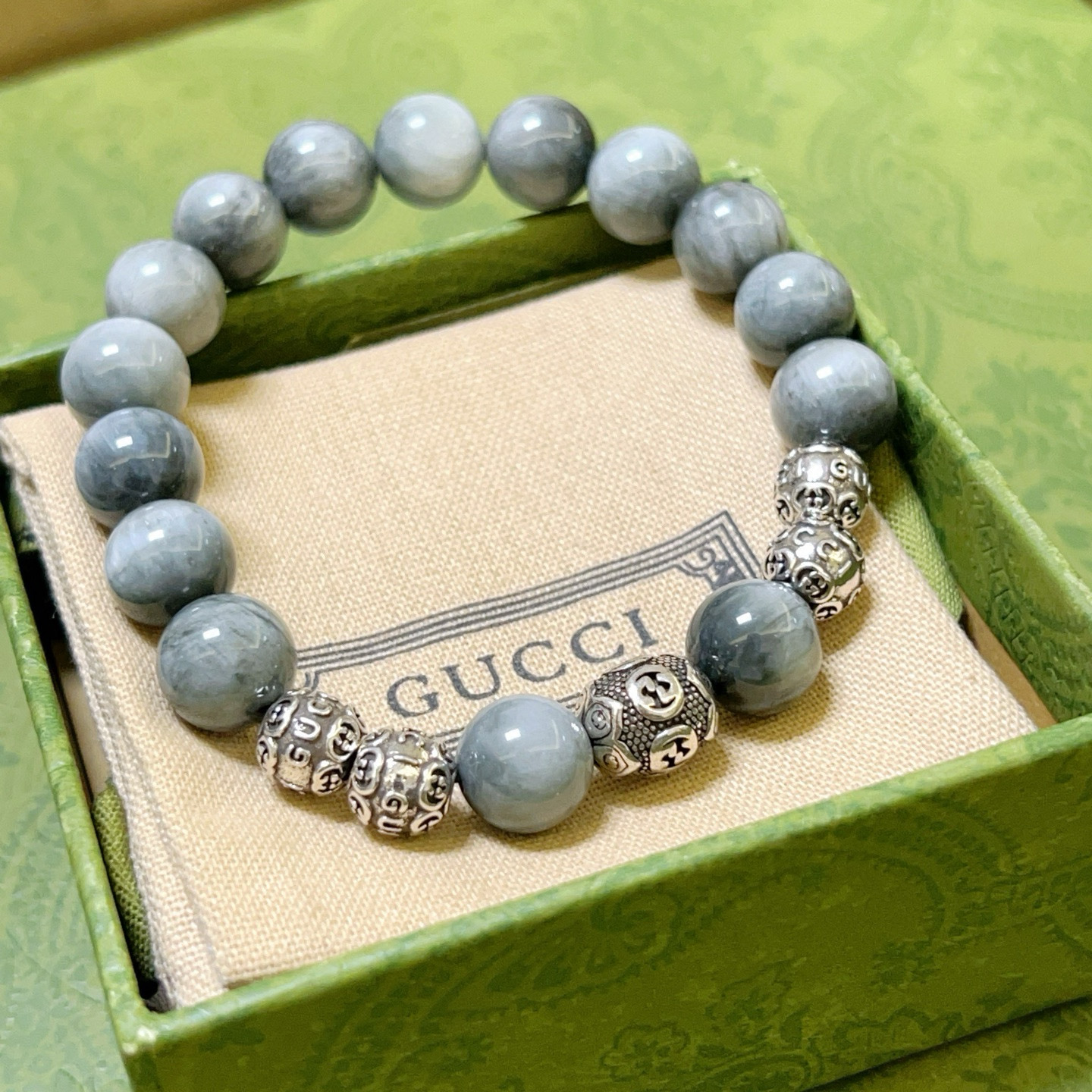グッチのブレスレットは、高級感あふれるグレージュの天然石と、シルバー調の装飾ビーズが調和して、洗練された印象を与えます。