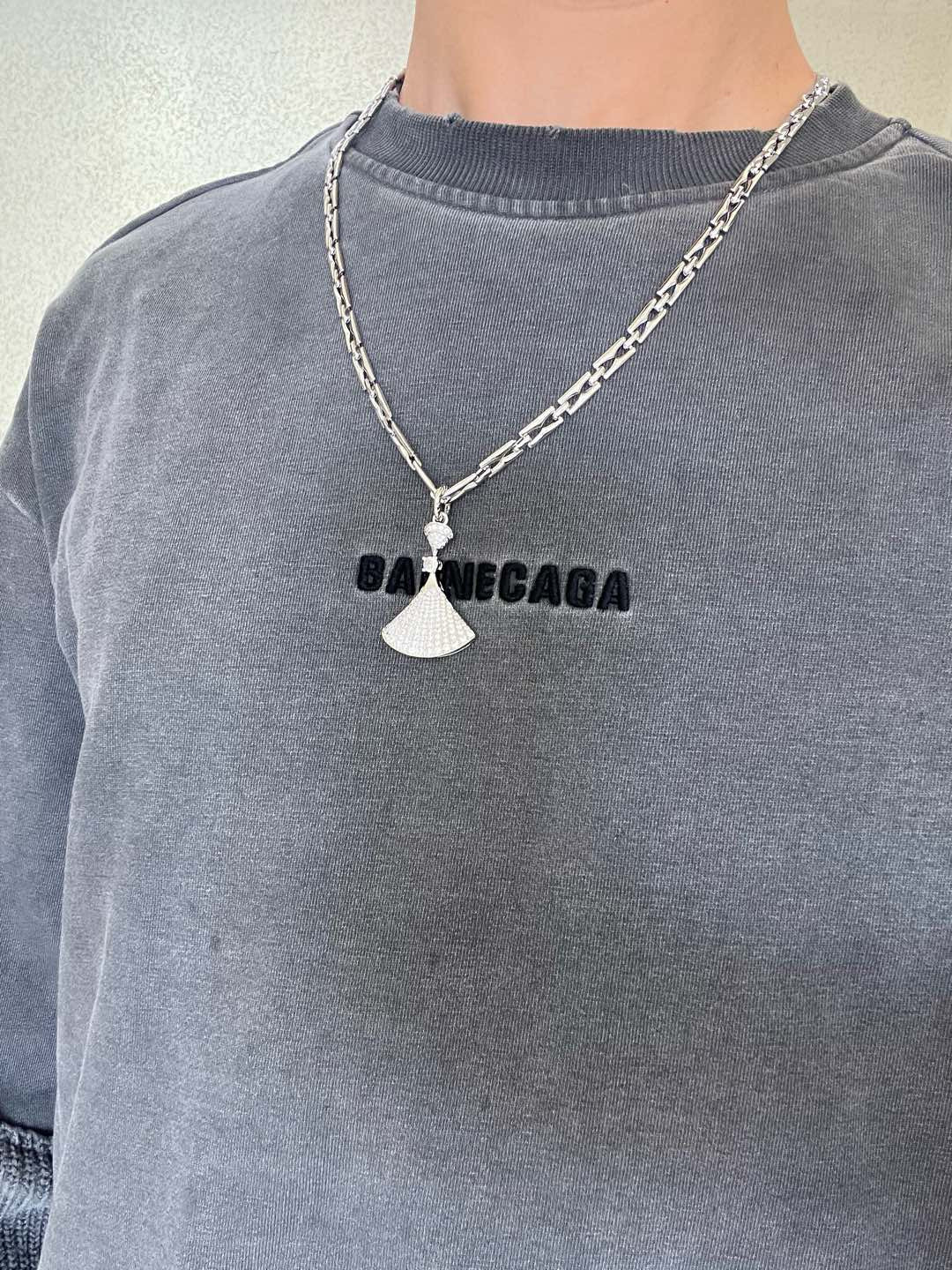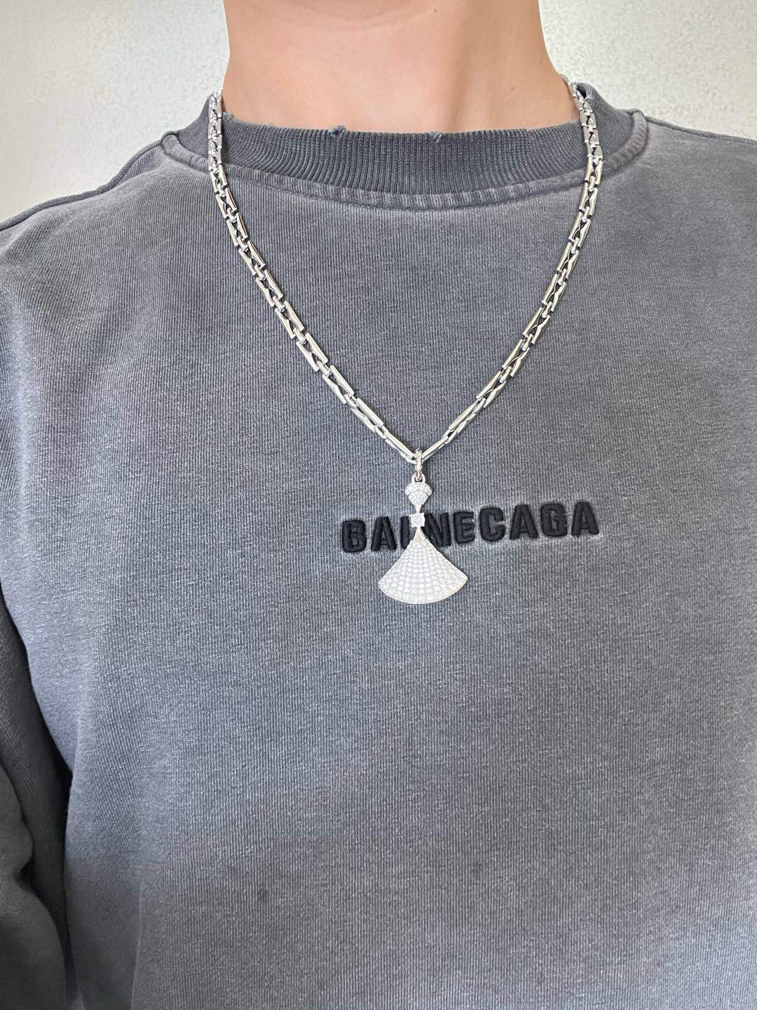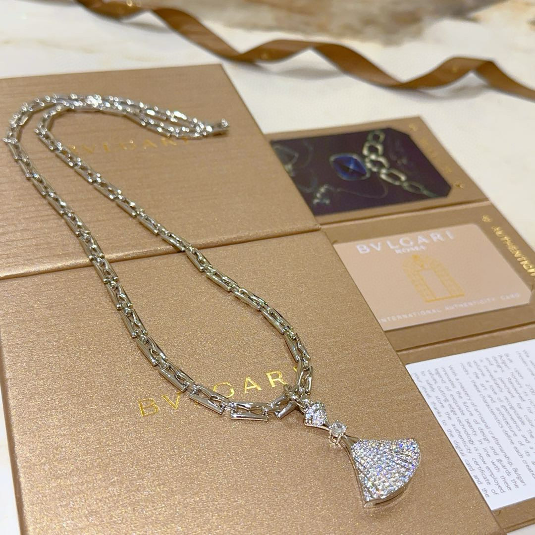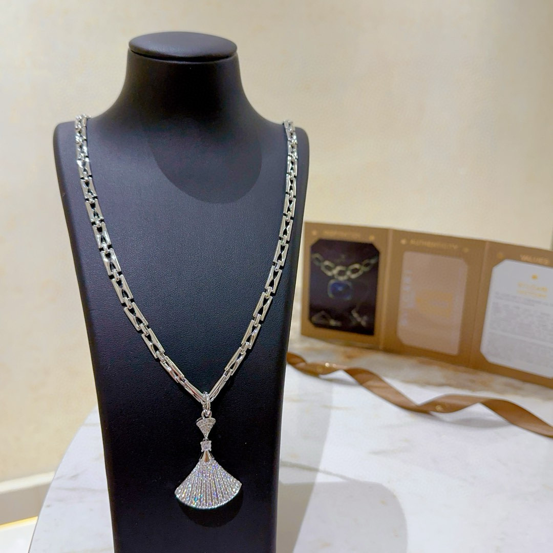 華やかなBVLGARI ネックレス。ファン型のチャームがきらめく、高級感あふれる逸品です。スターリングシルバー製のチェーンと、きらびやかなダイヤモンドが施された扇形のチャームが、上品な輝きを放ちます。