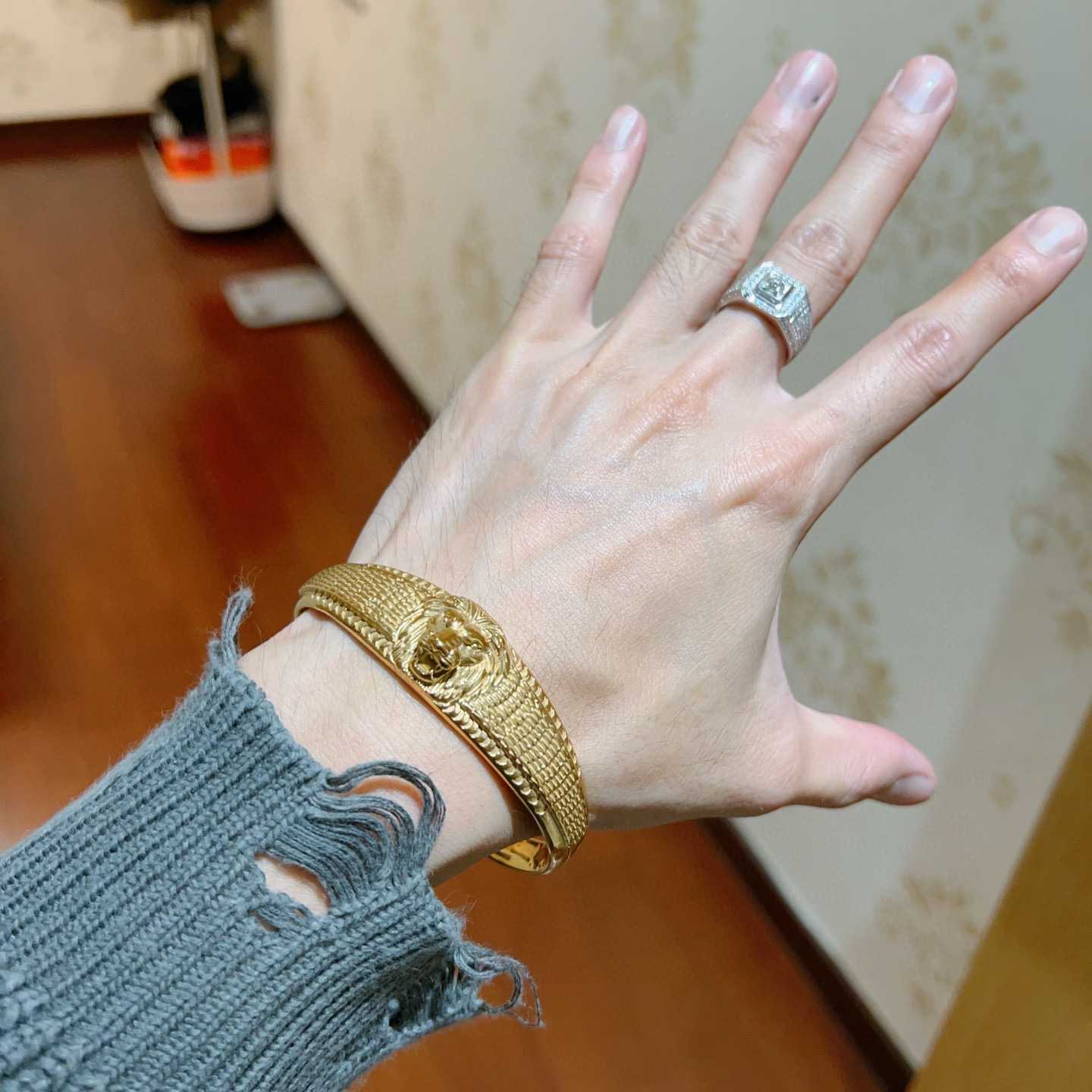金色のGUCCIブレスレットは、力強いライオンの頭像が特徴です。高級感のある金属素材で作られており、光を受けて輝きます。細部まで丁寧に作られたデザインは、まさに贅沢そのものです。