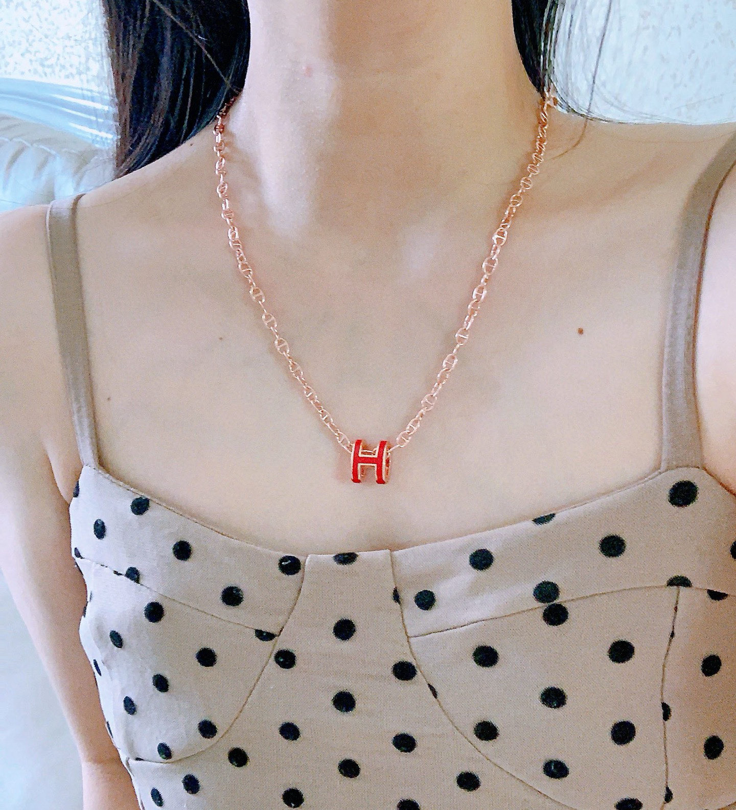 このネックレスは、HERMESのローズゴールドとレッドの組み合わせが魅力的です。 ローズゴールドのチェーンに、鮮やかなレッドの「H」モチーフが輝き、エレガントな存在感を放ちます。デザインはシンプルながらも、ブランドのアイコンを効果的に表現しており、普段使いから特別な日のアクセントまで、幅広いシーンで活躍します。