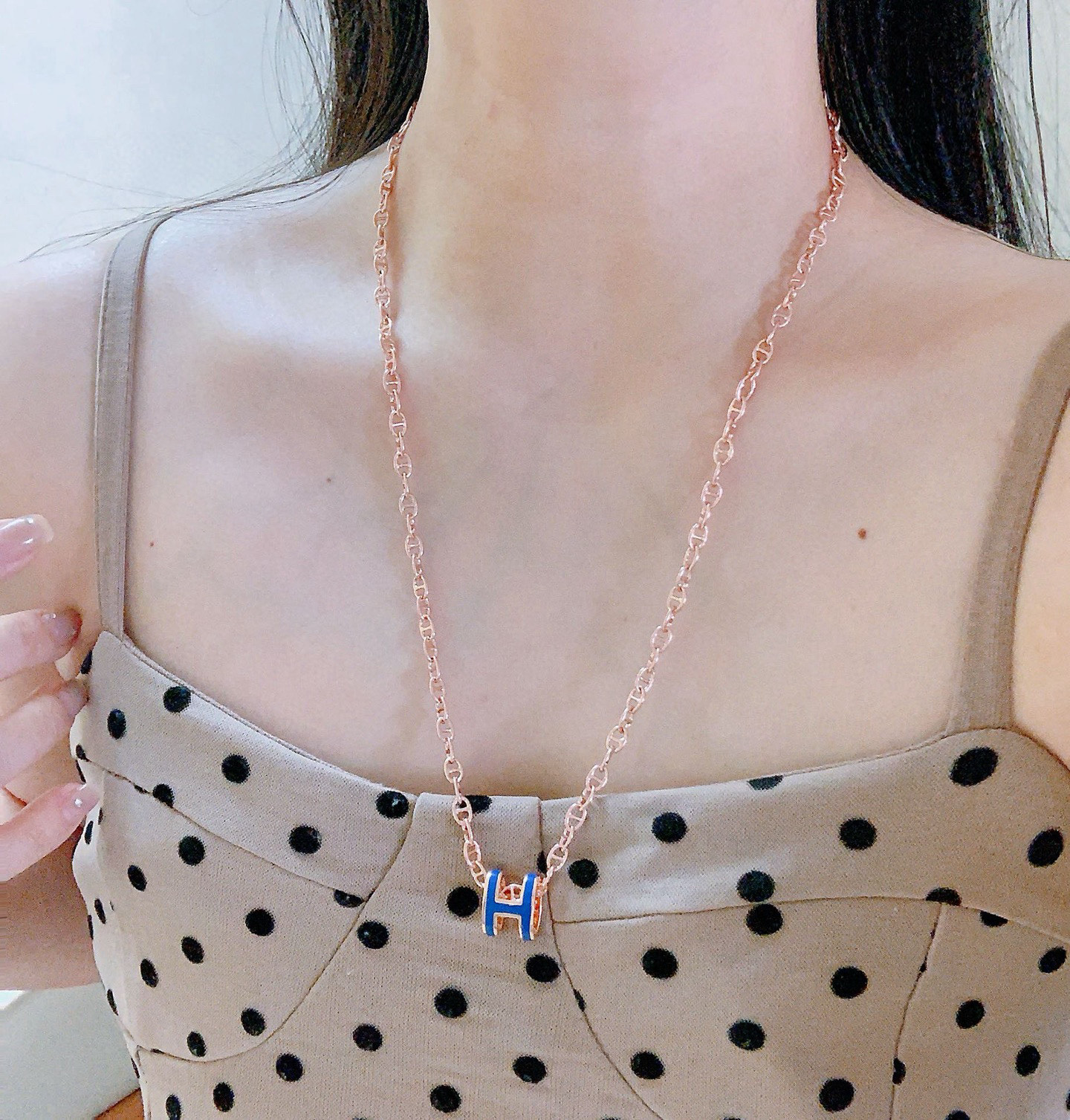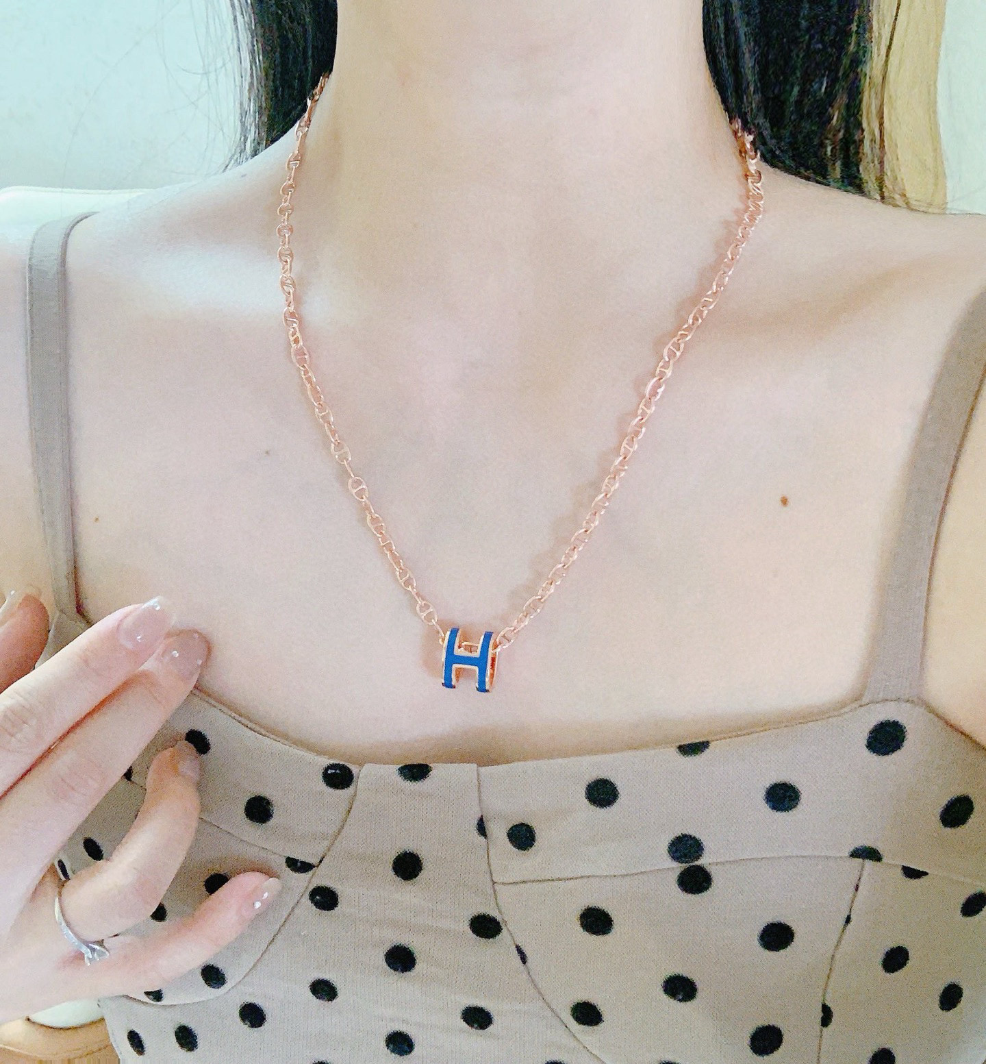 高級感のあるローズゴールドチェーンに、ブランドの象徴である「H」のモチーフがブルーのエナメルで飾られており、さりげない華やかさを演出します。