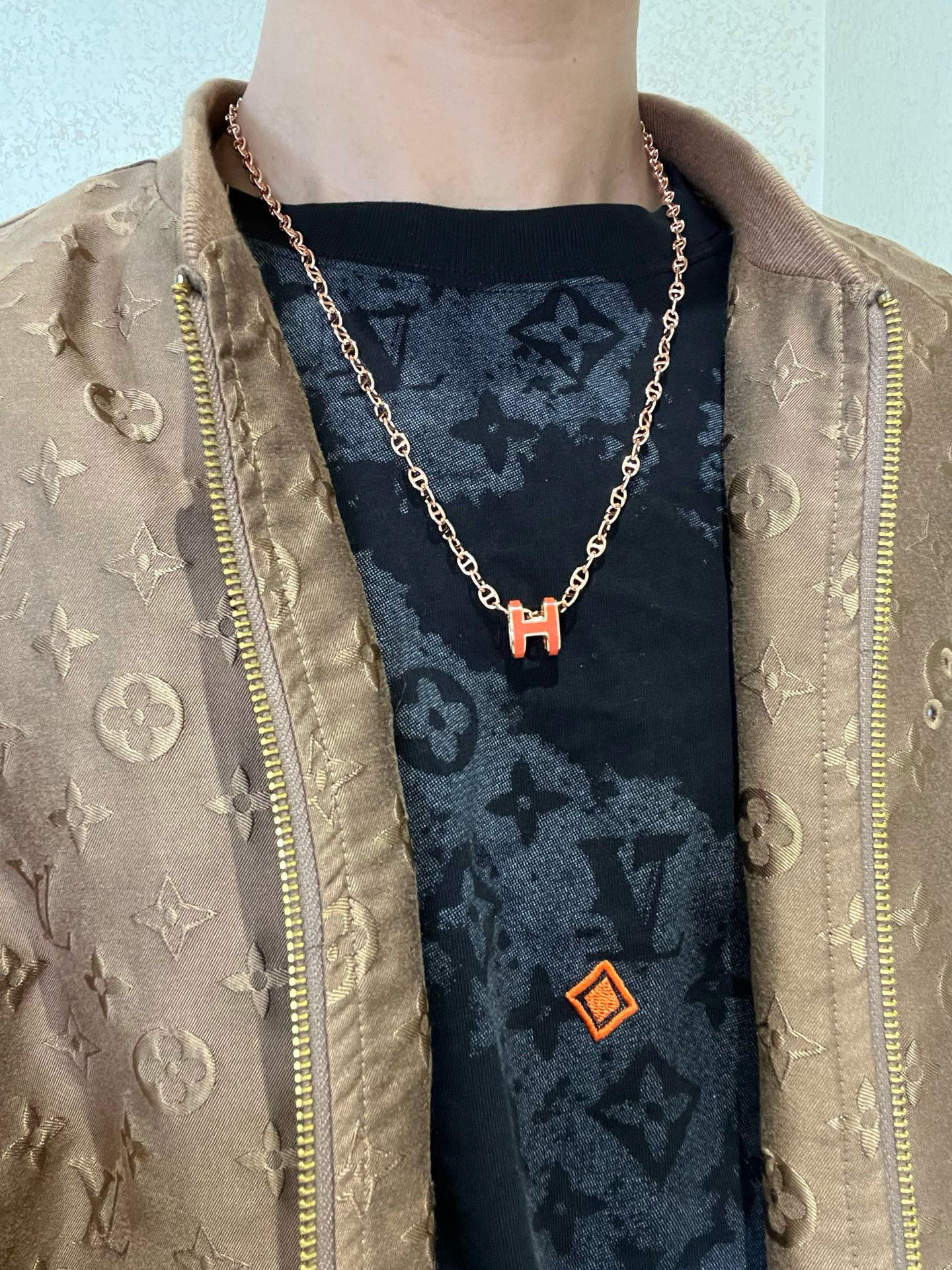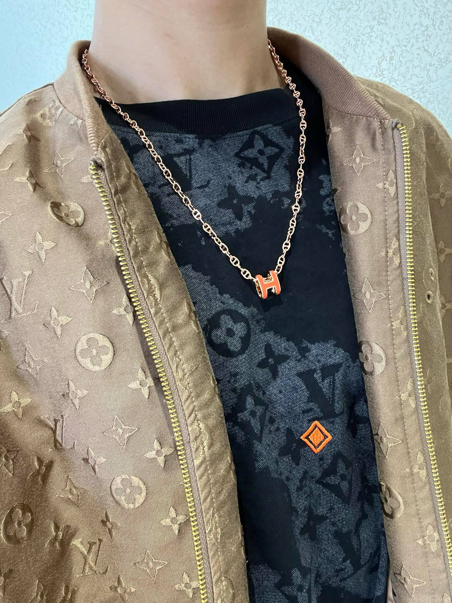 ローズゴールドの輝きと、オレンジの鮮やかなアンティーク調の「H」モチーフが絶妙なコントラストを生み出します。