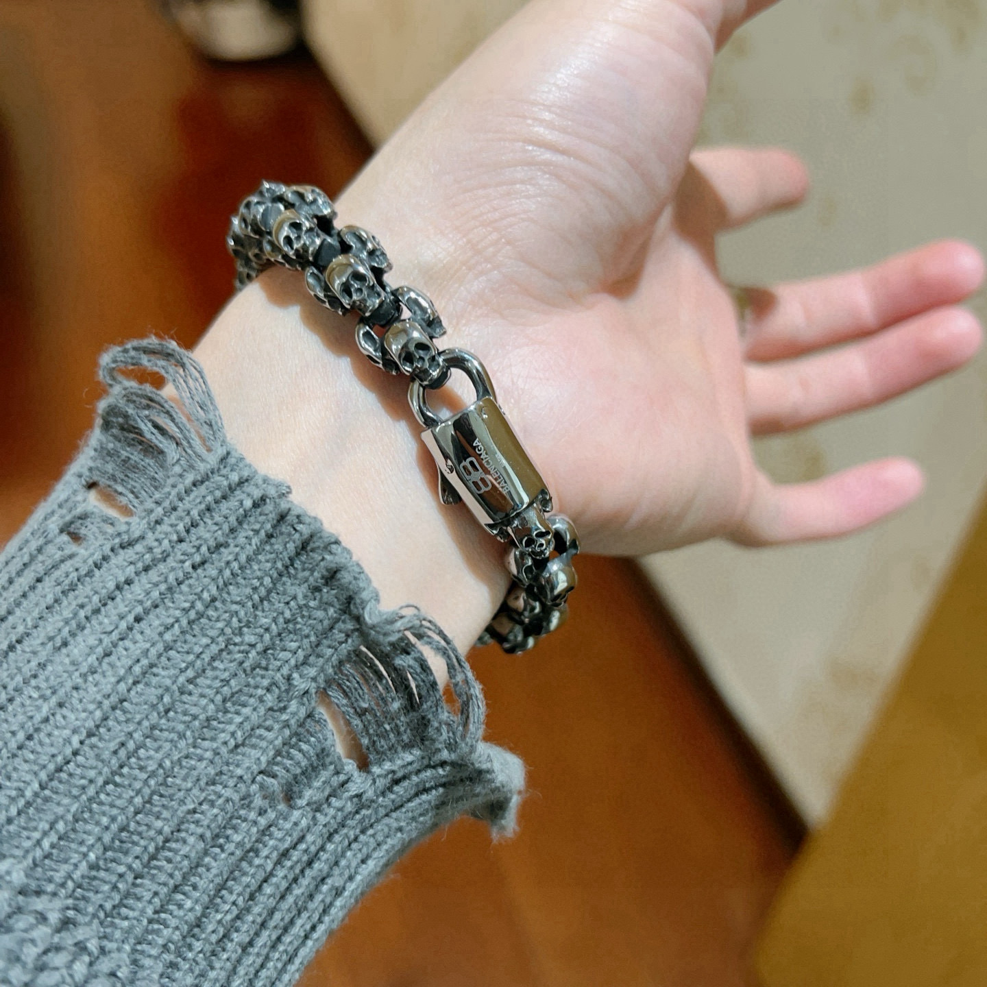 このブレスレットは、特徴的なスカルモチーフが連なった、1つの金属製の作業です。