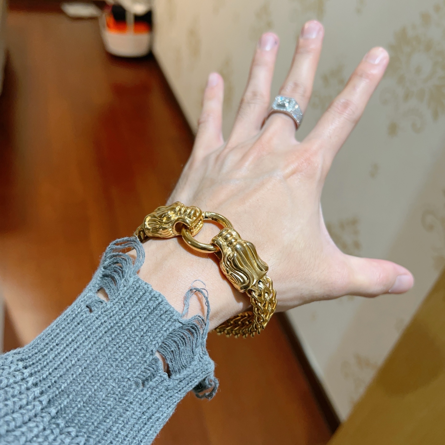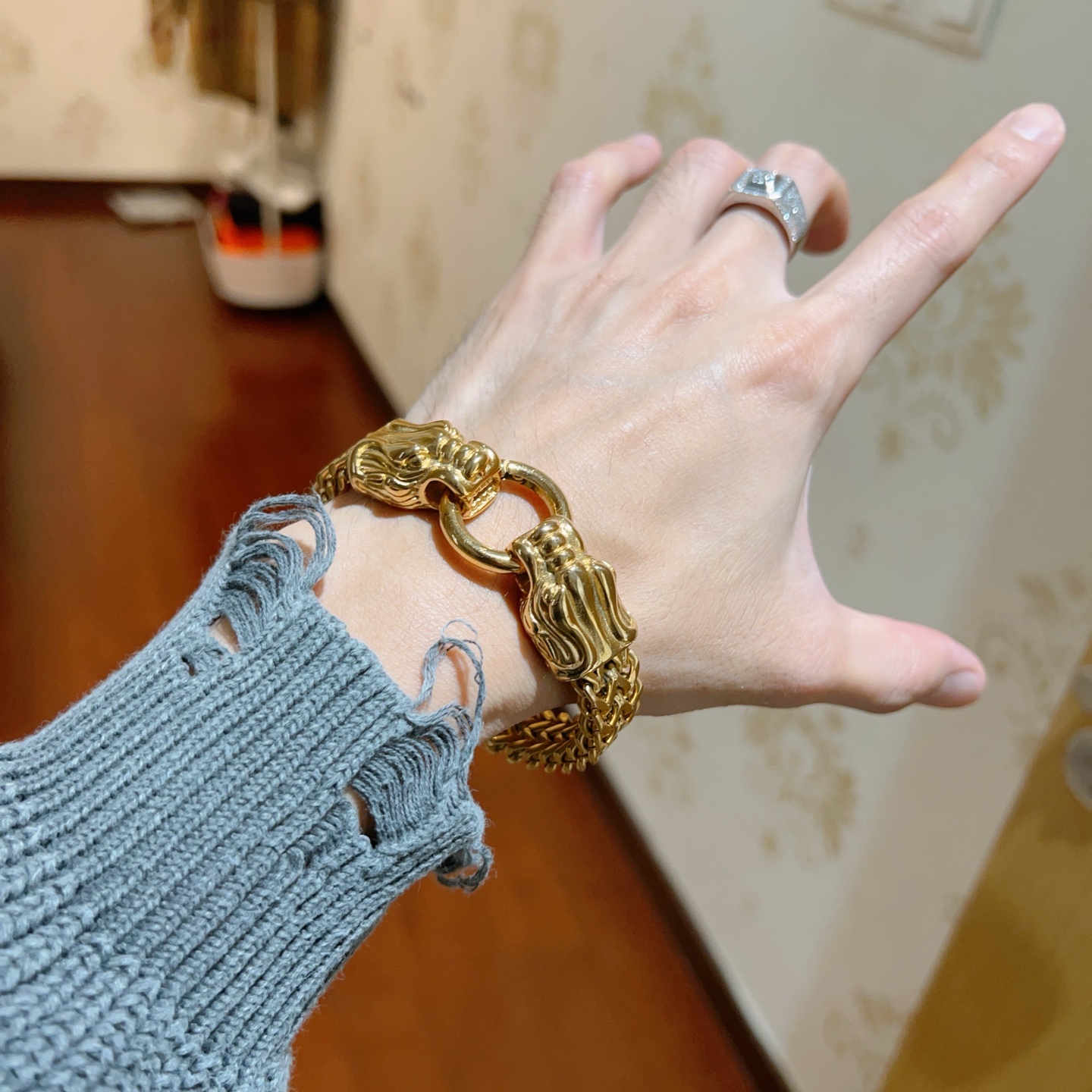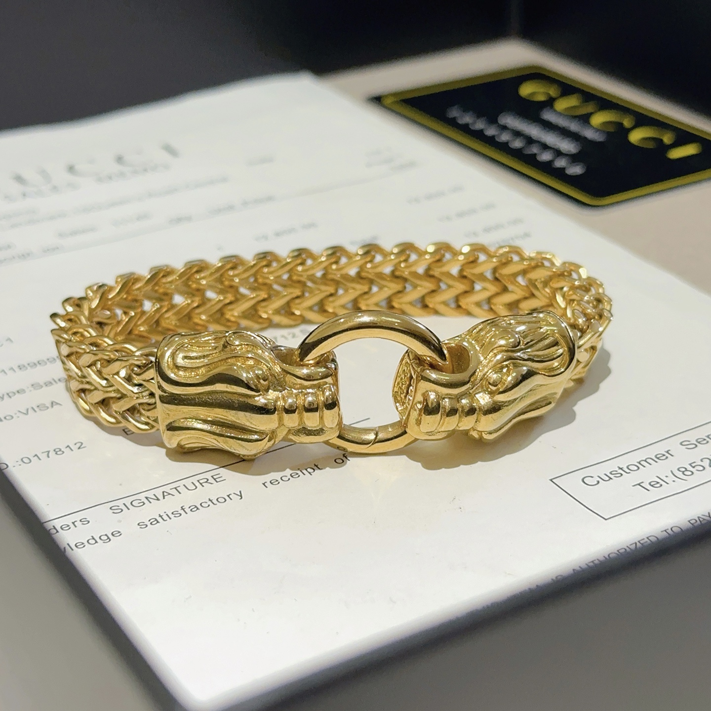 編み込みのチェーンと、力強いライオンの頭部がデザインされた留め具が、洗練された印象を与えます。