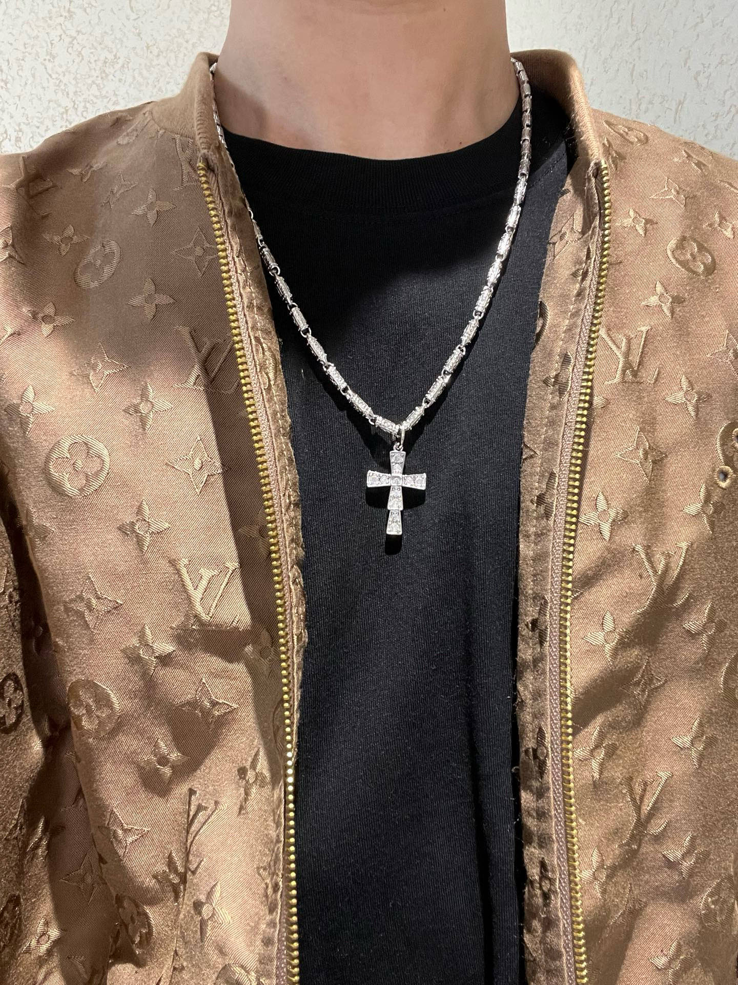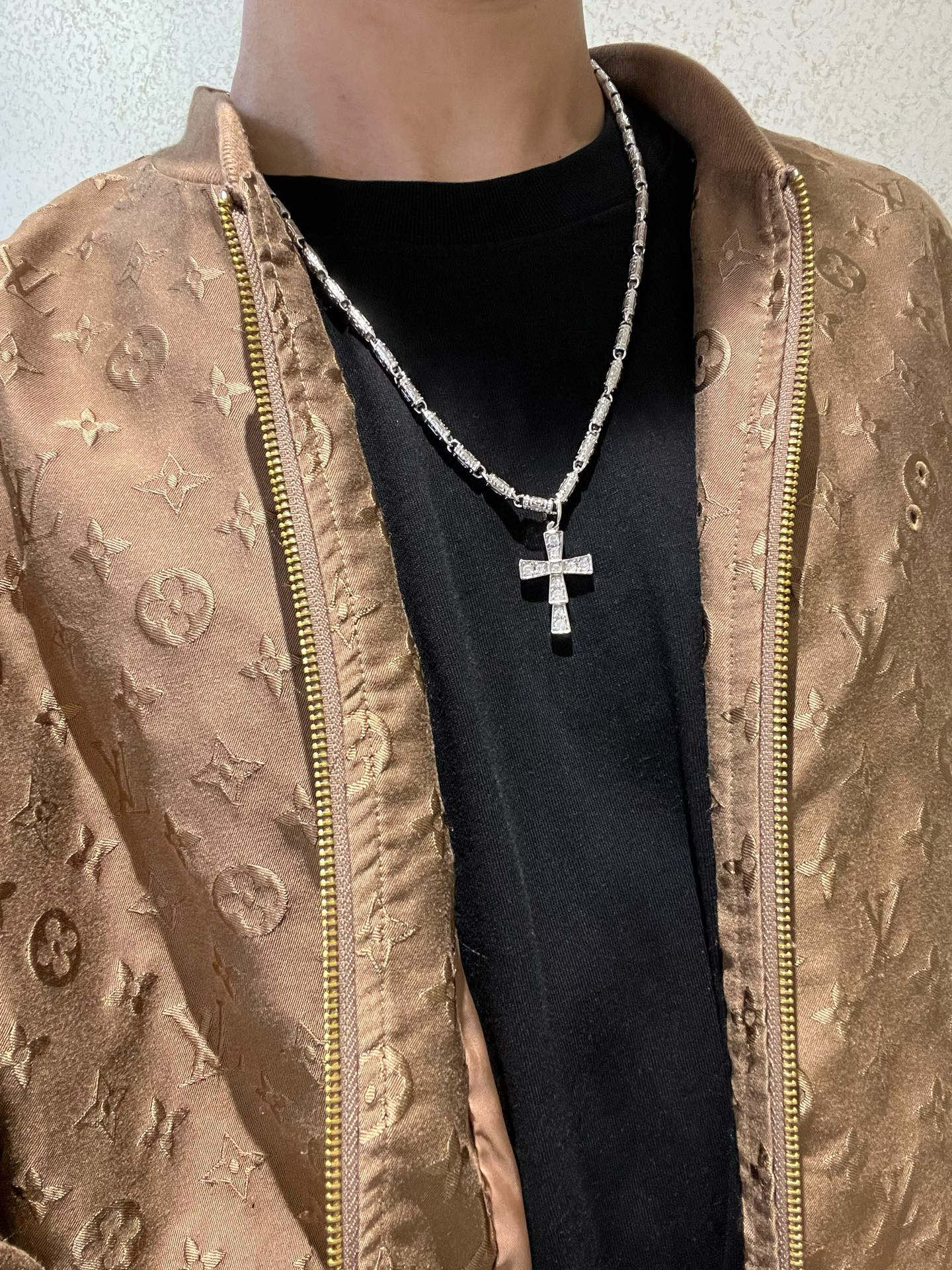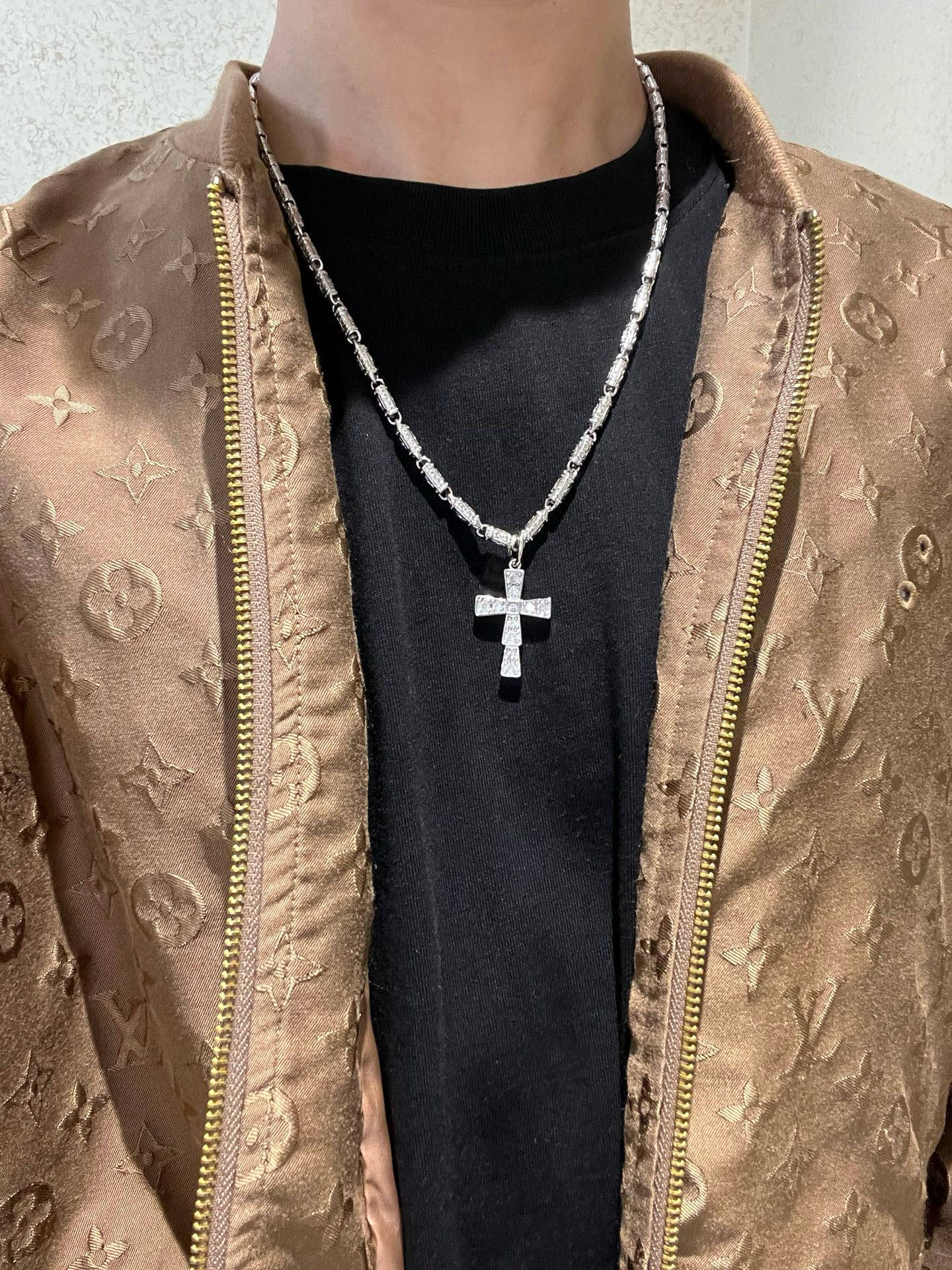 シルバー調のメタルチェーンに、ダイヤモンドのような輝きのストーンがふんだんにあしらわれた、存在感抜群のクロスネックレスです