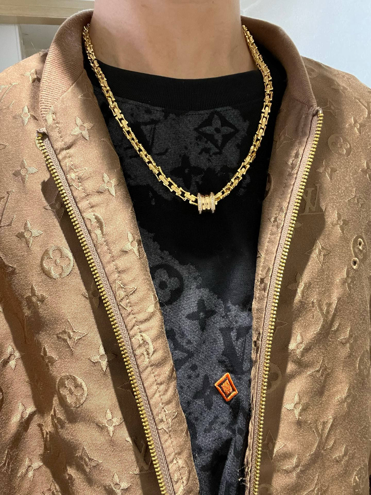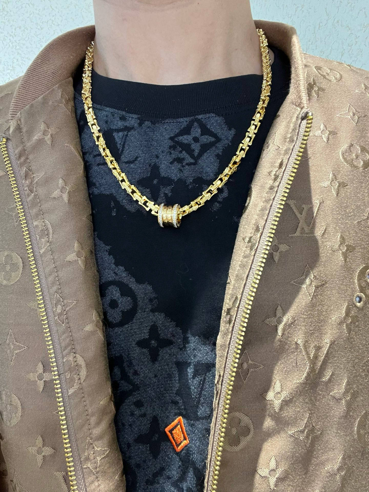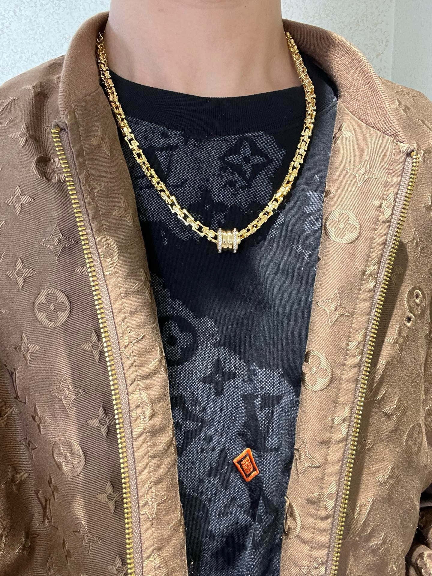 BVLGARI ネックレスは、高級感あふれるゴールドカラーが特徴です。リアルな光沢と、独特のリンクデザインが、洗練された印象を与えます。中央には、ダイヤモンドがちりばめられたロゴマークが輝き、スタイルを引き立てます