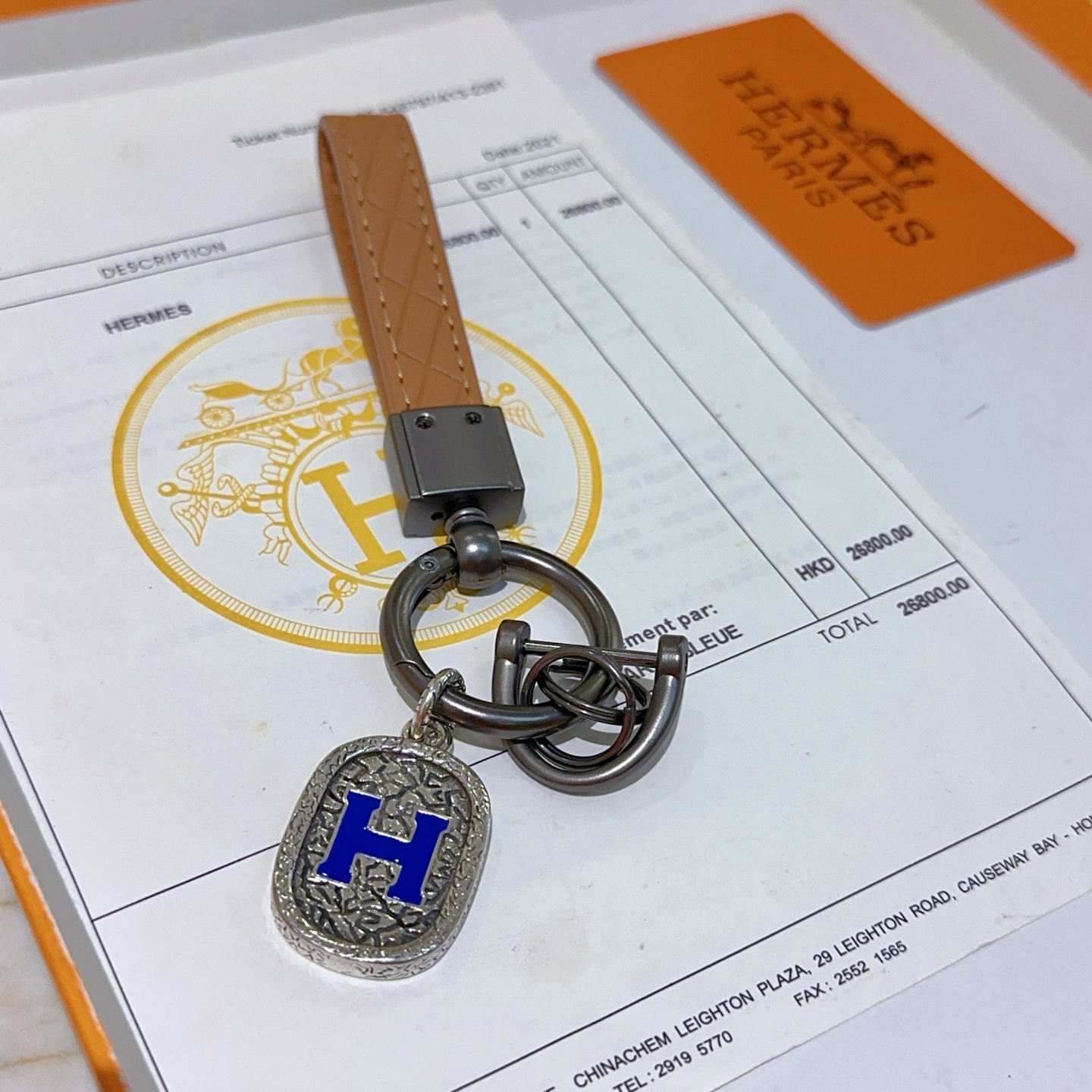 高級感のある本革のストラップと、エレガントなHロゴのチャームが特徴のHERMESキーホルダー。