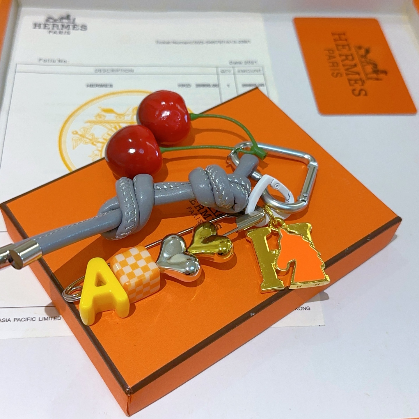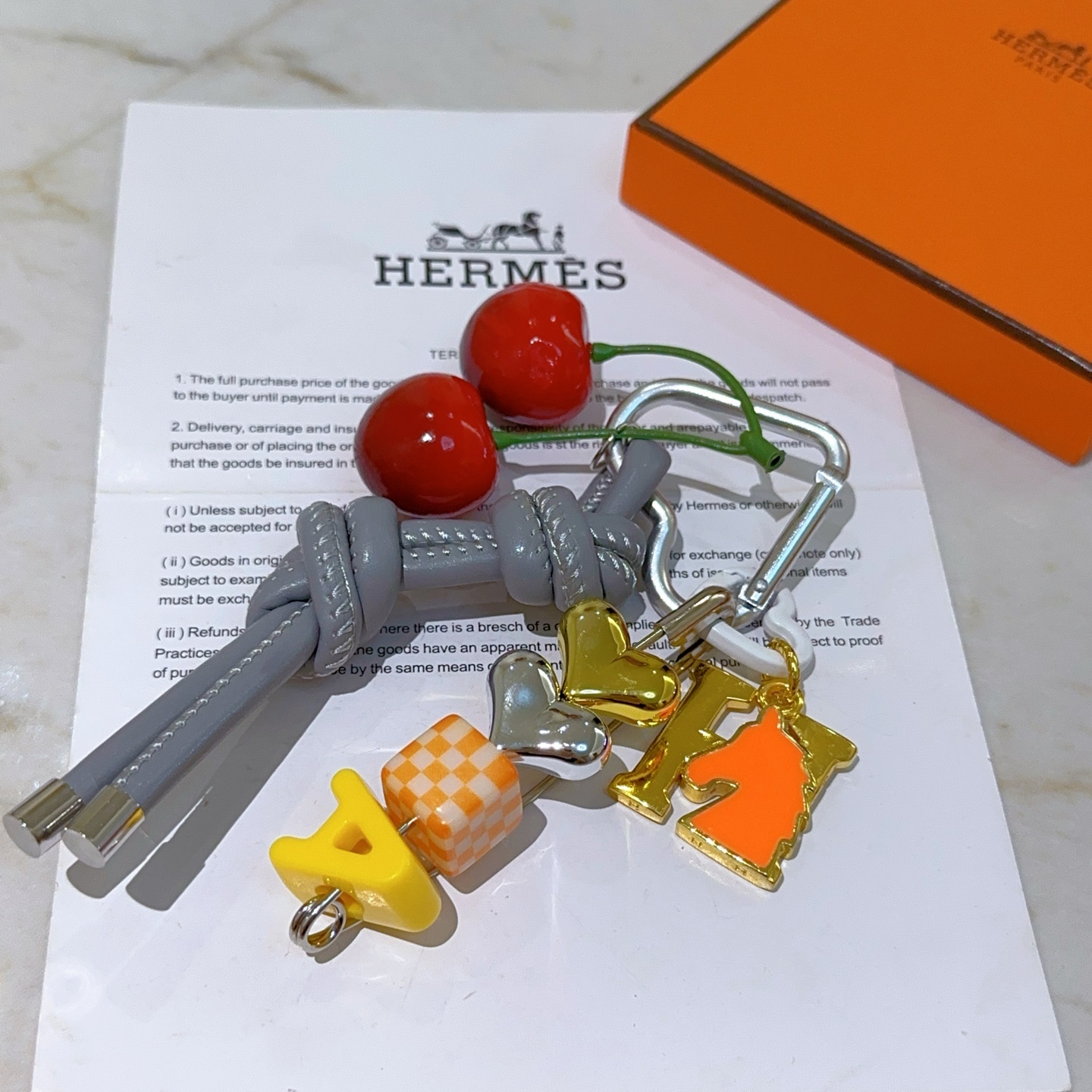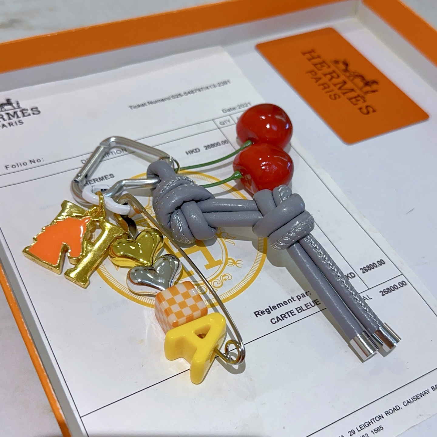 このキーホルダーは、高級感のあるグレーのレザーと、鮮やかな赤いチェリーデザインが特徴です。