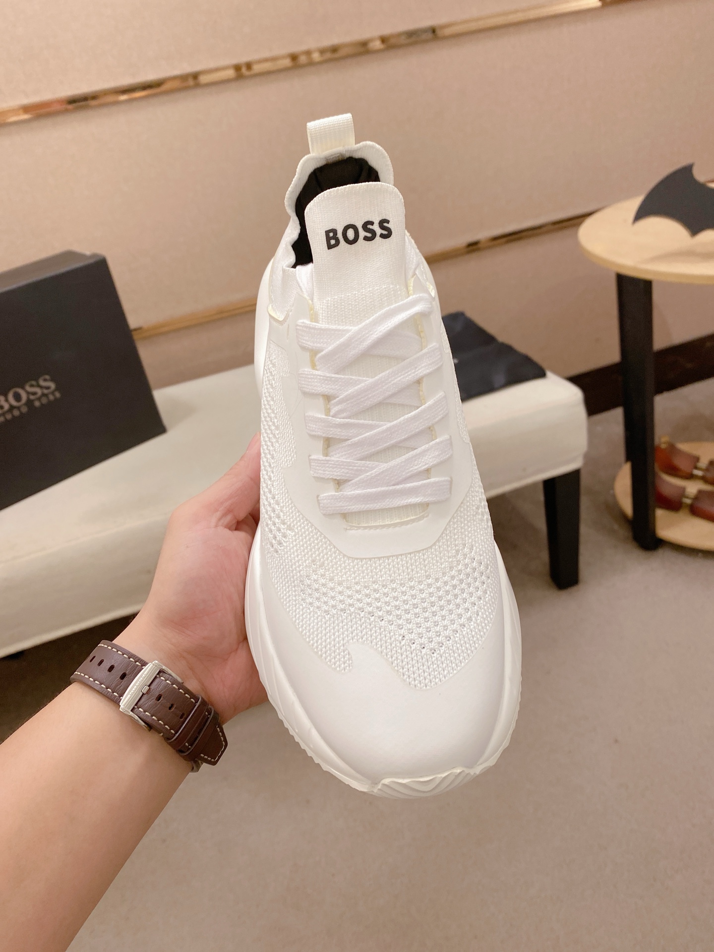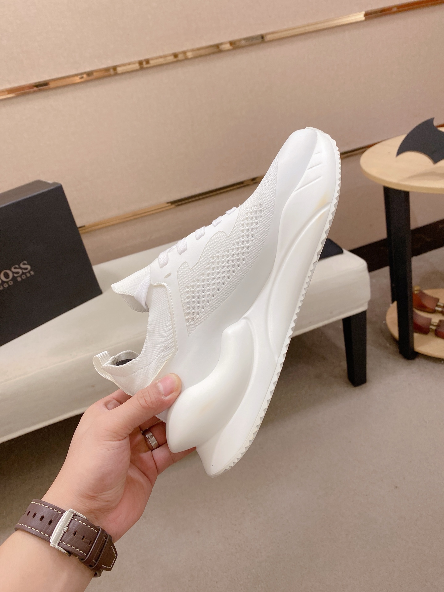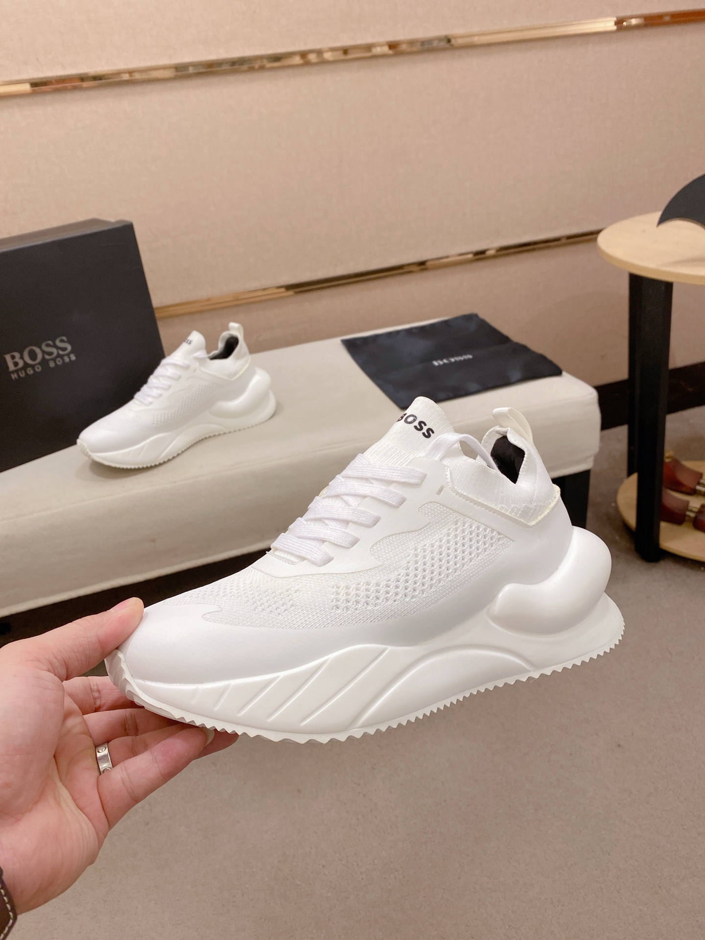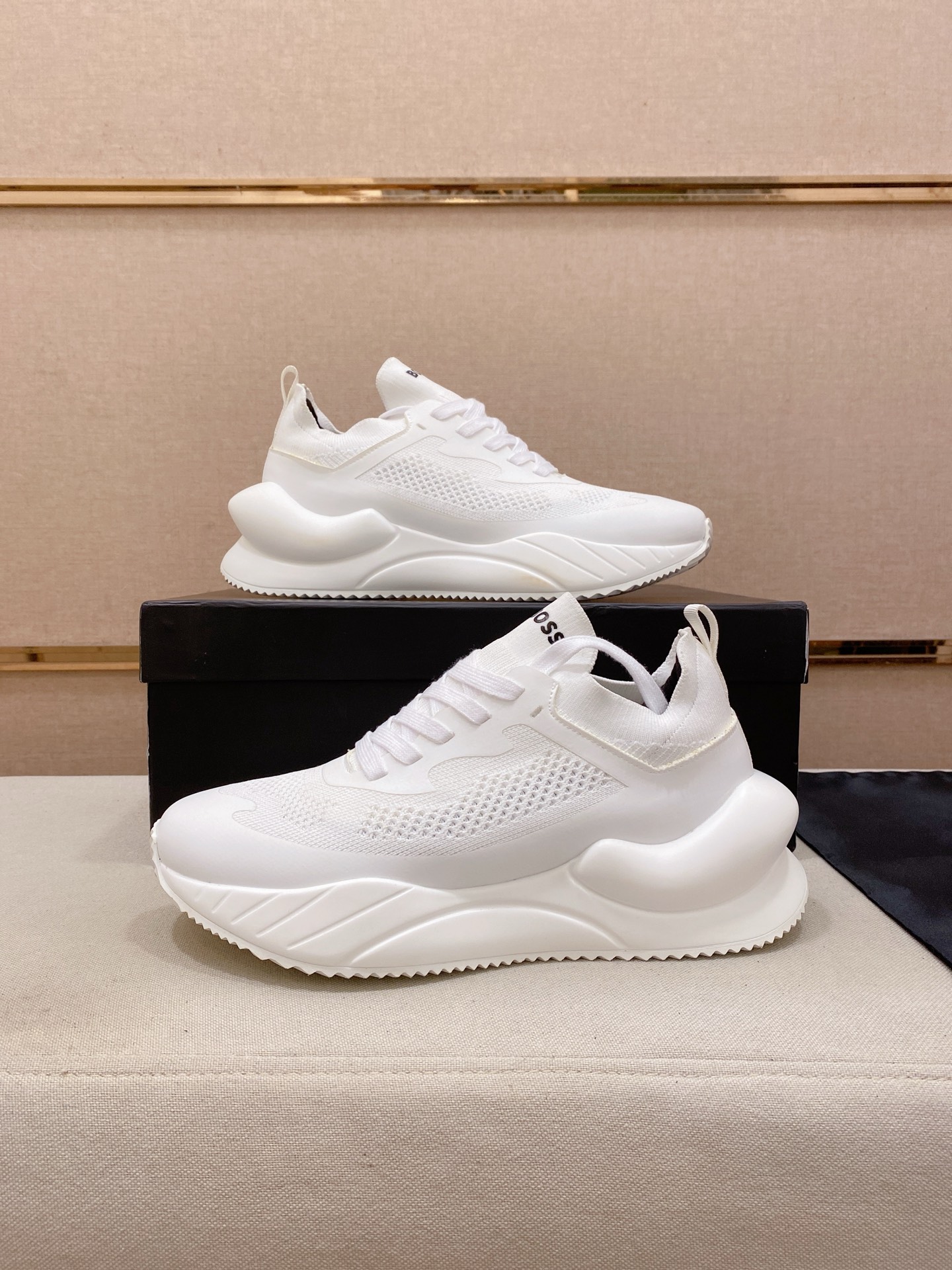 このホグスのメンズスニーカーは、洗練されたホワイトカラーが特徴です。通気性に優れたメッシュ素材を採用し、快適な履き心地を実現しています。厚みのあるミッドソールは、足を包み込むようなクッション性で、長時間の着用でも疲れにくい設計です。また、サイドには「BOSS」のロゴが見え、ブランドの存在感を際立たせています。