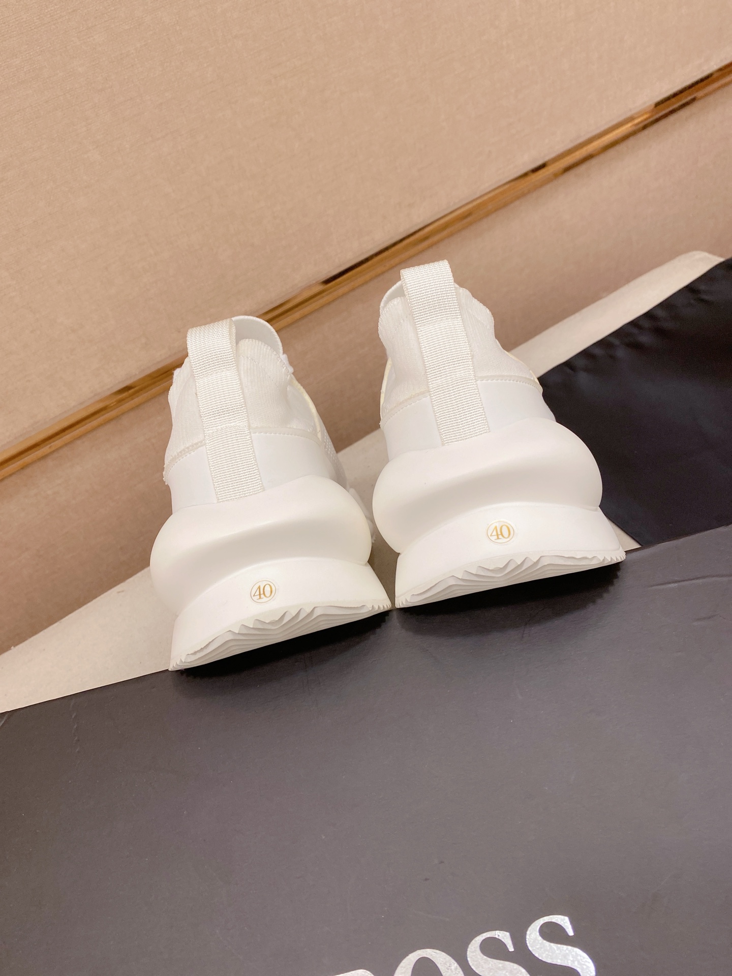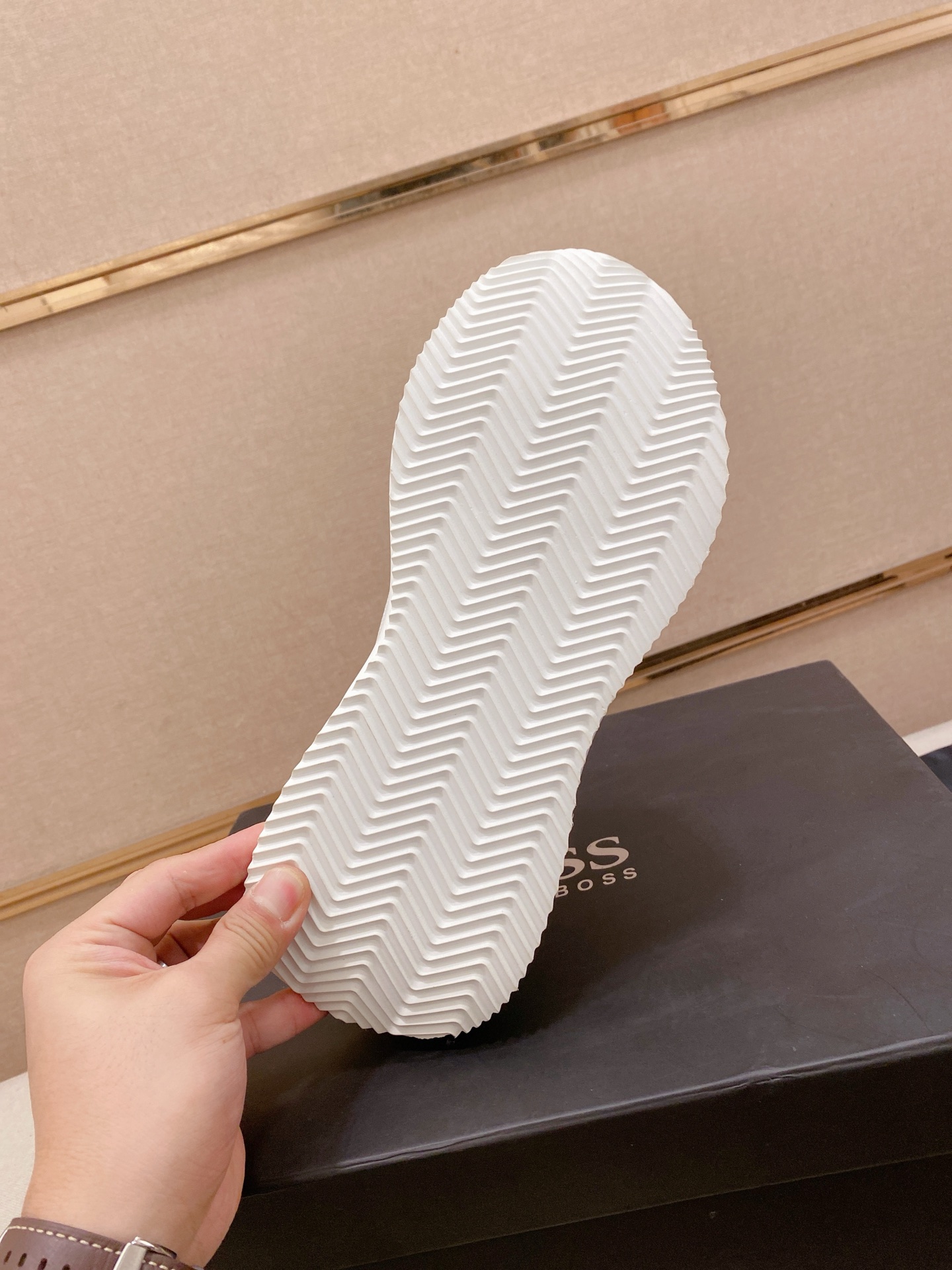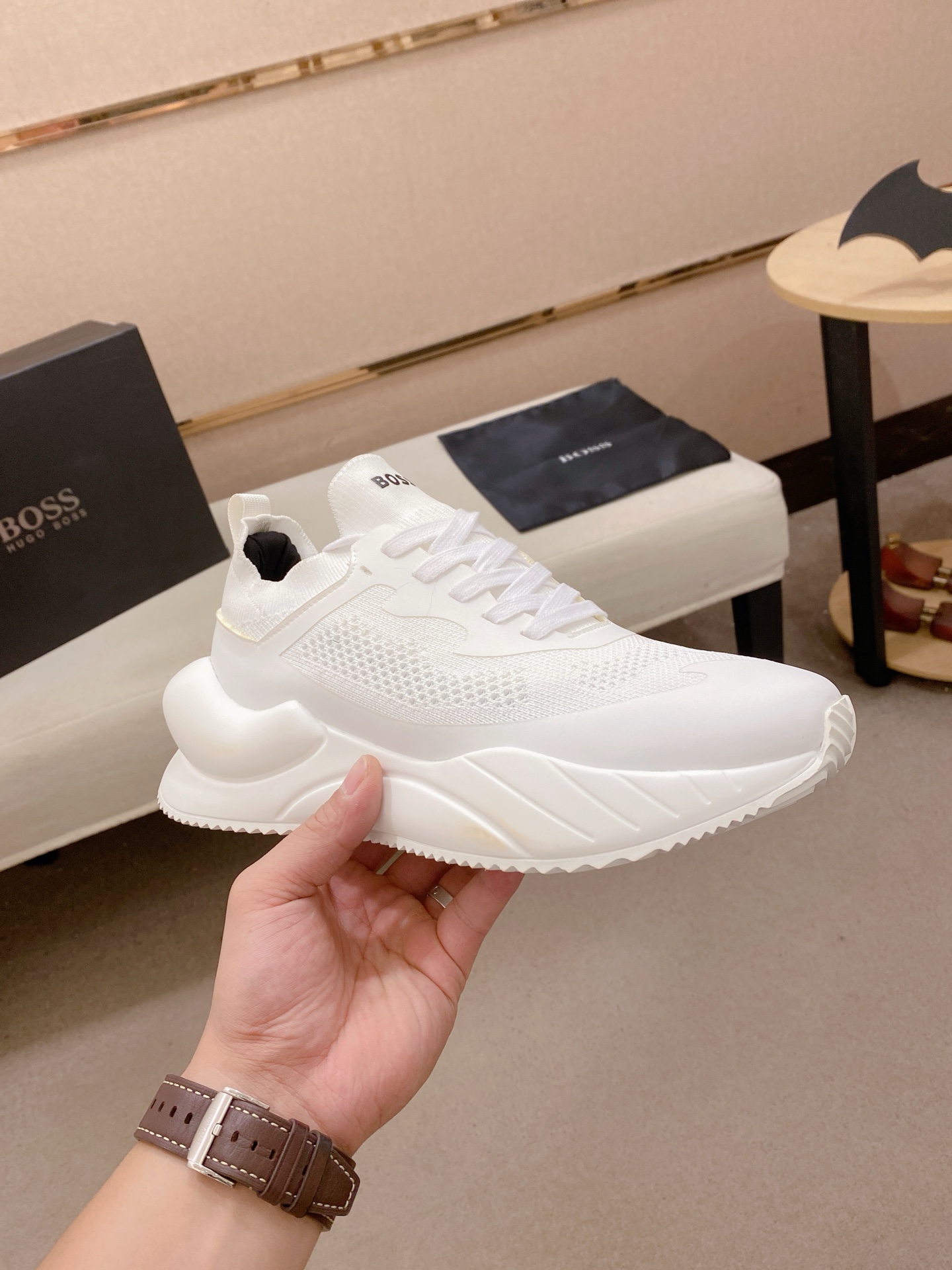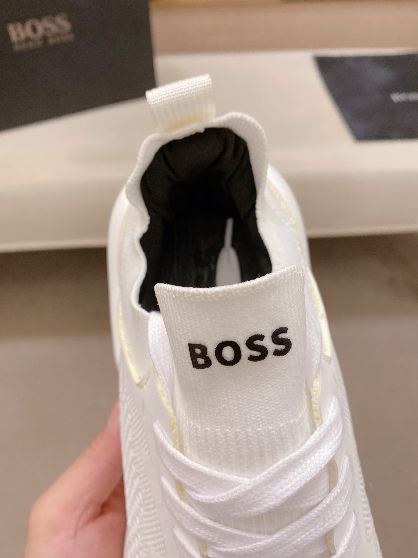 このホグスのメンズスニーカーは、洗練されたホワイトカラーが特徴です。通気性に優れたメッシュ素材を採用し、快適な履き心地を実現しています。厚みのあるミッドソールは、足を包み込むようなクッション性で、長時間の着用でも疲れにくい設計です。また、サイドには「BOSS」のロゴが見え、ブランドの存在感を際立たせています。