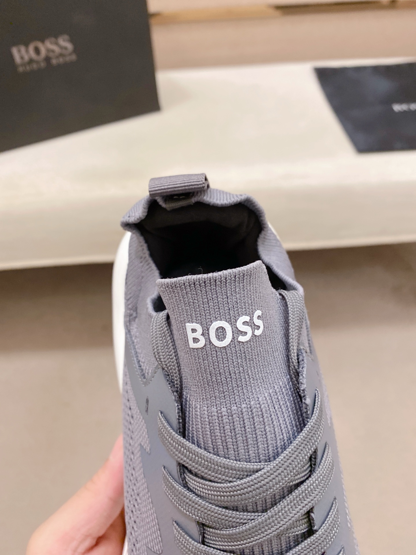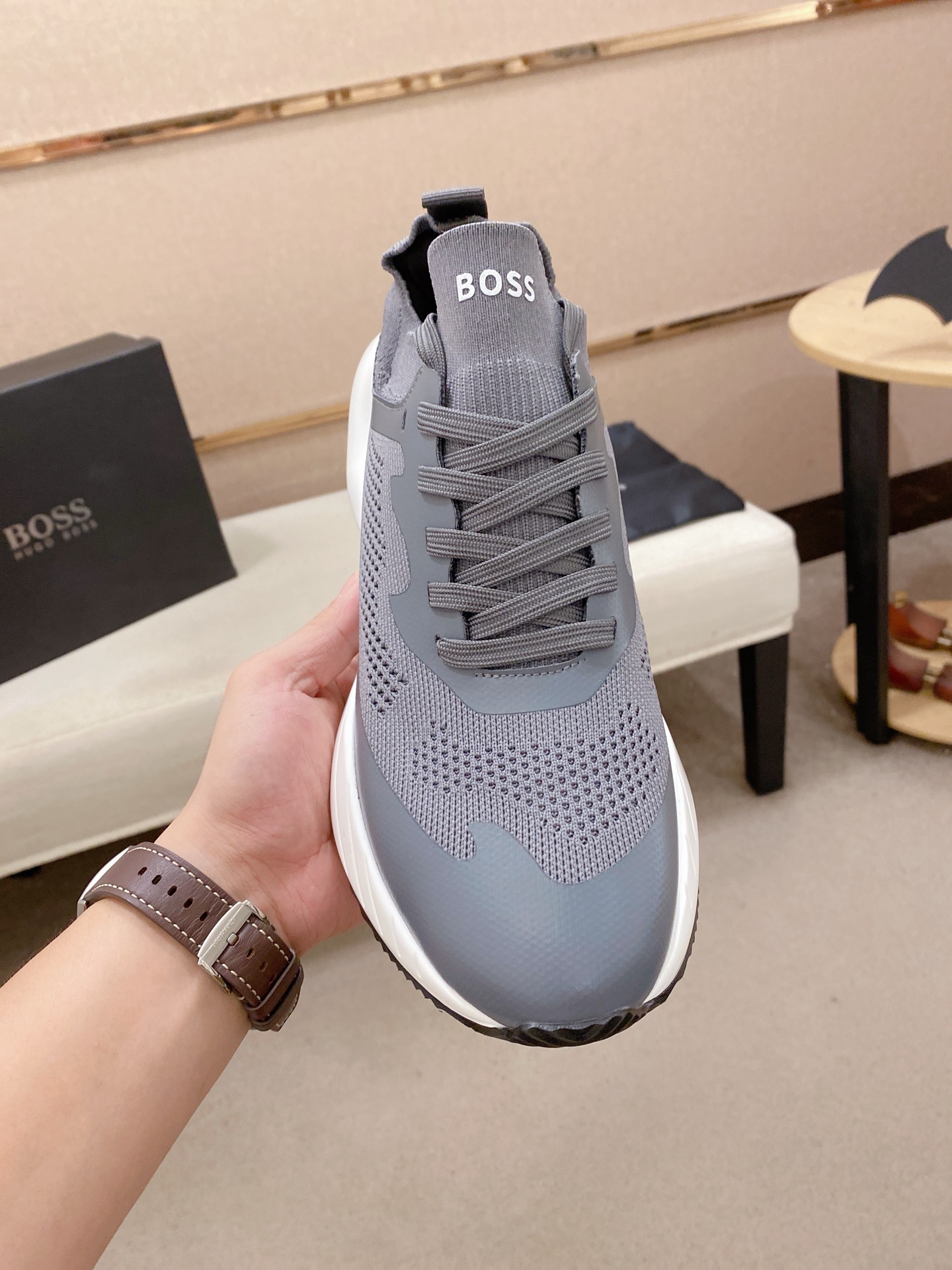 HUGO BOSSのメンズスニーカー、ライトグレーのメッシュ素材が特徴です。通気性に優れ、快適な履き心地を提供します。白とグレーのコントラストが洗練された印象を与え、カジュアルなスタイルに最適です。
