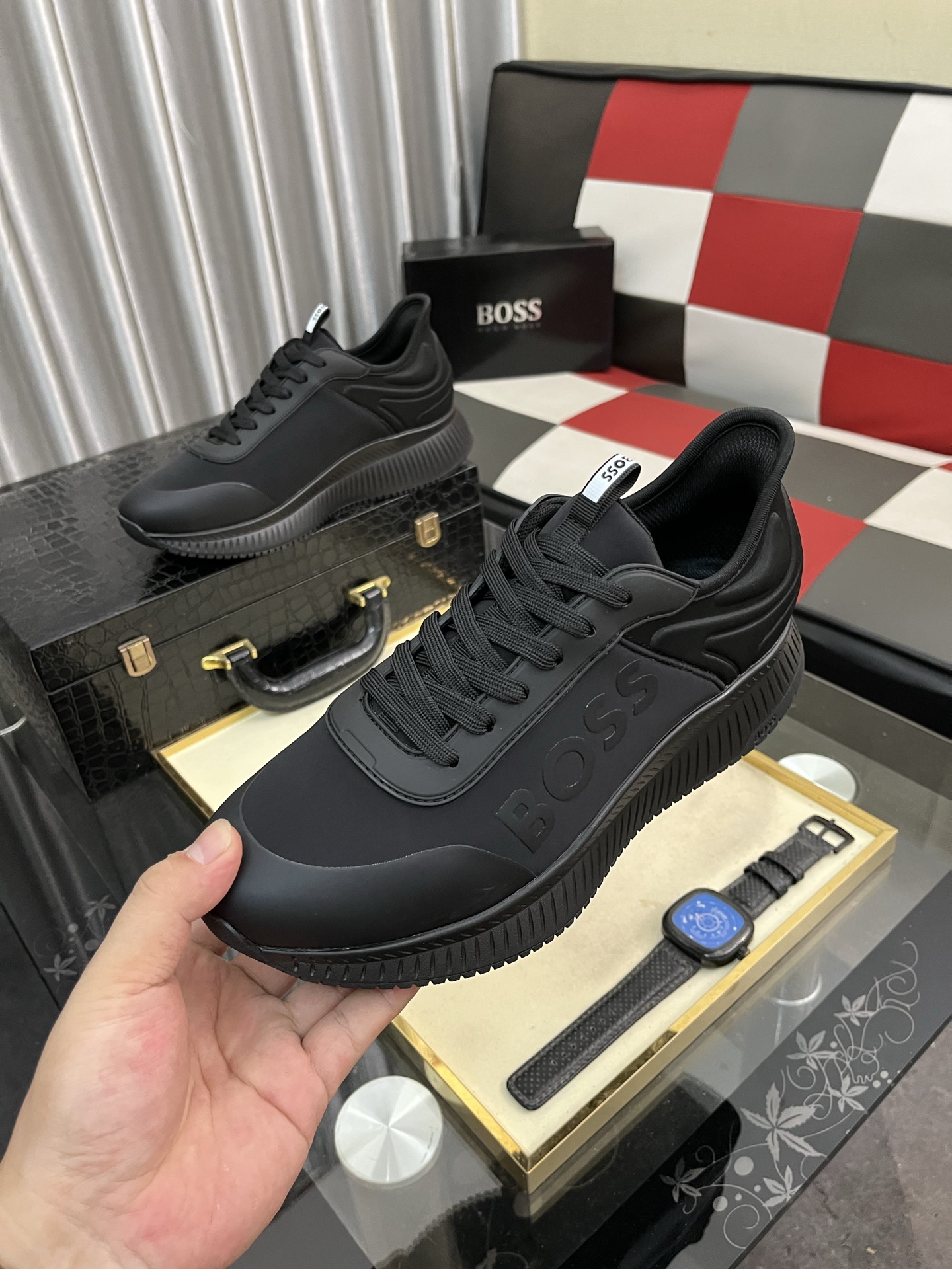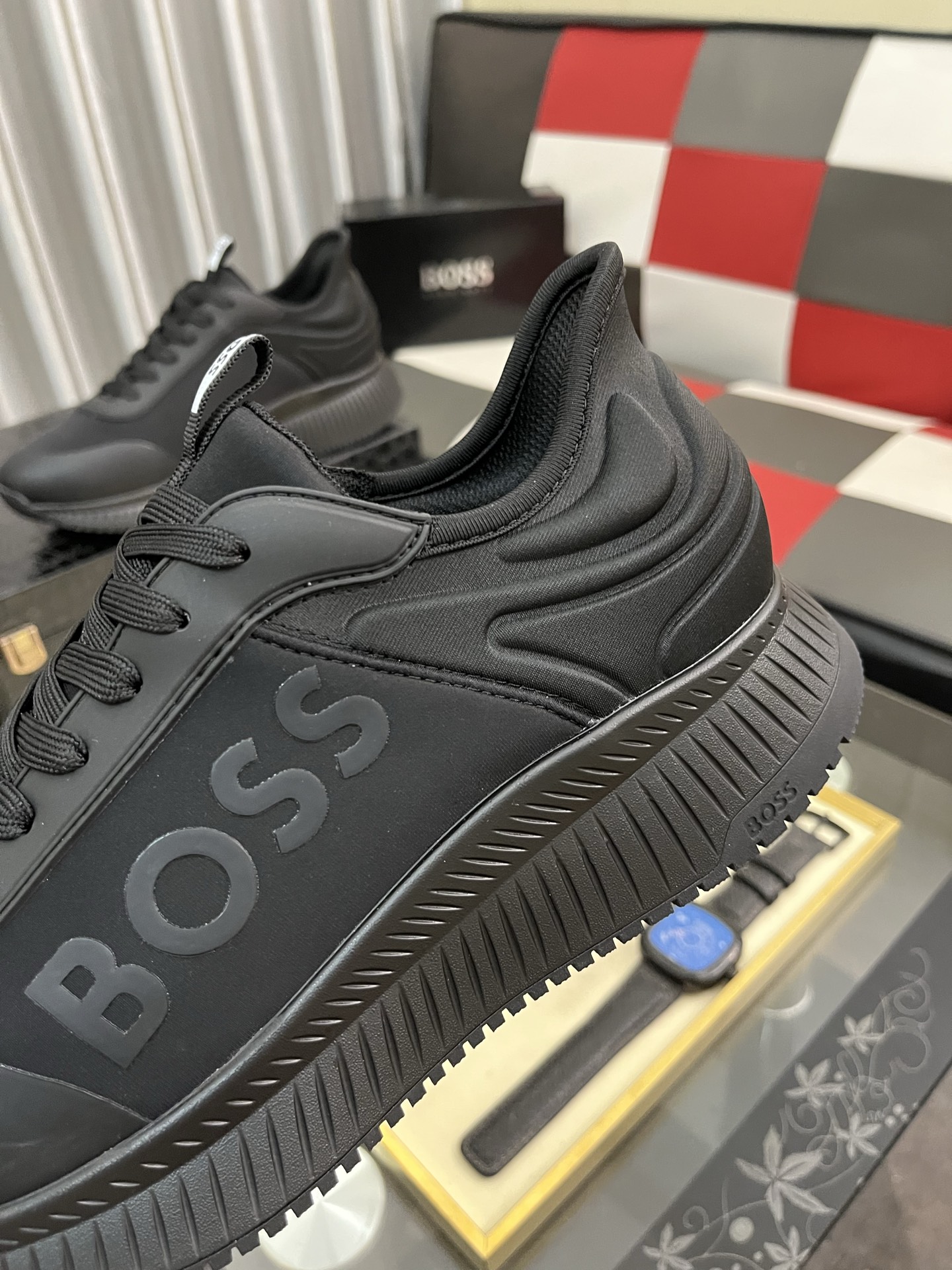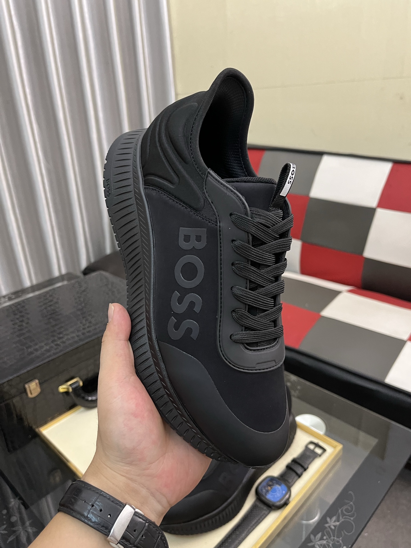 このBOSSのメンズスニーカーは、洗練された黒色のデザインが特徴です。高品質な素材を使用しており、快適な履き心地を提供します。靴のサイドには「BOSS」のロゴが大きくプリントされており、ブランドのアイデンティティを強調しています。また、履き口には「BOSS」のロゴが入ったタグがあり、細部までこだわりが感じられます。ソールは耐久性があり、滑りにくいデザインになっており、日常のさまざまなシーンで安心して履くことができます。
