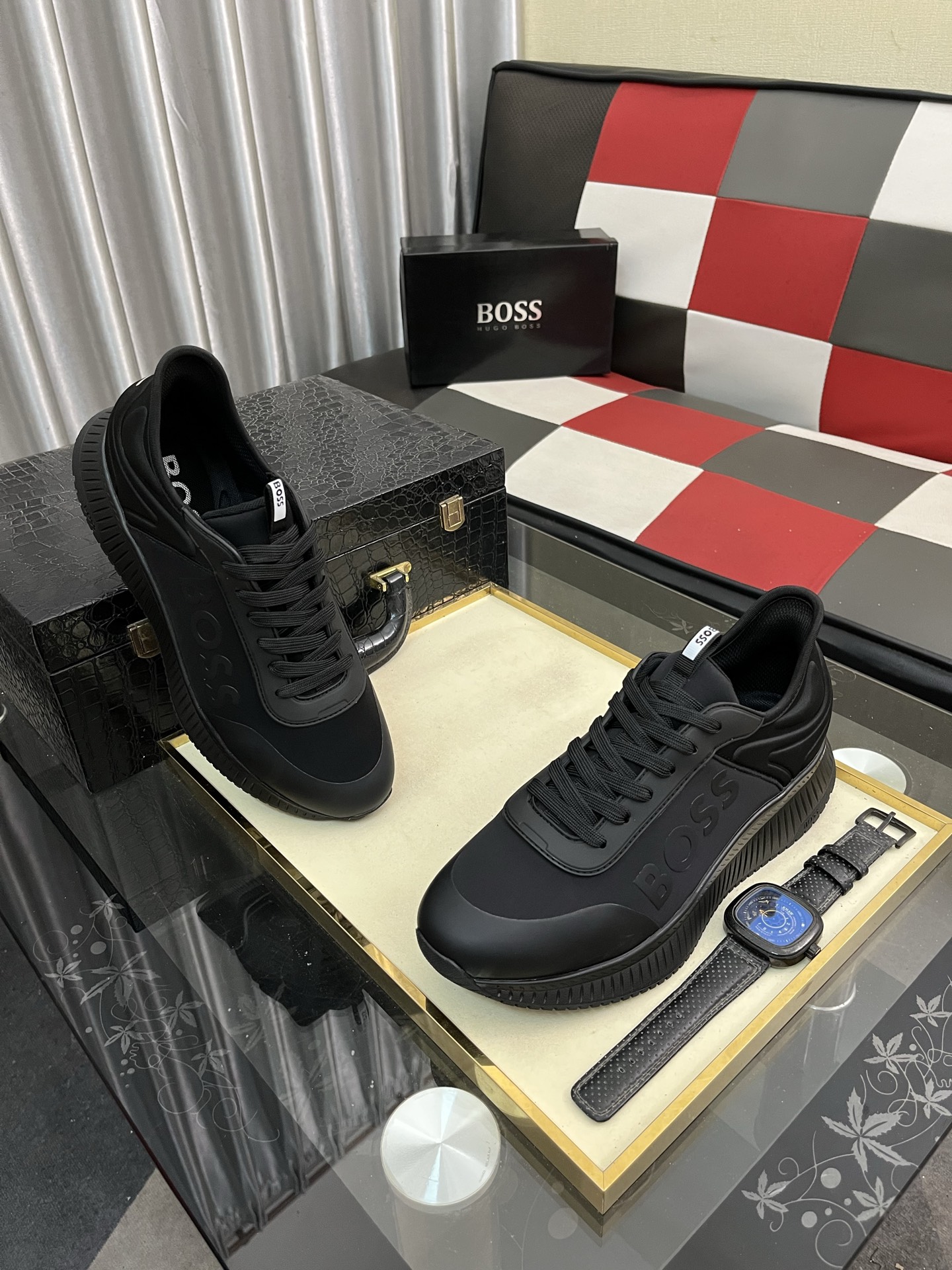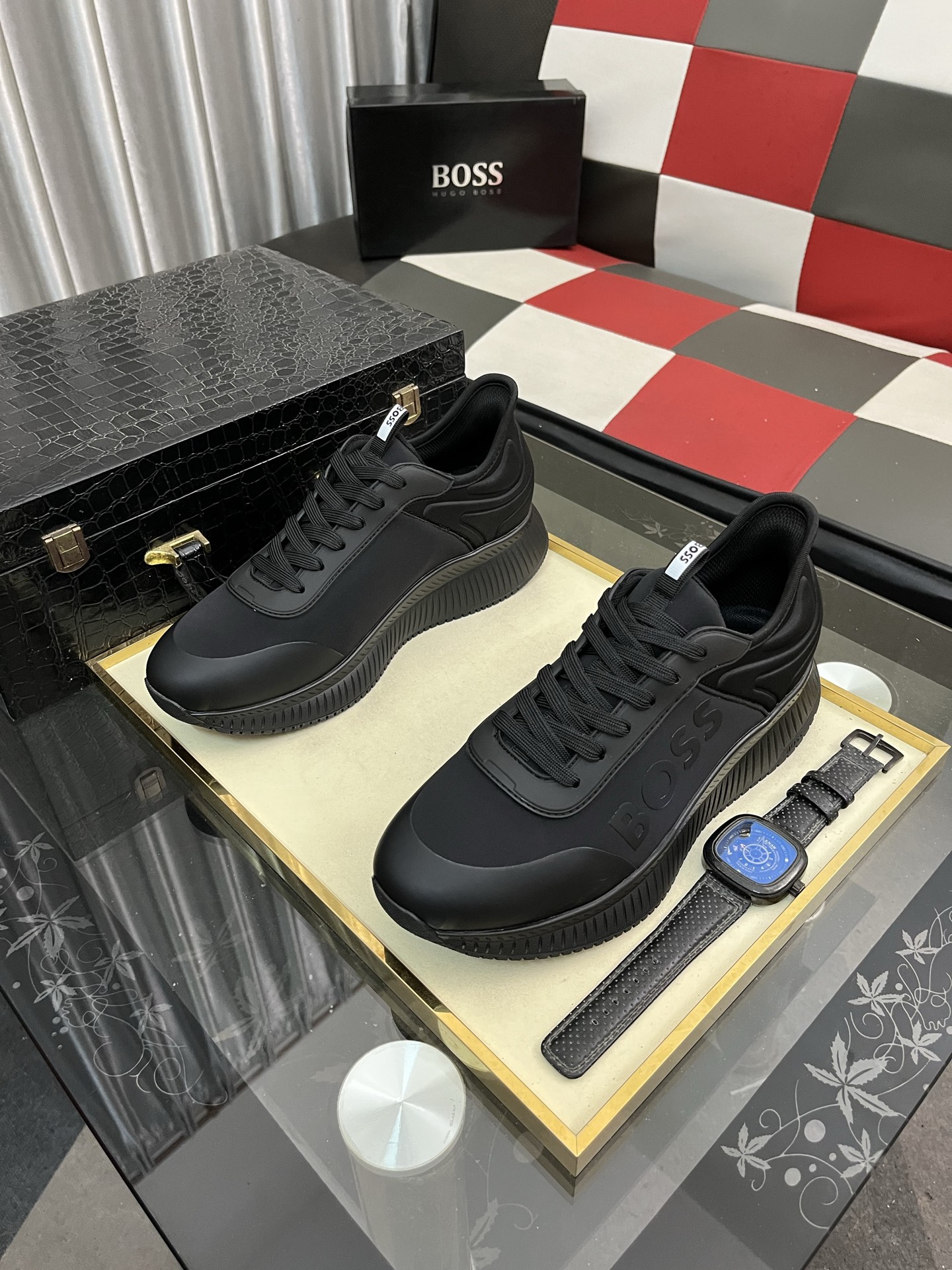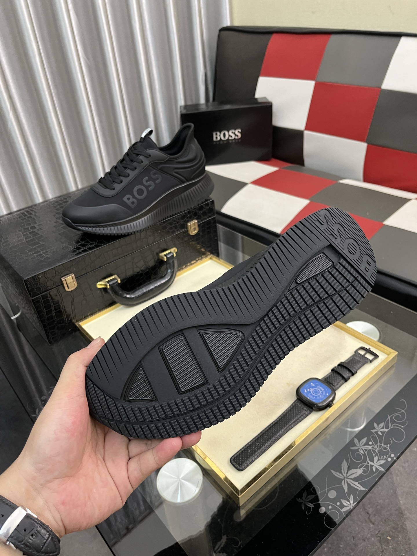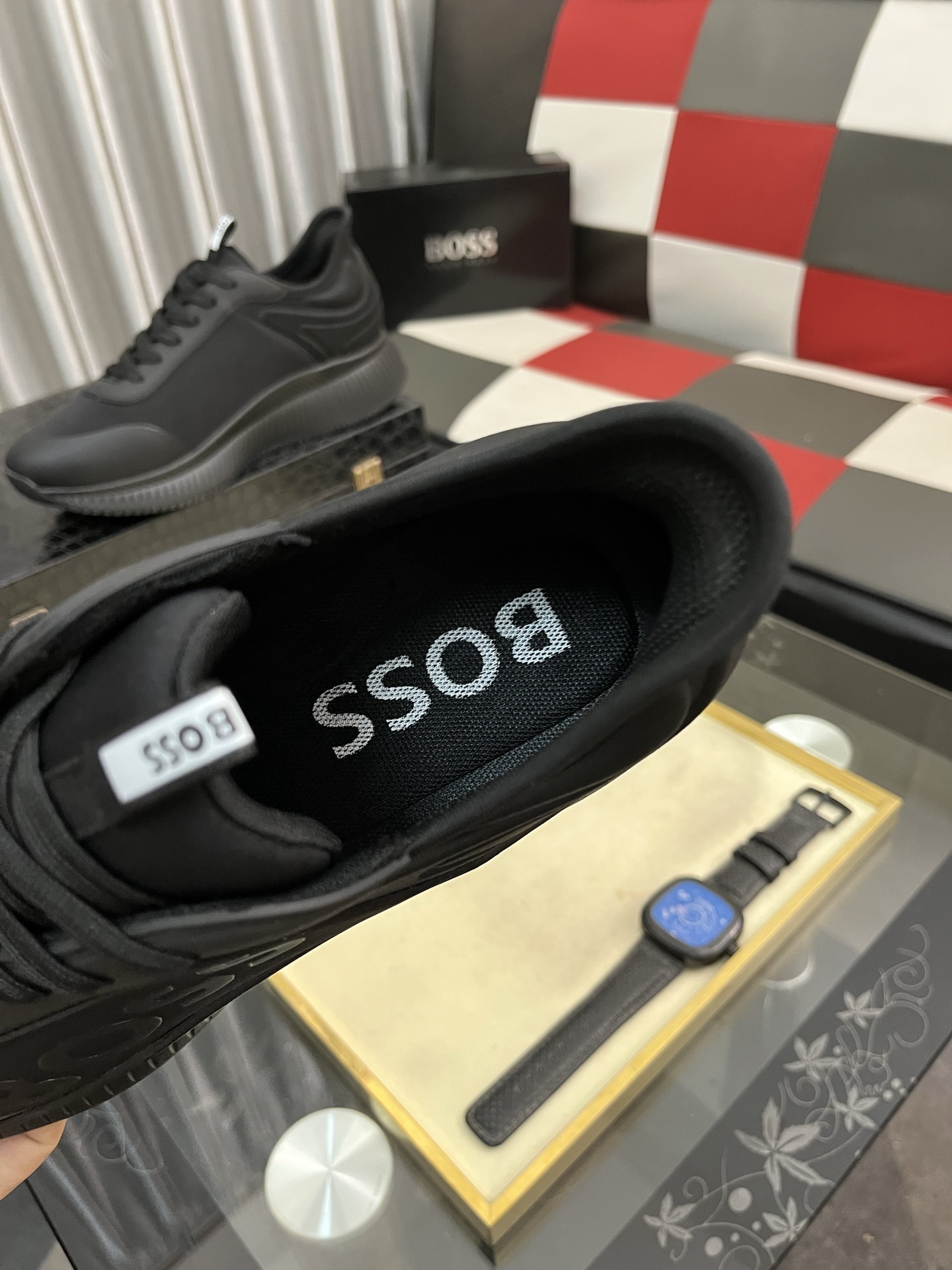 このBOSSのメンズスニーカーは、洗練された黒色のデザインが特徴です。高品質な素材を使用しており、快適な履き心地を提供します。靴のサイドには「BOSS」のロゴが大きくプリントされており、ブランドのアイデンティティを強調しています。また、履き口には「BOSS」のロゴが入ったタグがあり、細部までこだわりが感じられます。ソールは耐久性があり、滑りにくいデザインになっており、日常のさまざまなシーンで安心して履くことができます。