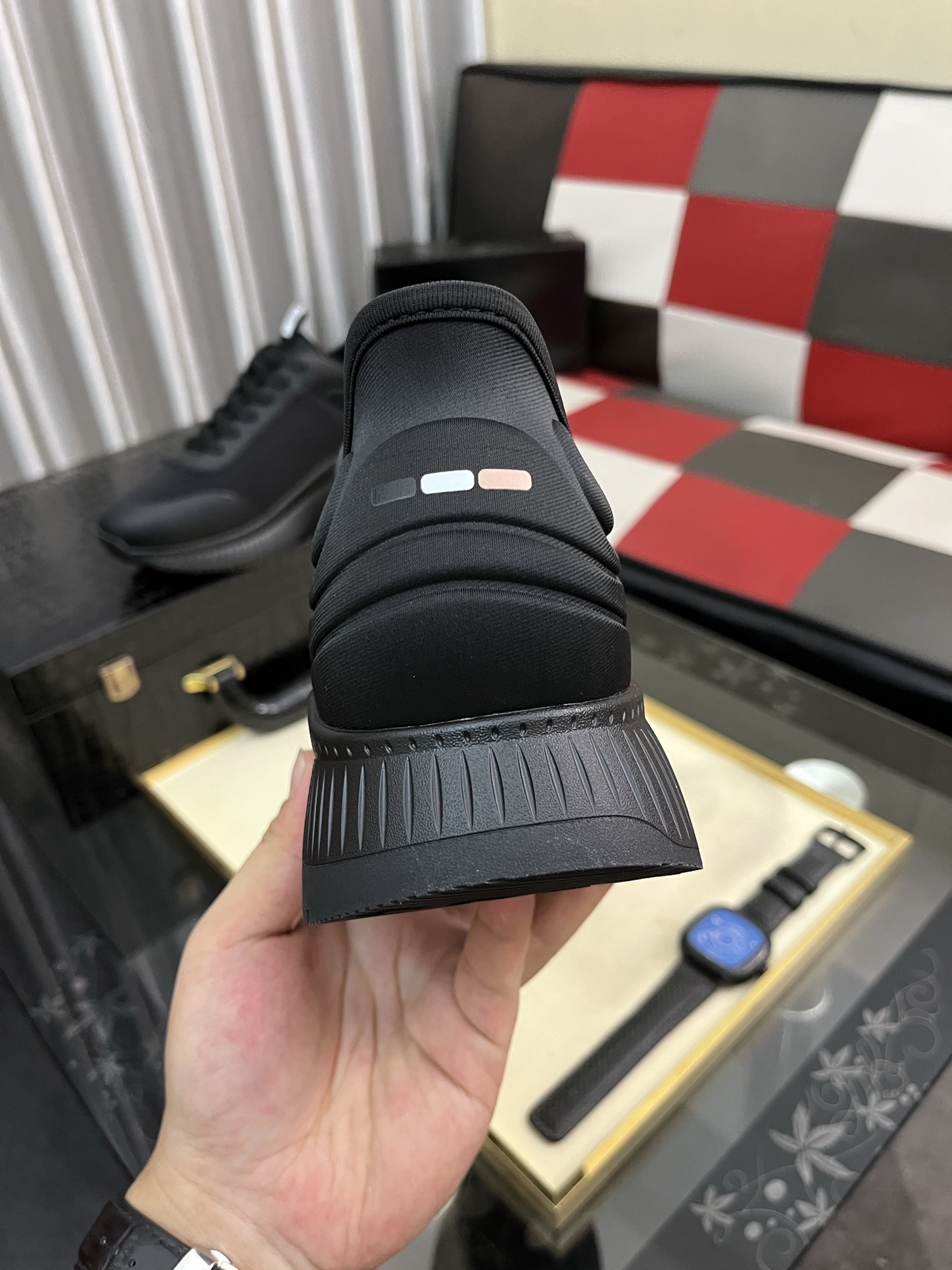 このスニーカーの独特な点は、シンプルながらも洗練されたデザインと、機能性の高さです。黒色の統一感と、足元を引き立てるロゴの配置が、上品さとモダンさを兼ね備えています。また、ソールのデザインは、歩行時の安定性とグリップ力を