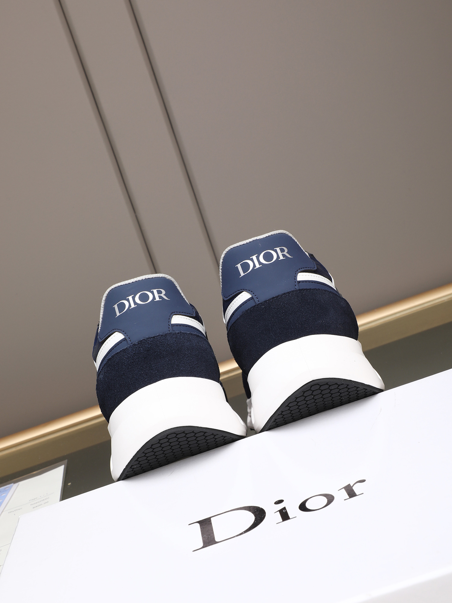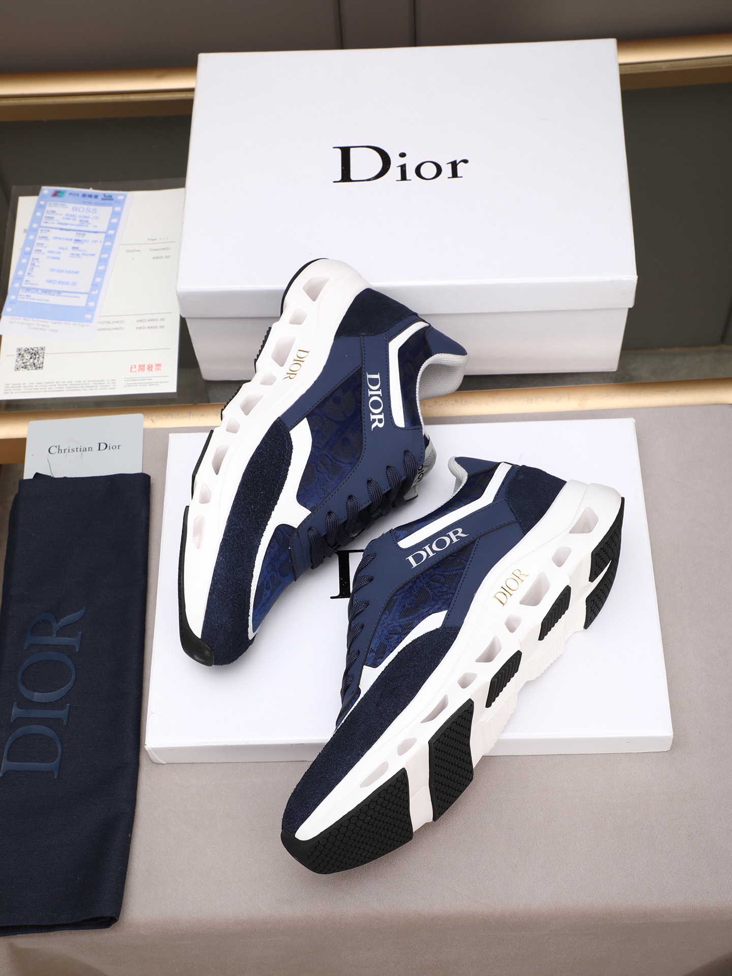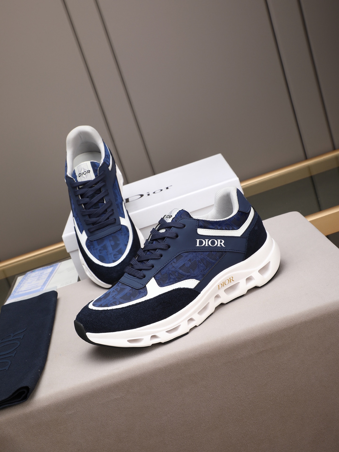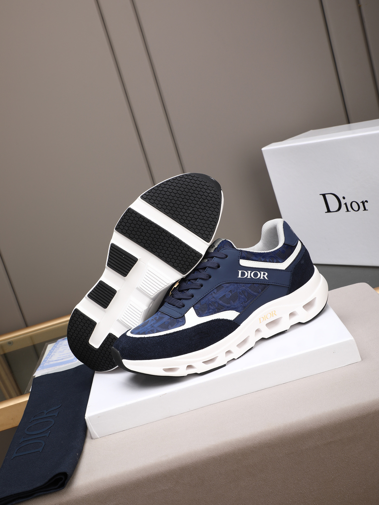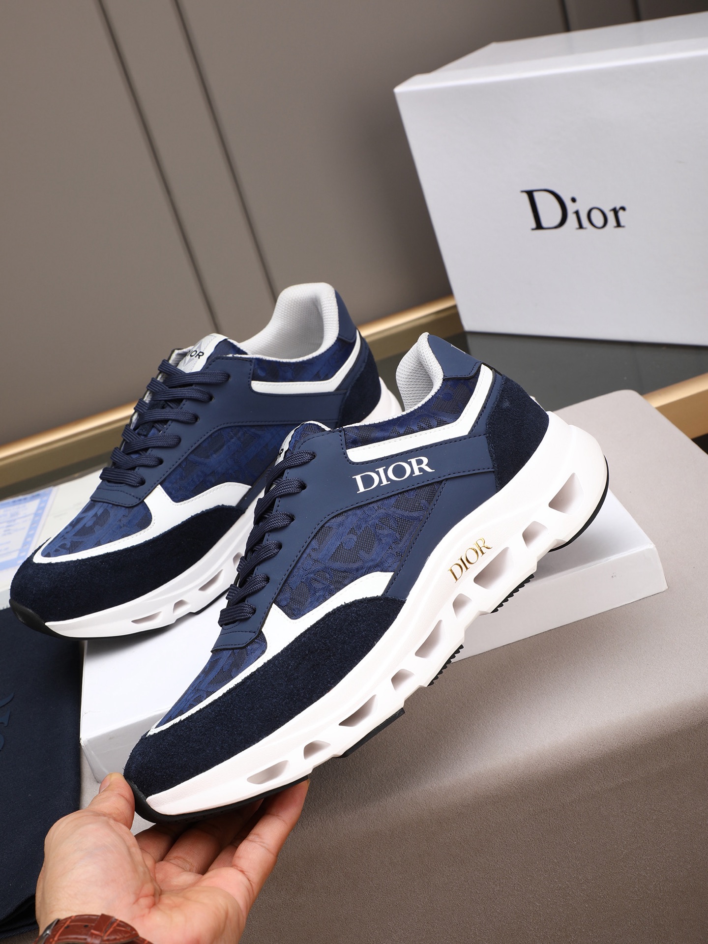 ディオールのメンズスニーカー、ブルーカラー。高品質な素材を使用したスポーツシューズです。デザインは、深みのあるブルーのアッパーに、白とネイビーのアクセントが施され、洗練された印象を与えます。アッパーには高級感のあるレザーとスエードが組み合わされ、快適な履き心地を実現しています。また、厚めのホワイトソールには通気性の良いホールが設けられており、長時間の着用でも疲れにくい設計です。シューズのサイドにはゴールドの「DIOR」ロゴが映え、ブランドの存在感を際立たせています。このスニーカーは、普段使いからちょっとしたお出かけまで、さまざまなシーンで活躍します。高級感と機能性を兼ね備えた一足、なぜ試してみないですか?