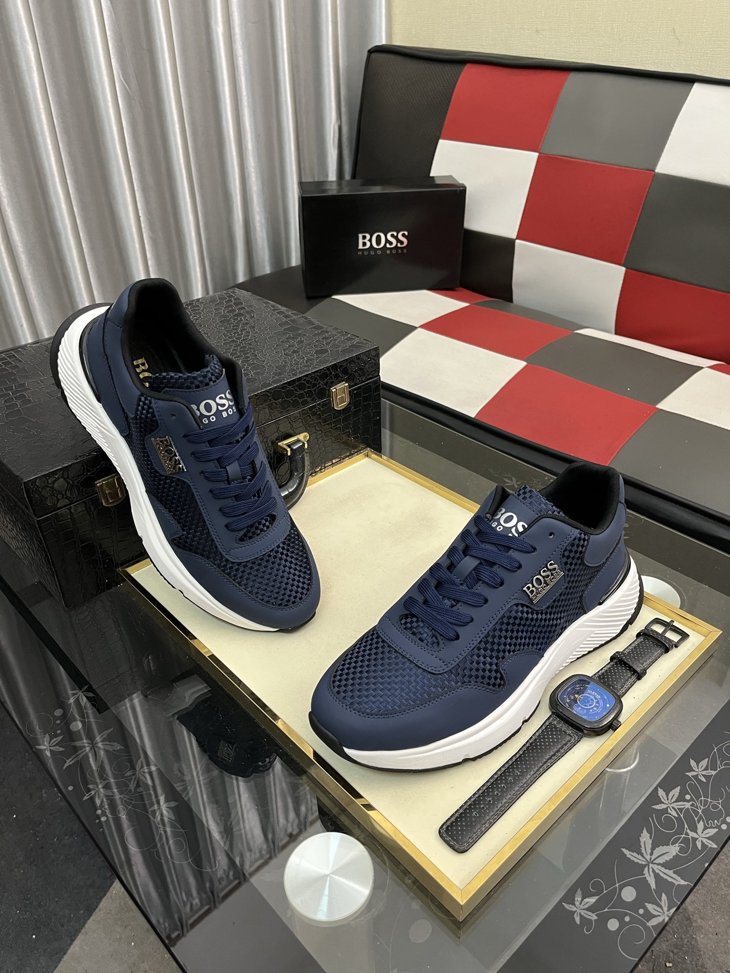 青蓝色のHUGO BOSS メンズスニーカーは、洗練されたデザインと快適な履き心地が特徴です。 breathableなメッシュ素材を使用しており、通気性に優れ、長時間の着用でも足を快適に保ってくれます。また、軽量で柔軟なソールは、歩行やランニング時の衝撃を吸収し、足への負担を軽減します。