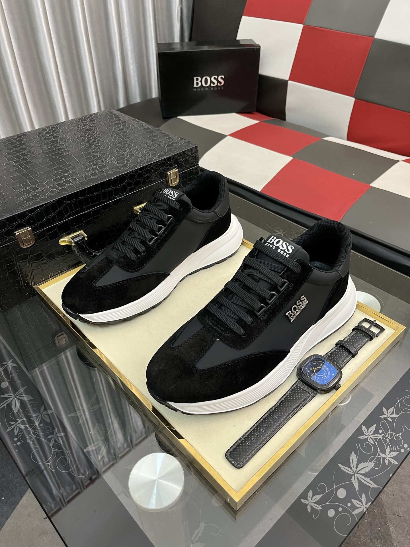 HUGO BOSS メンズスニーカー、黒と白ソールの組み合わせが、シンプルながらも洗練された印象を与えます。