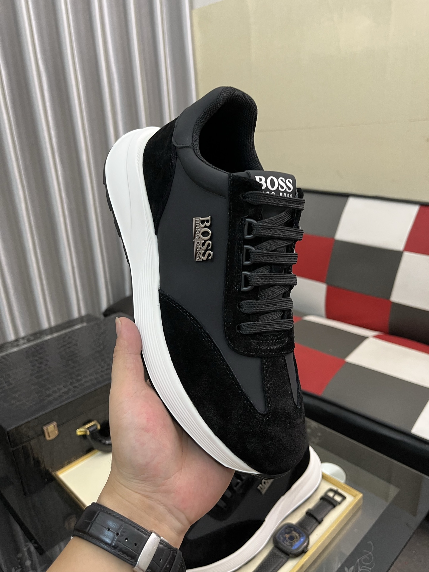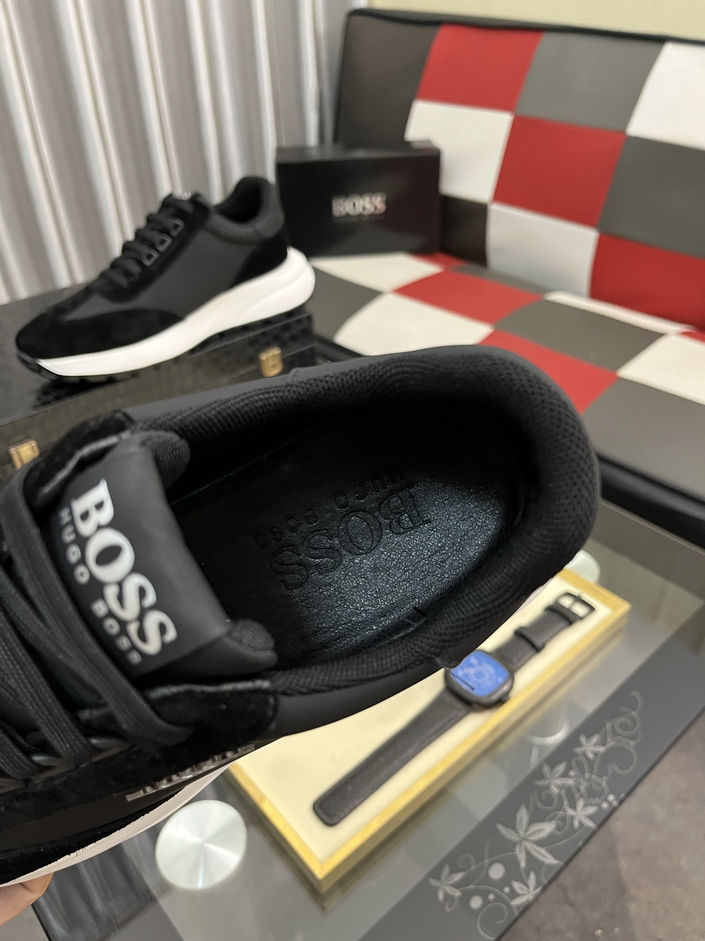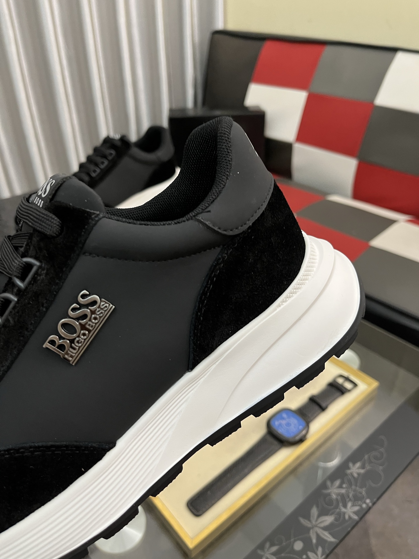 特徴的なのは、白いソールと黒いアッパーのコントラスト。これは、HUGO BOSSらしい洗練されたデザインで、他のブランドとは一線を画します。