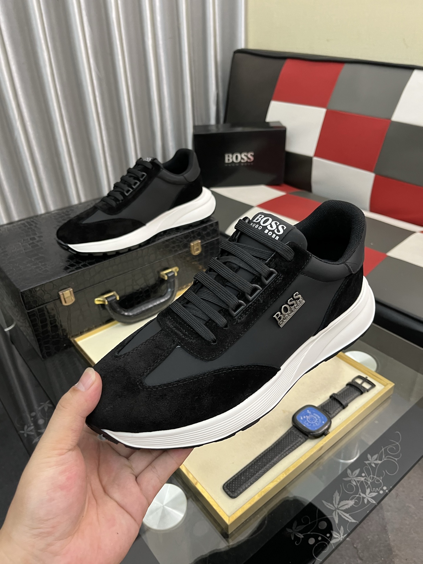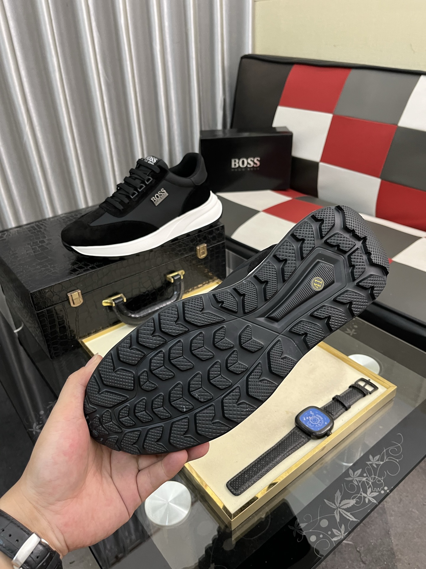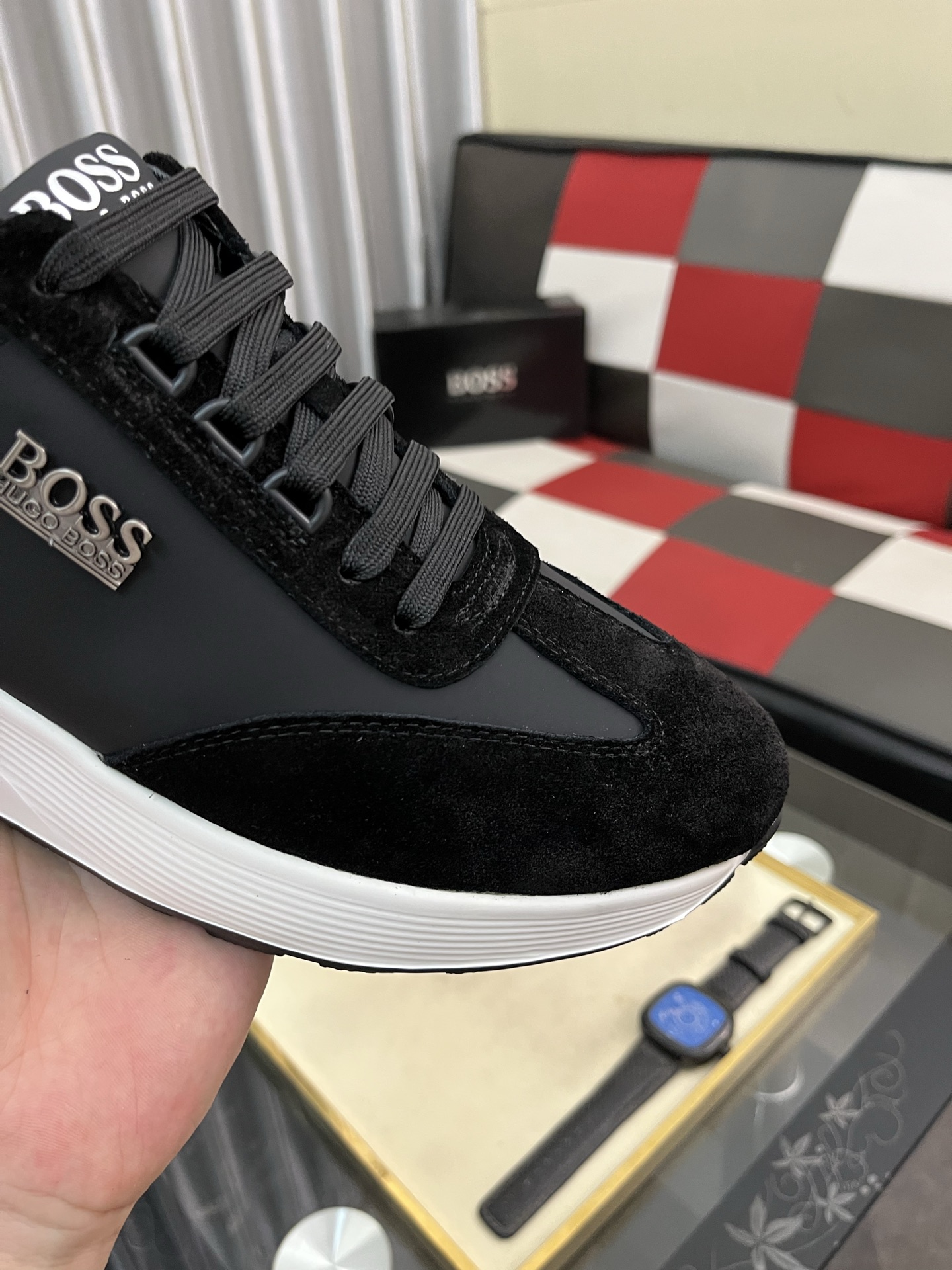 特徴的なのは、白いソールと黒いアッパーのコントラスト。これは、HUGO BOSSらしい洗練されたデザインで、他のブランドとは一線を画します。